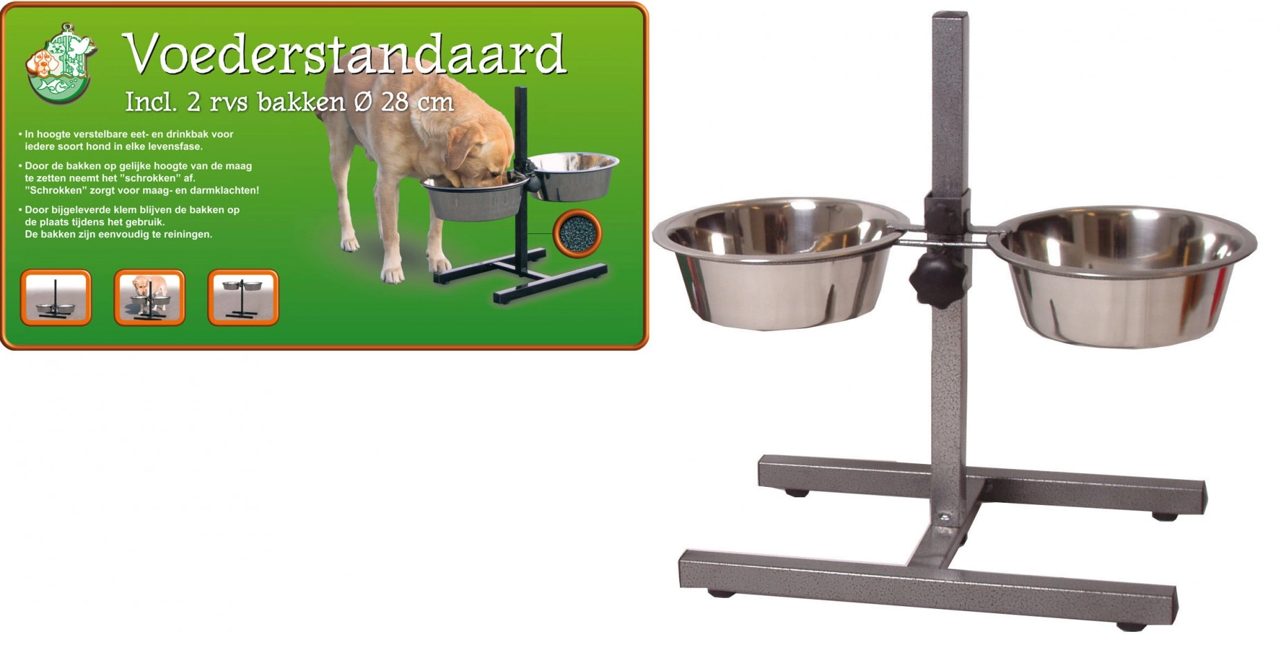 Voederstandaards voor iedere soort hond in elke levensfase. Deze handige verstelbare dubbele voerbakken zorgen ervoor dat jouw hond in de meest natuurlijke stand en houding eet en drinkt. De r.v.s. voerbakken zijn op de juiste hoogte te stellen (gelijke hoogte van de maag) middels de bijpassende hamerslag standaard. Eten in de normale rechtopstaande houding van de hond bevordert de spijsvertering en laat de hond in een meer ontspannen houding zijn voeding tot zich nemen. Door de bakken op gelijke hoogte van de maag te zetten neemt het ‘schrokken’ af. ‘Schrokken zorgt voor maag- en darmklachten!