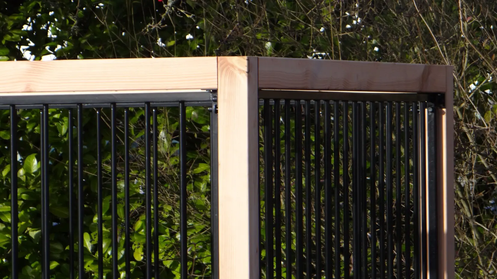 Tussen staander voor een houten kader rond de hondenkennel. De staander is van douglas.