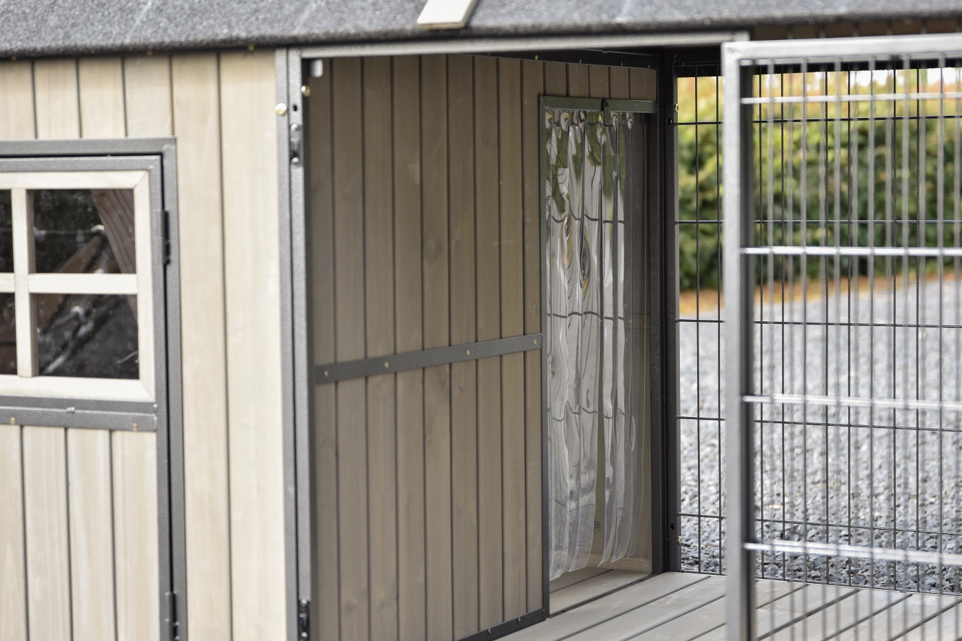 • Dierenhok van dennenhout met stevig, gecoat stalen frame en zwart gaas