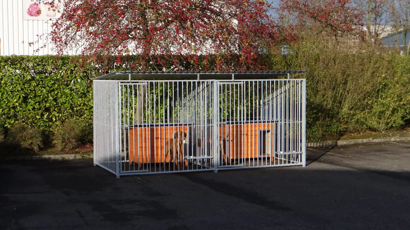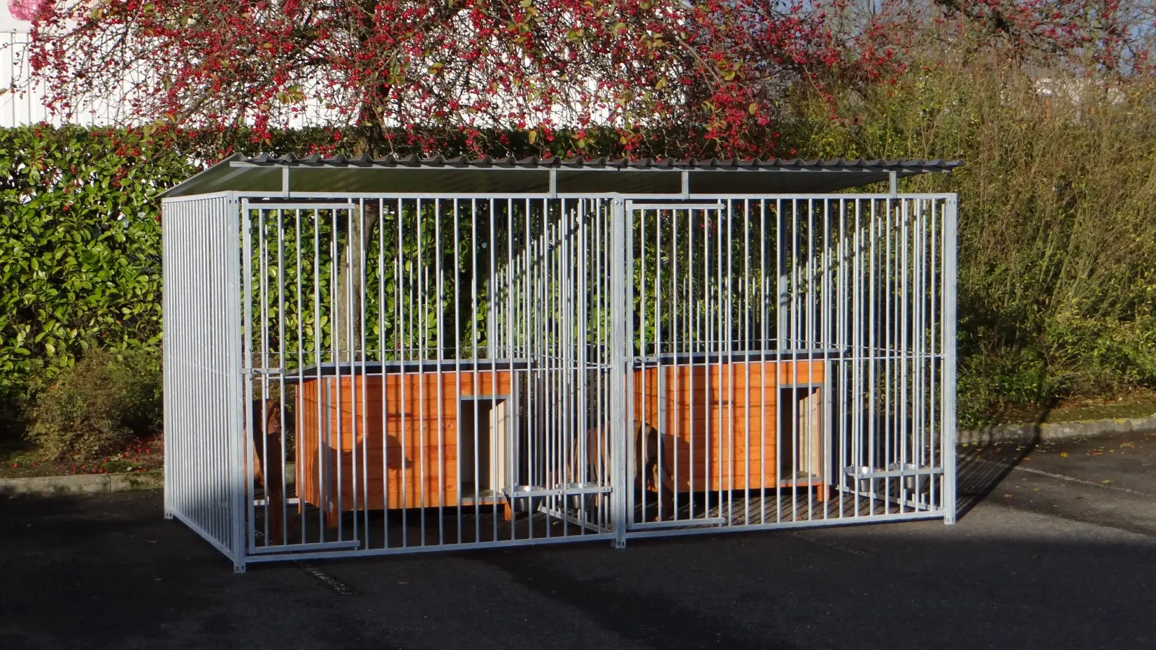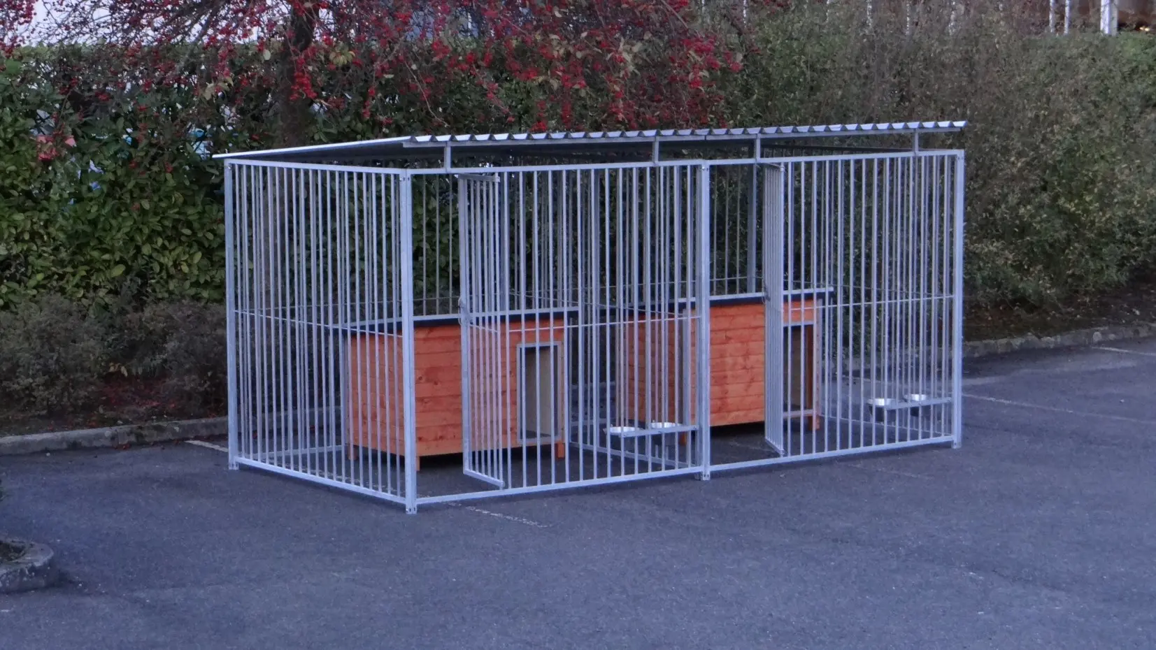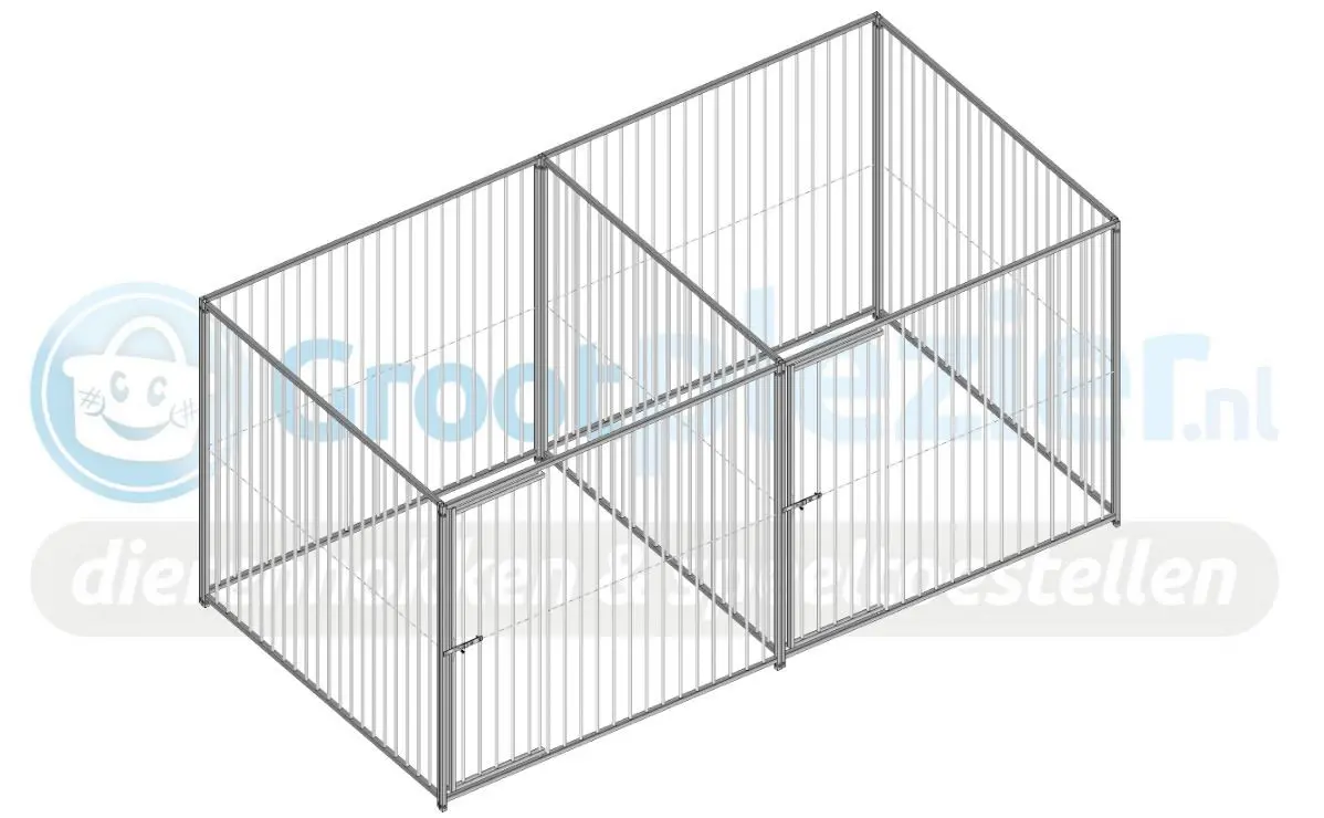 Deze dubbele hondenkennel wordt geleverd incl. 2 nachthokken Base medium, 2 voederstellen en een dak over de gehele kennel. Tussen de 2 kennels zit ook een kennelpaneel met spijlen. Ideaal om 2 grote honden gescheiden te houden. Makkelijke montage. Uitstekende kwaliteit.