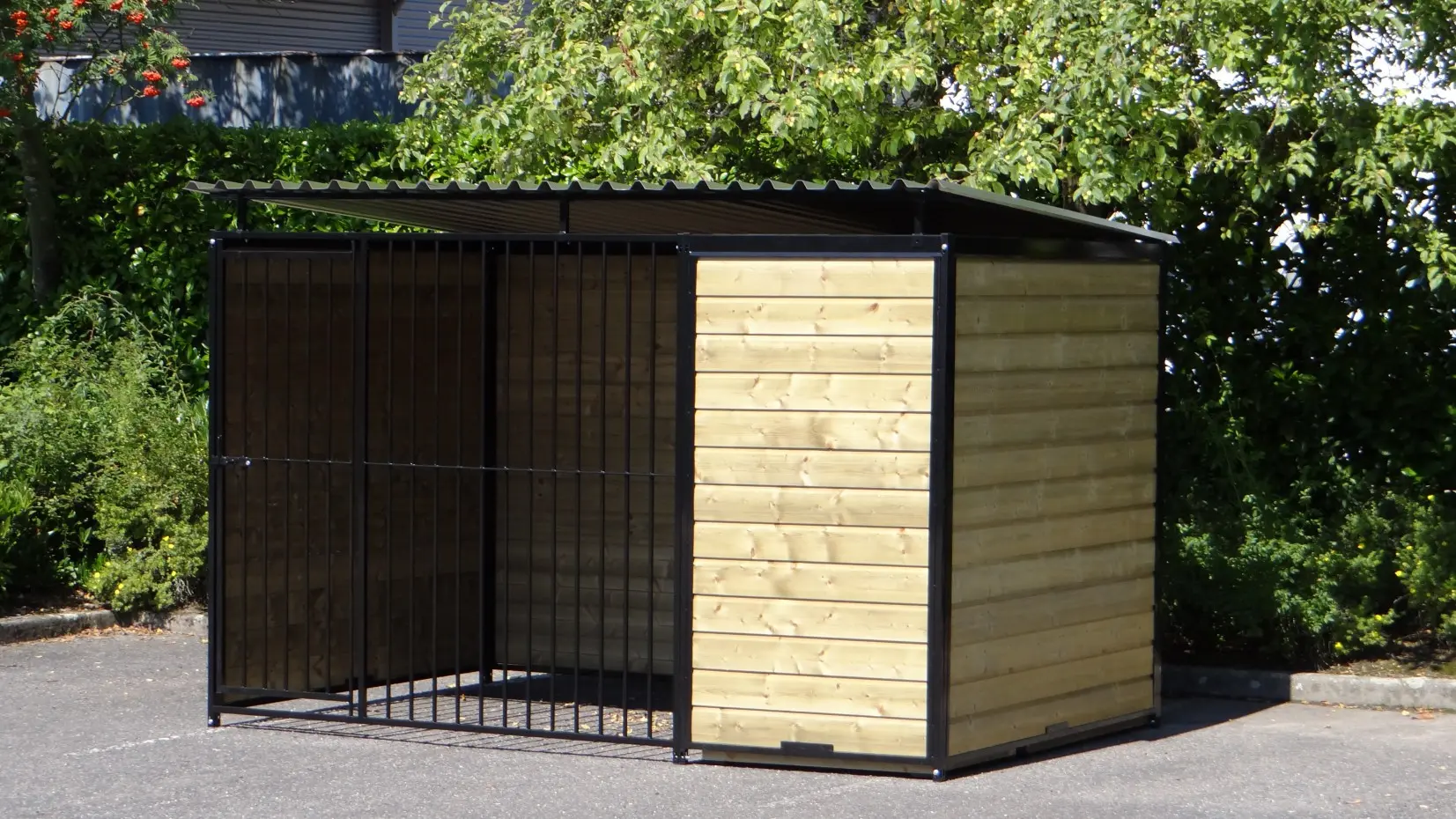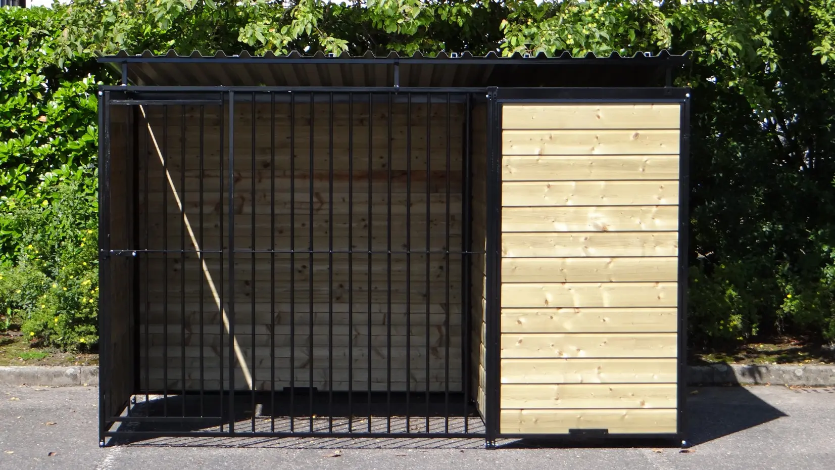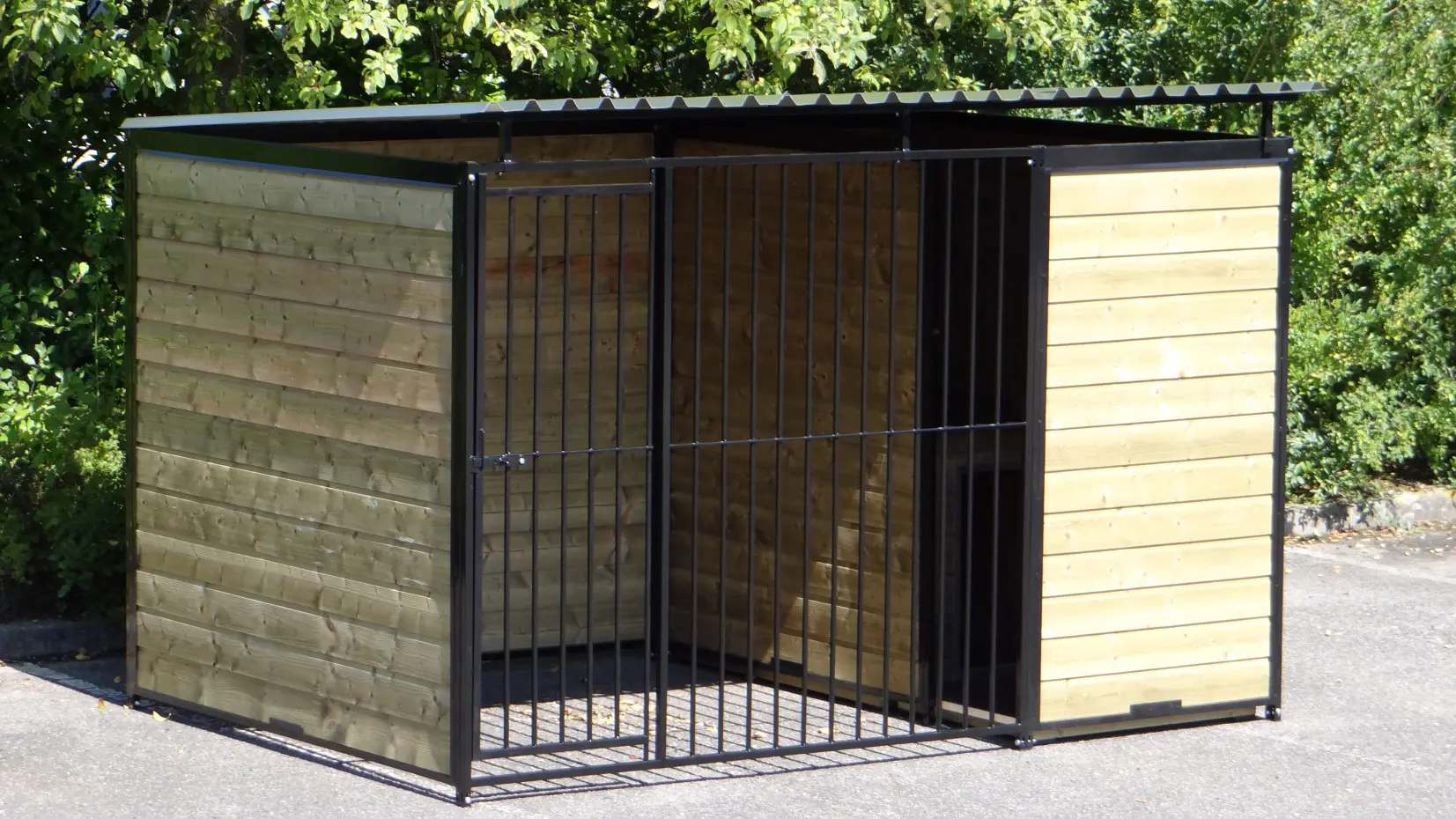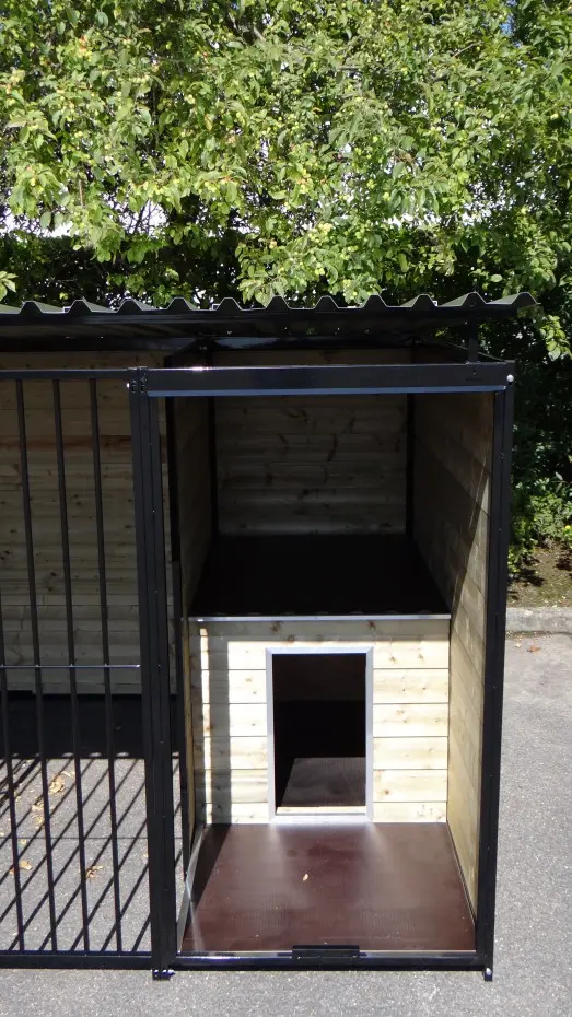 Hondenkennel Forz Zwart met geïsoleerd nachthok en vlonder is een erg chique hondenverblijf. Gepoedercoatte stalen panelen met verduurzaamd vurenhout maken een oerdegelijk verblijf voor grote en kleine honden. Voorzien van een geïsoleerd nachthok met anti slip bodem en scharnier-dak. In het portaaltje voor het nachthok is een prachtig vlondertje gelegd zodat een favoriet lig-plekje voor jouw hond ontstaat.