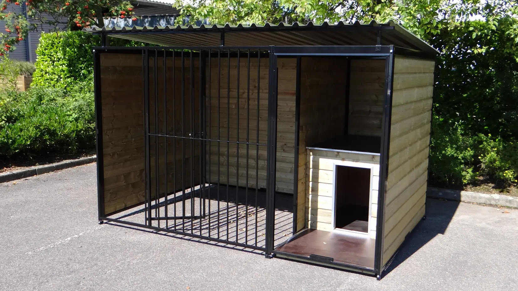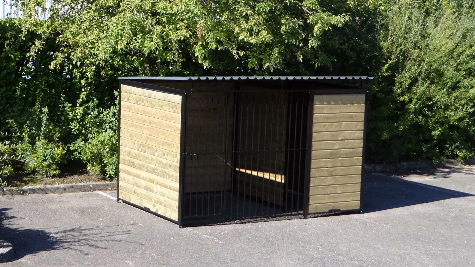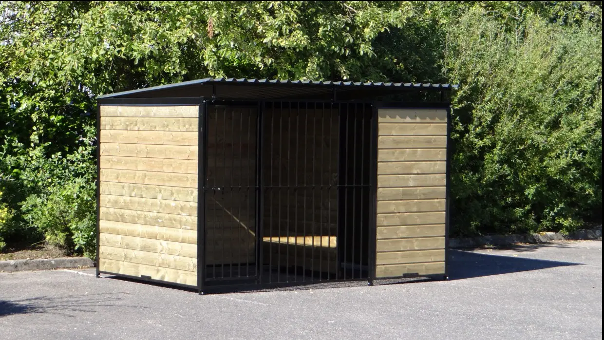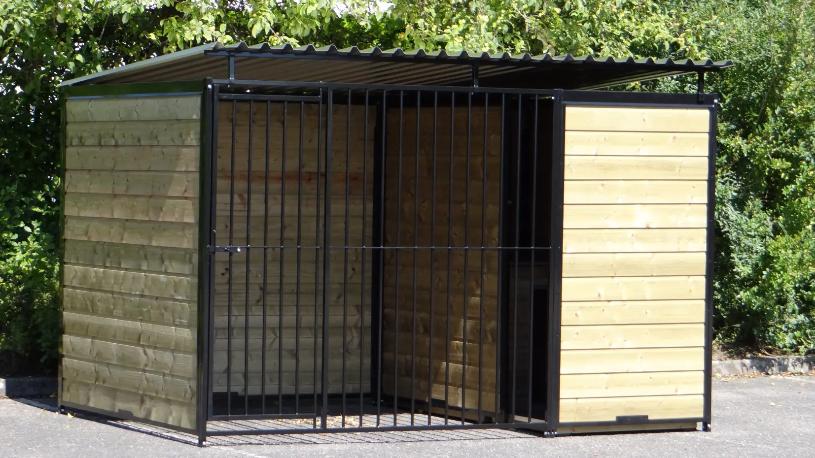 Hondenkennel Forz Zwart met geïsoleerd nachthok en vlonder is een erg chique hondenverblijf. Gepoedercoatte stalen panelen met verduurzaamd vurenhout maken een oerdegelijk verblijf voor grote en kleine honden. Voorzien van een geïsoleerd nachthok met anti slip bodem en scharnier-dak. In het portaaltje voor het nachthok is een prachtig vlondertje gelegd zodat een favoriet lig-plekje voor jouw hond ontstaat.
