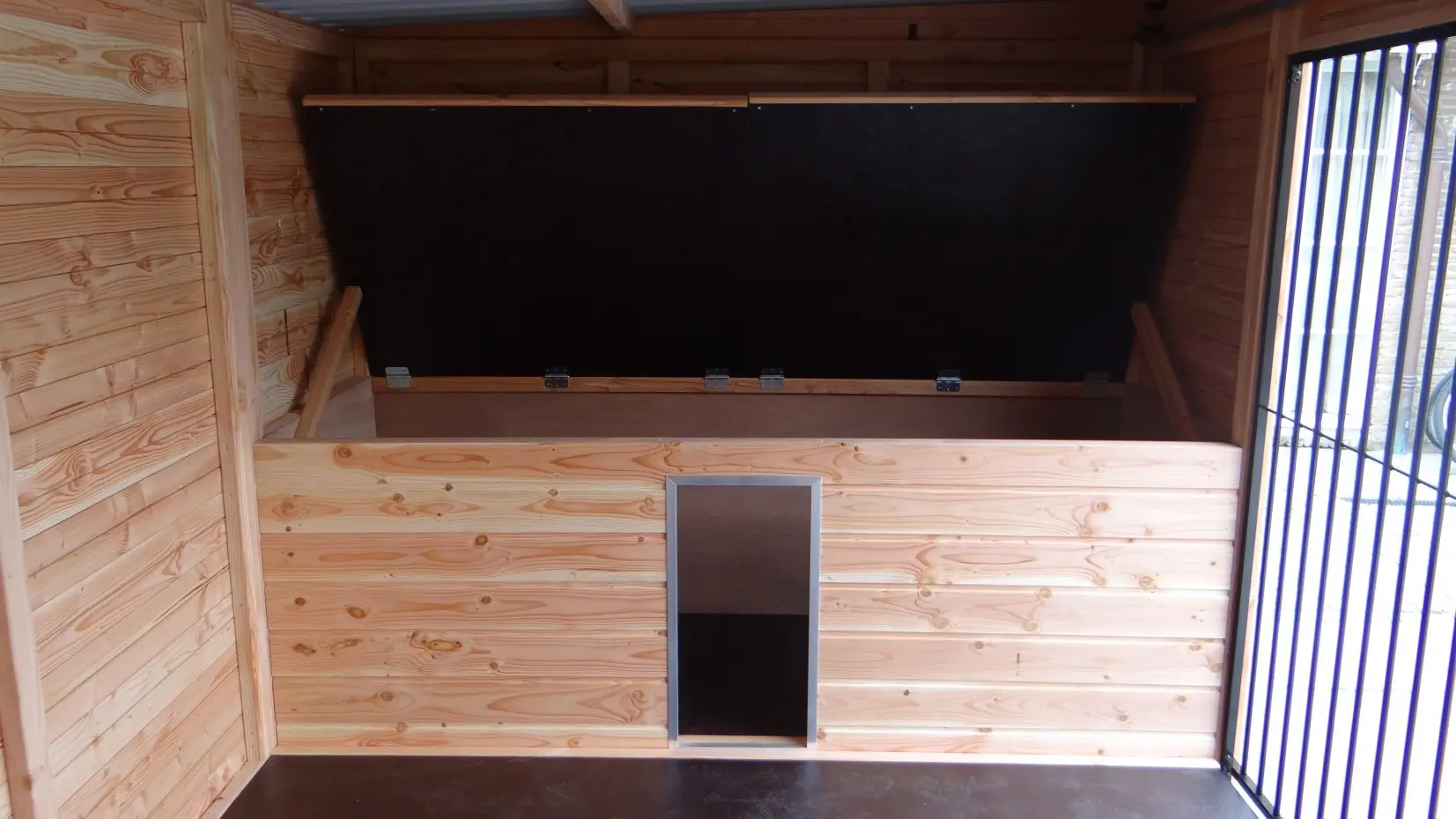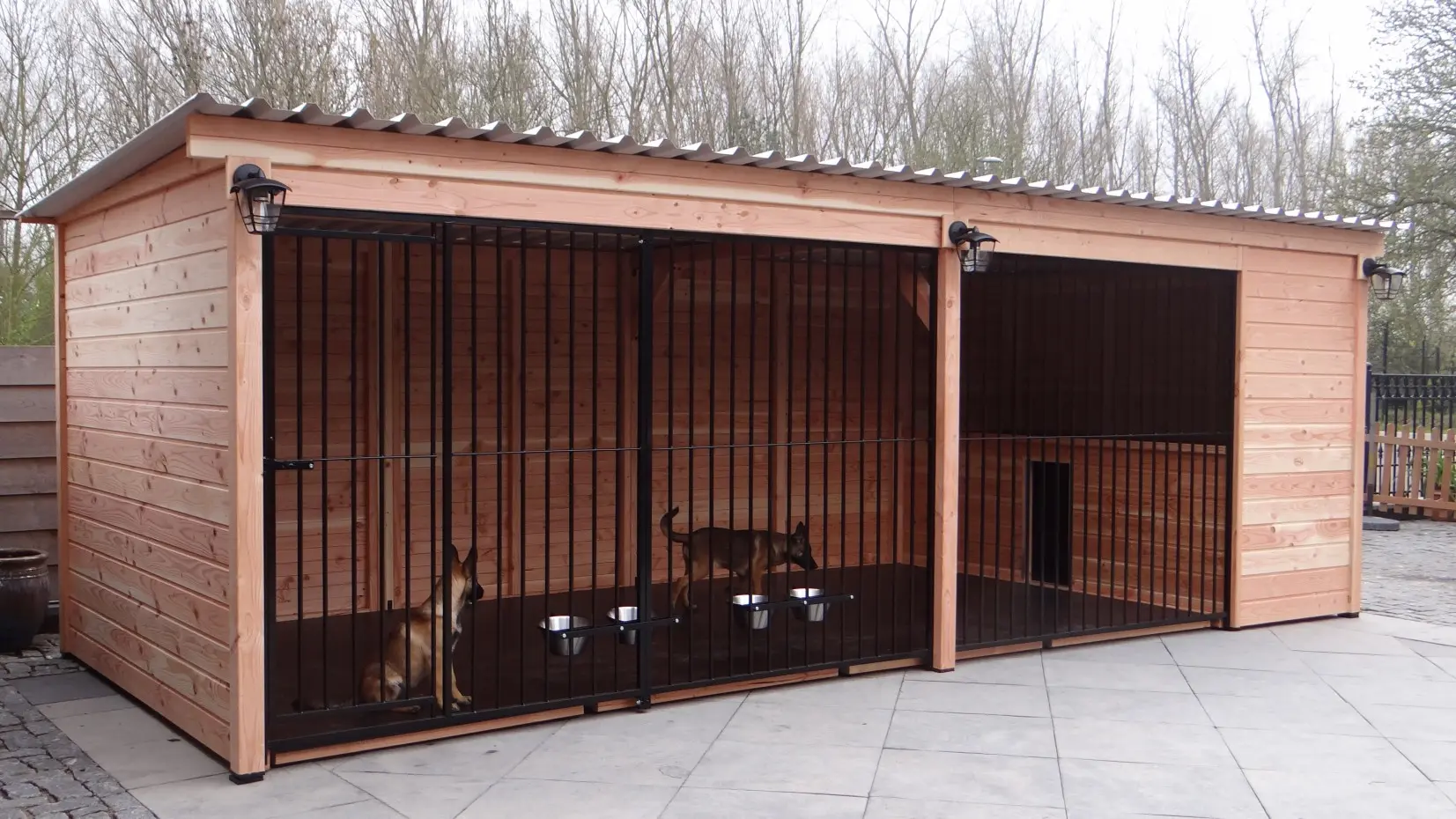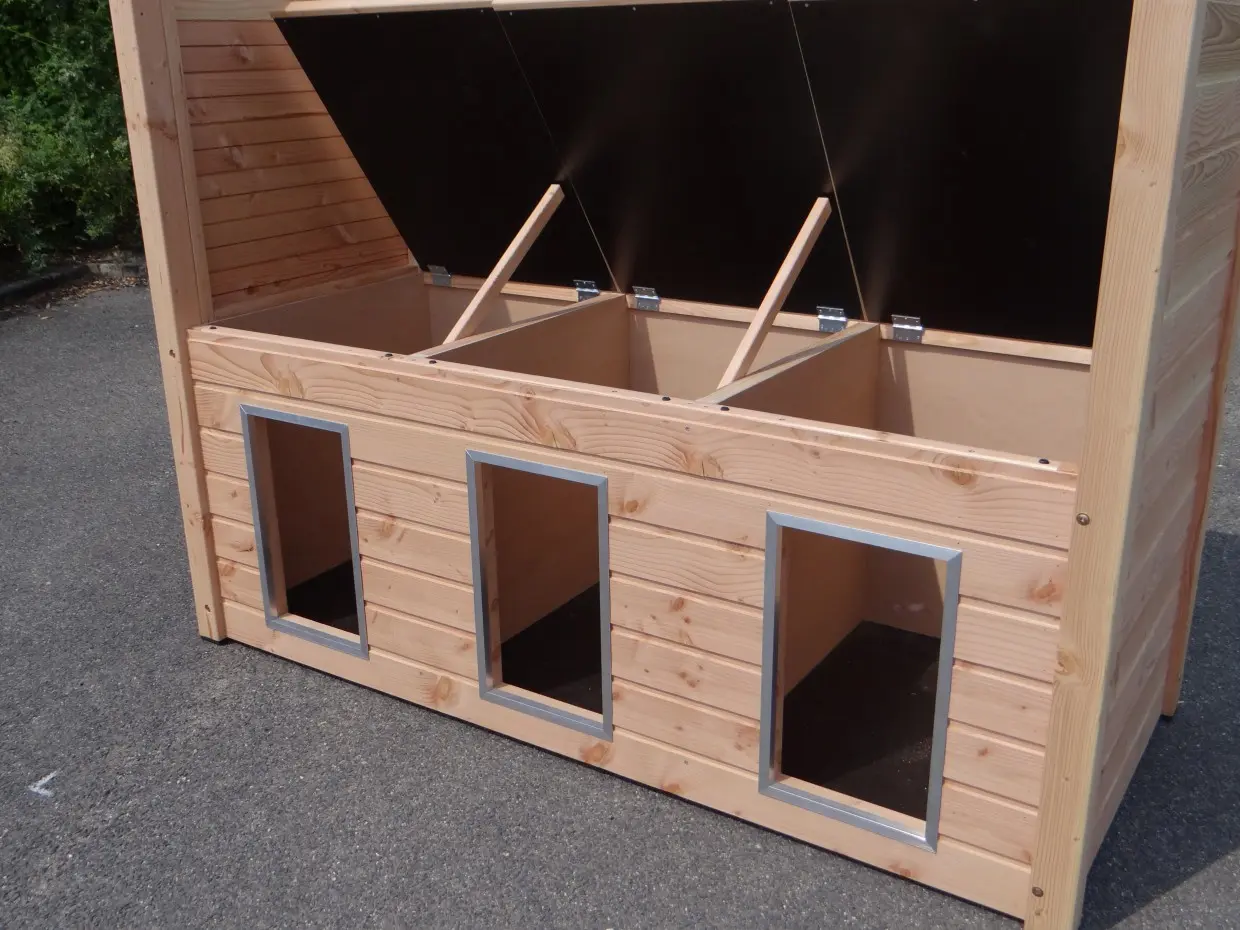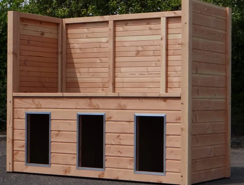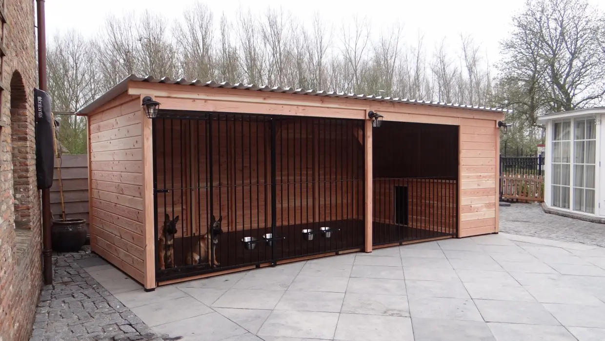 - De houten wanden zorgen voor beschutting tegen wind, neerslag en zon. Hierdoor ontstaat een beter klimaat in de kennel, het hele jaar door.