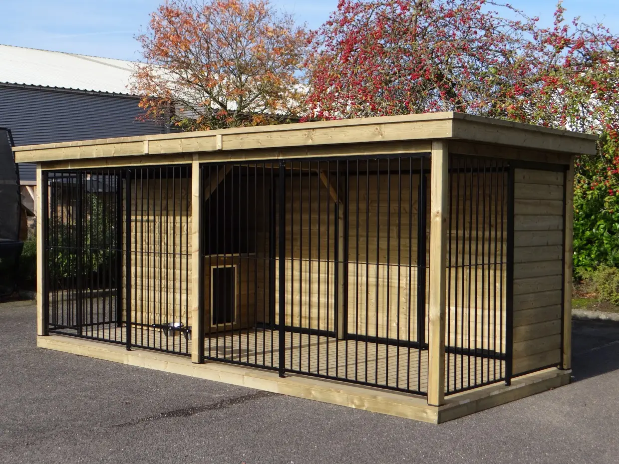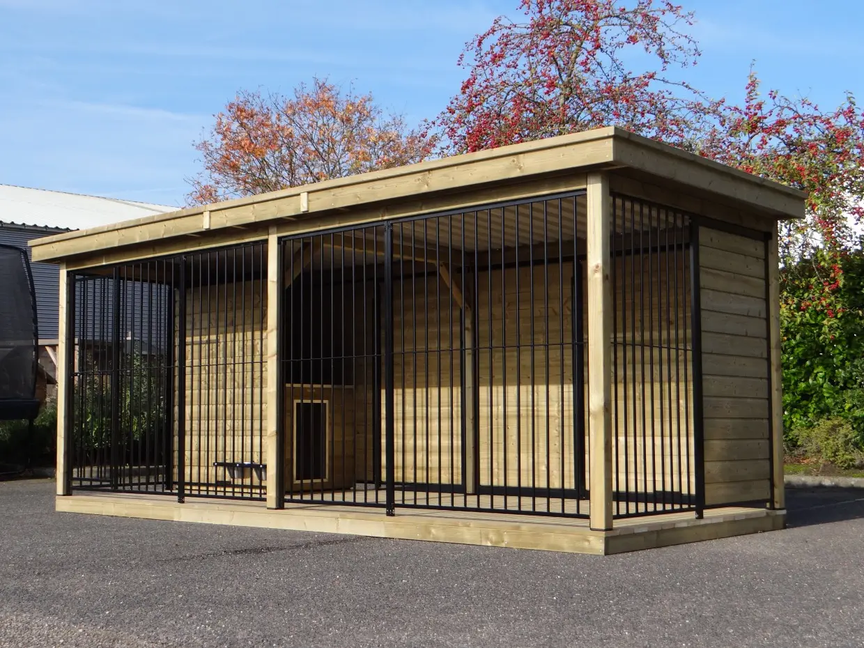 Hondenkennel Ferm zwart met houtkader en luxe daksysteem van geïmpregneerd vurenhout is een prachtige kennel met optimale beschutting voor uw hond. Achter het tochtschot is een geïsoleerd nachthok geplaatst. De kennel is hierdoor een mooi en compleet set voor alle seizoenen. Het dikke vuren houten kader en het fraai afgewerkte dak zorgen samen voor fantastische uitstraling en maken de kennel helemaal af.