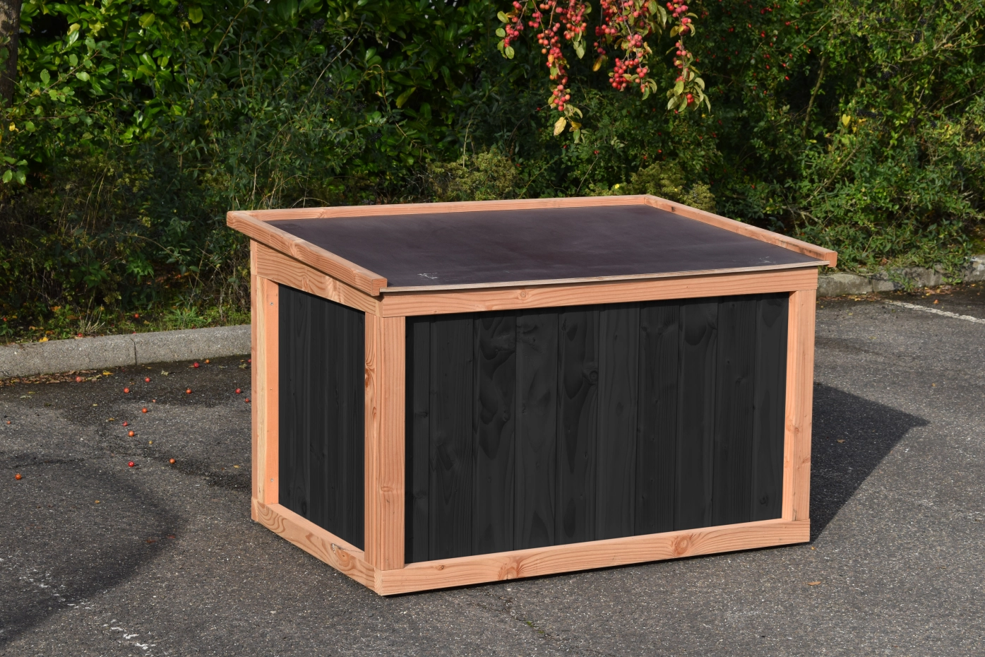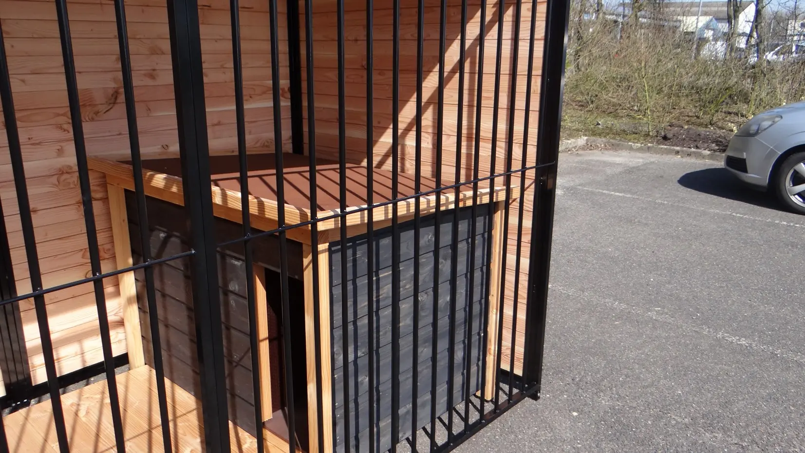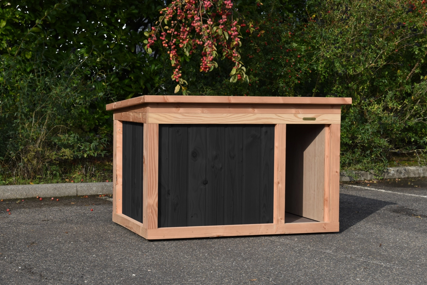 Let op, op de foto staat nog een verouderd model hondenhok, tegenwoordig leveren we dit met een mooie Block Large Zwart/Douglas. Dit is zonder een vlonder voor het hok!! Dit mooie nachthok past goed bij deze hondenkennel. In combinatie met het dak en de dichte wanden biedt deze kennel een optimale beschutting aan uw hond.