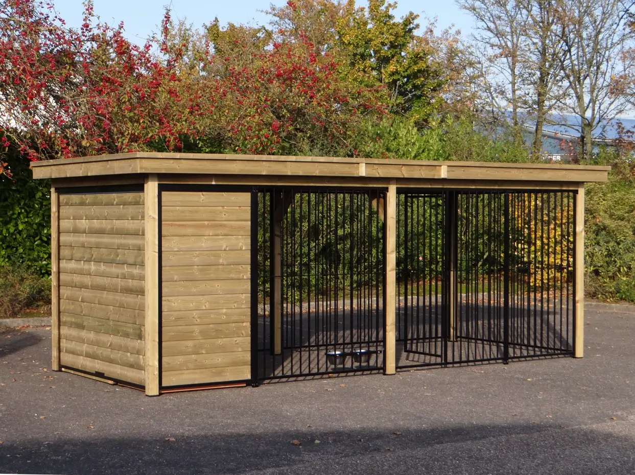 Hondenkennel FIX is zo ontworpen dat er een beschut gedeelte is en een open ren gedeelte. In het houten deel staat een geïsoleerd nachthok Easy. Dit zorgt er voor dat uw hond in alle seizoenen buiten kan blijven. Door de grote open ren kan een hond goed rondkijken om de omgeving in de gaten te houden. De hele kennel is voorzien van een luxe dak. Het hout wat gebruikt wordt voor deze kennel is erg mooi geïmpregneerd vurenhout, dit hout heeft een lange levensduur en behoeft geen verder onderhoud.