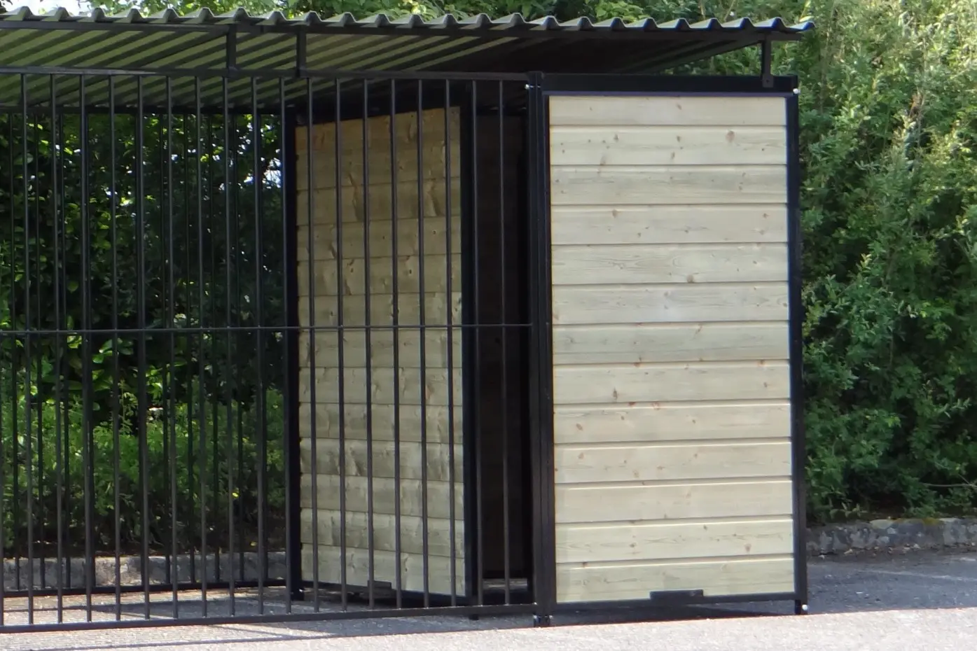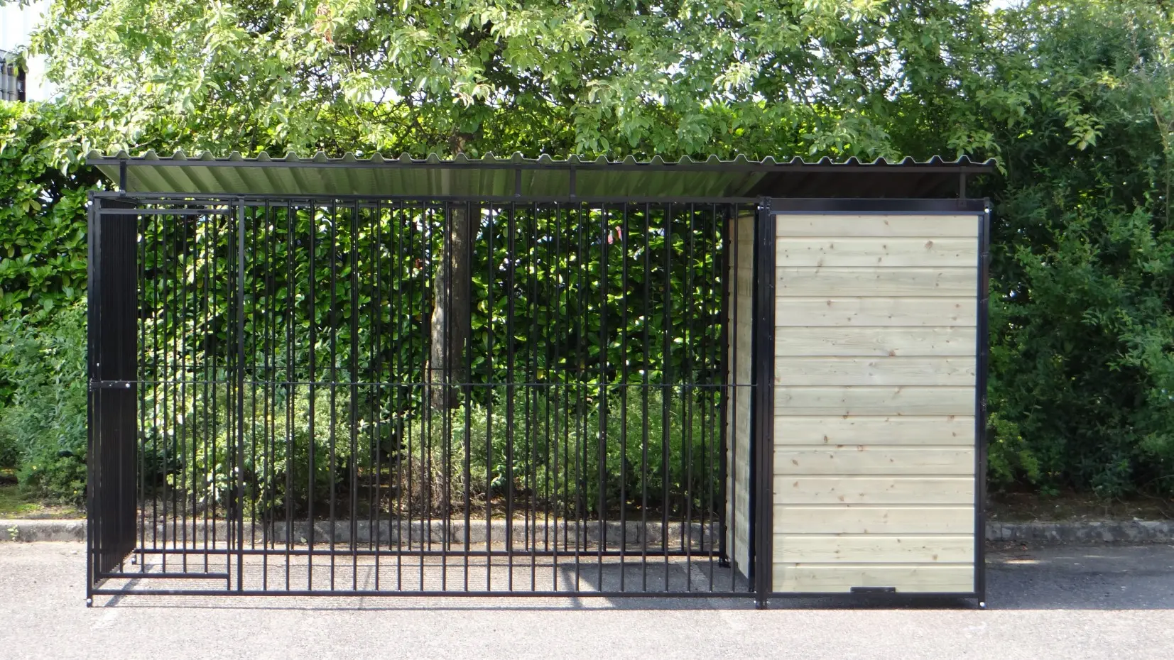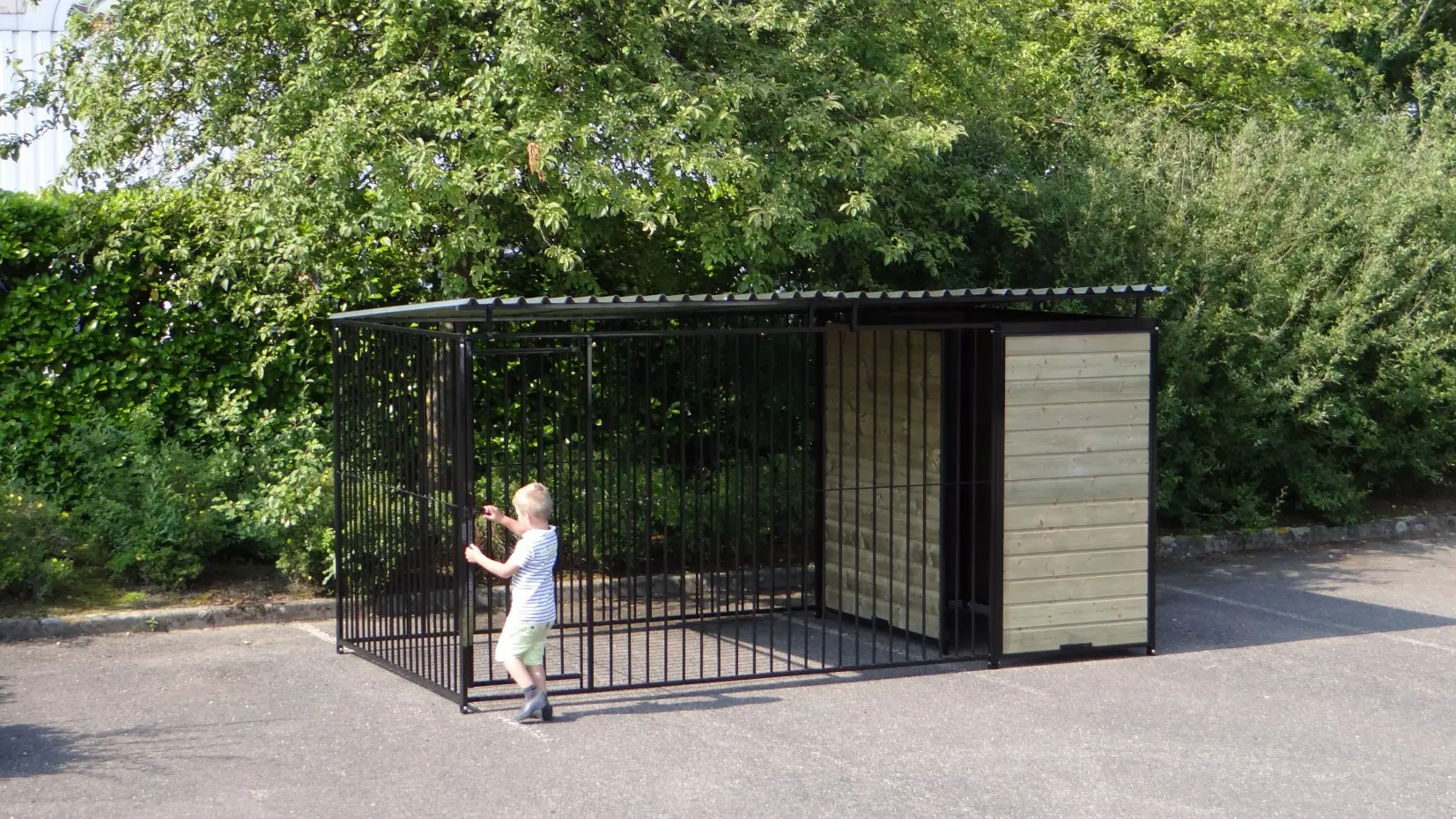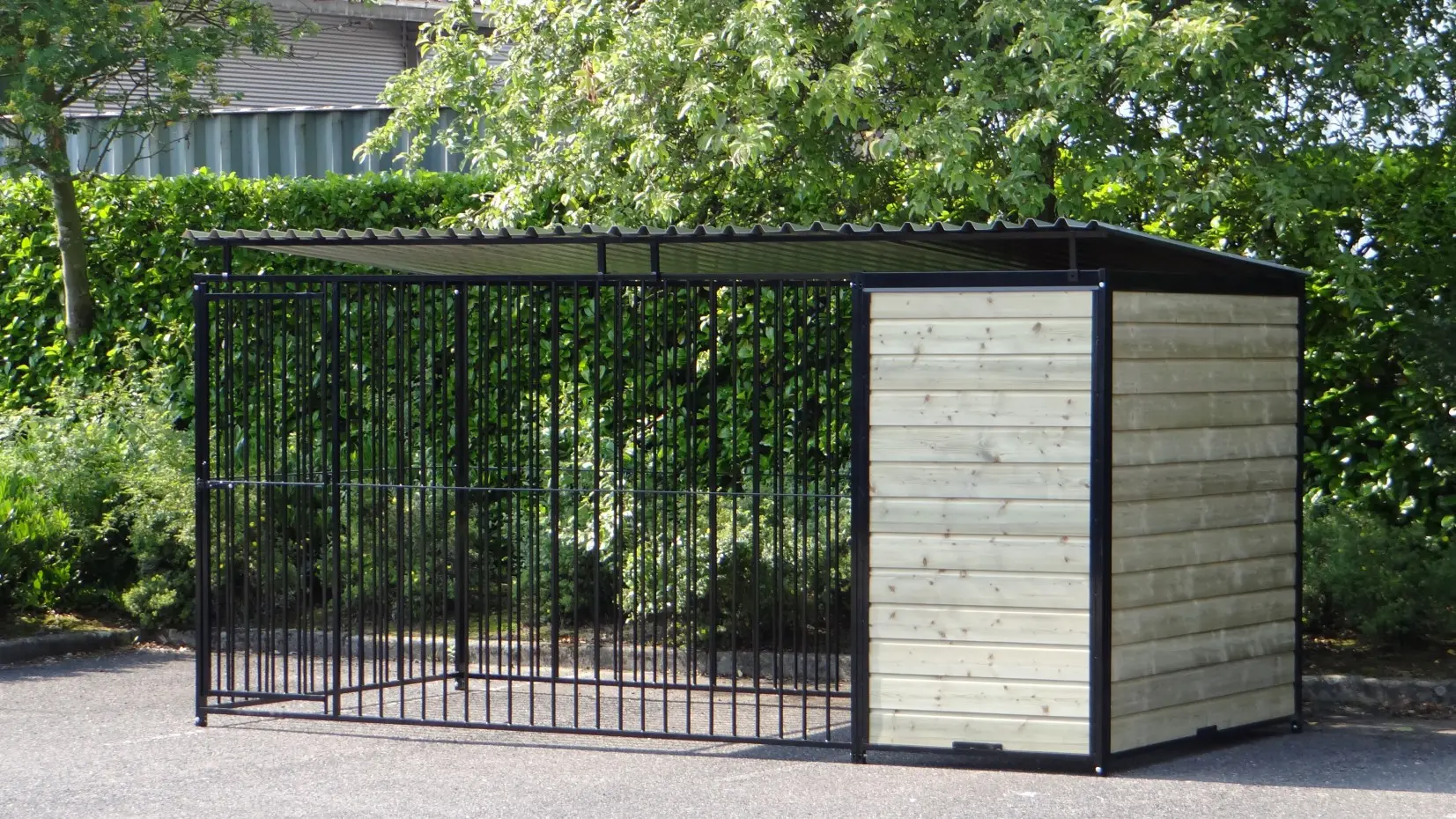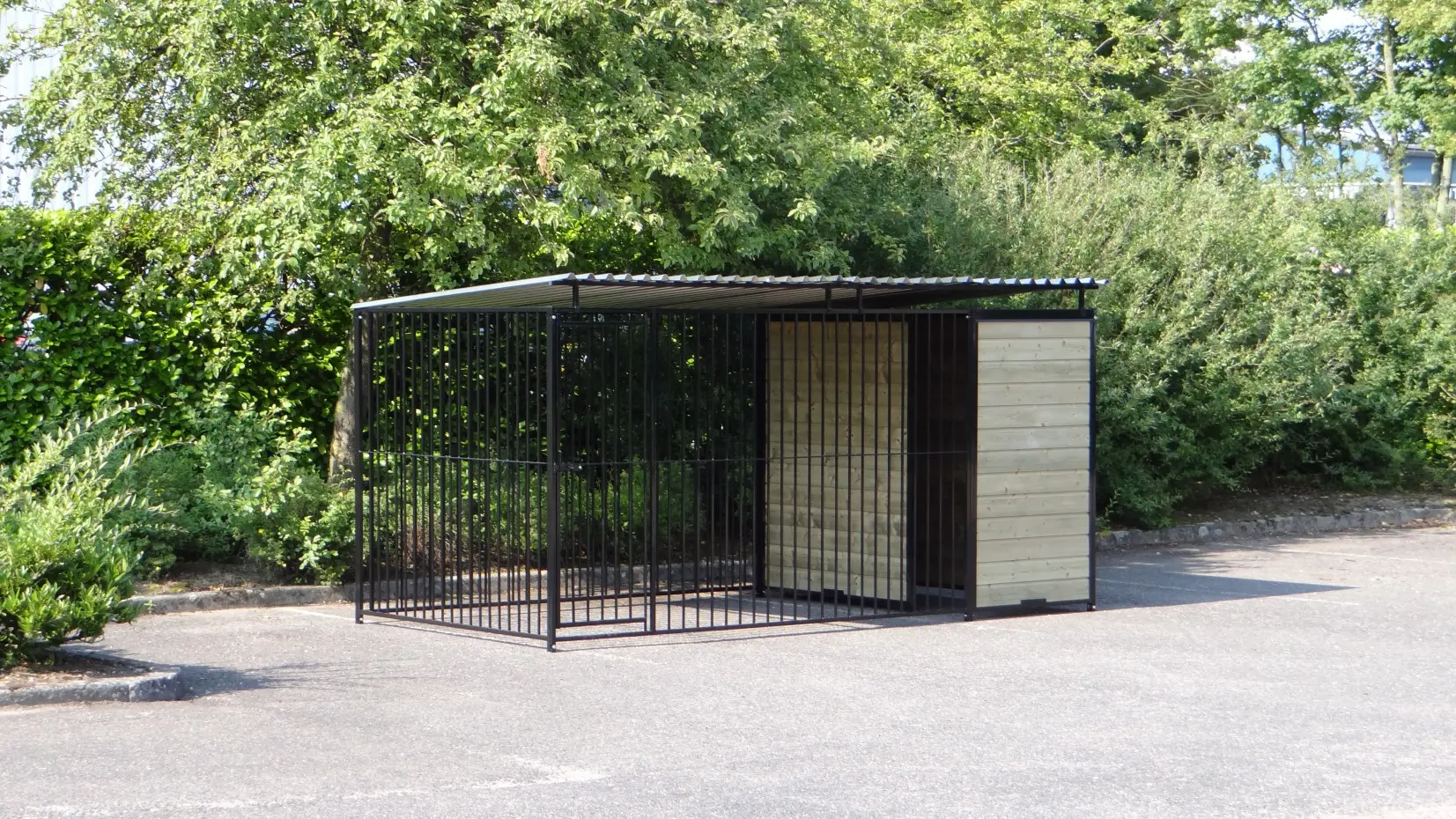 Stevige stalen hondenkennel, zwart gepoedercoat en voorzien van dak. Afmeting 4x2 meter en deels voorzien van dichte geïmpregneerd vurenhouten wanden. Het is overbodig om te zeggen dat dit een zeer chique kennel is. Ook weer met de kwaliteit van Grootplezier.nl. Achter het tochtschot is plaats voor een vlonder en/of nachthok. Optimaal dierenverblijf voor grote en kleine honden. Alle bevestigingsmaterialen en een opbouwbeschrijving worden meegeleverd.