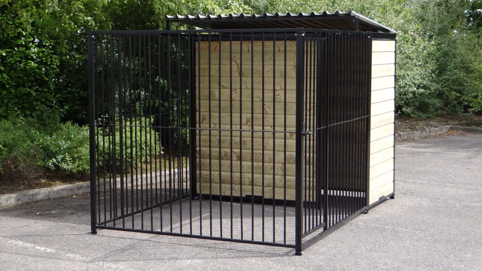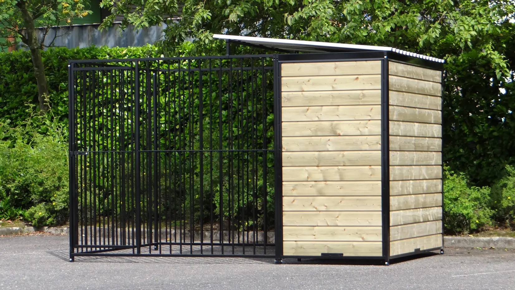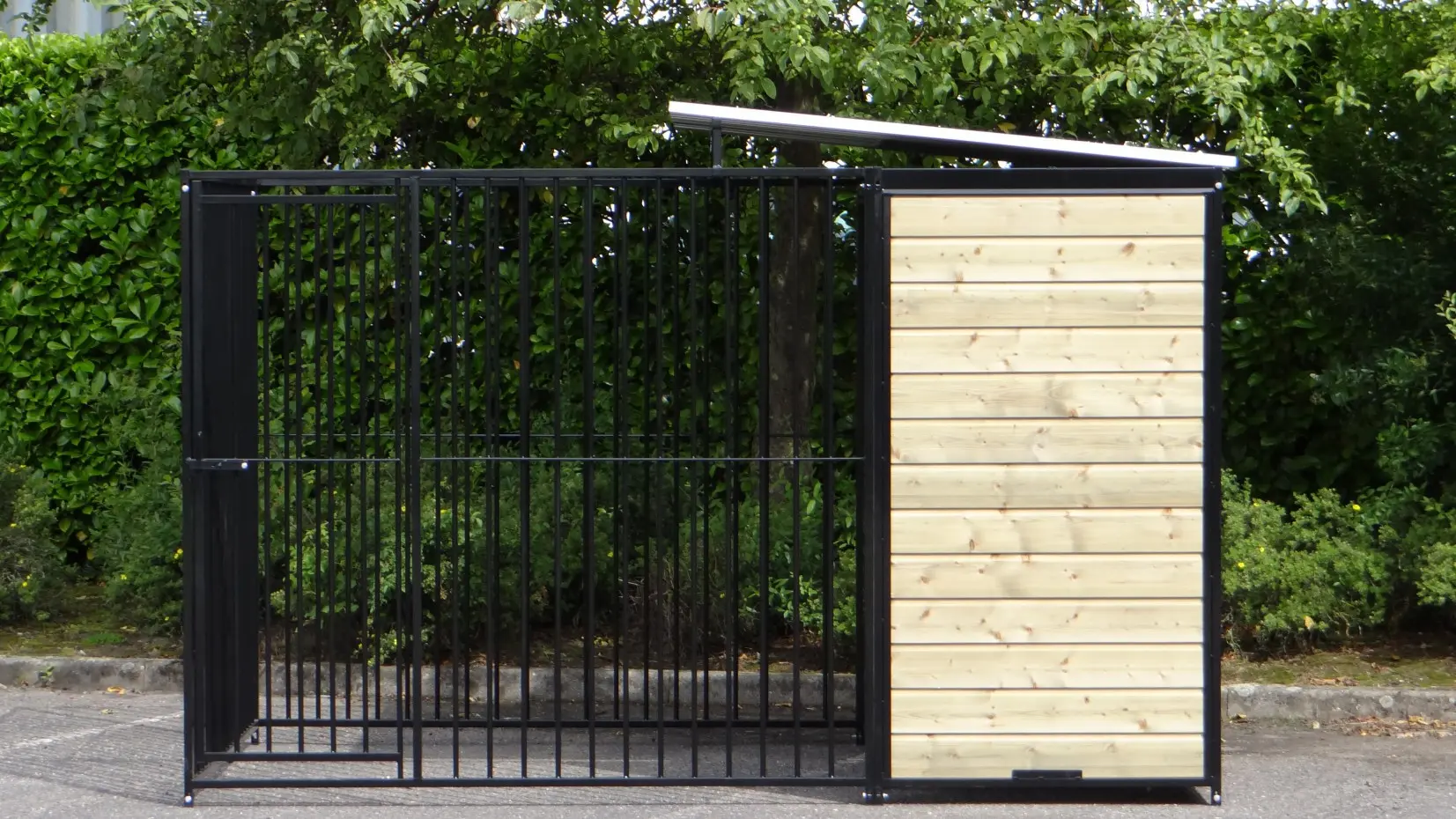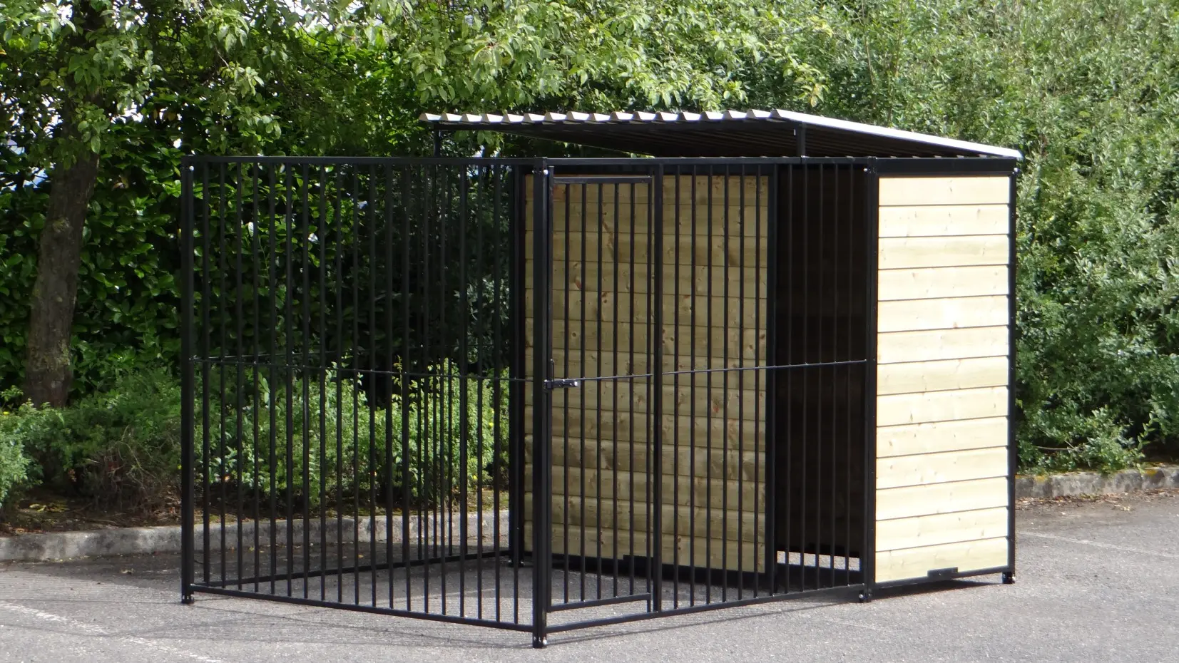 Stevige stalen hondenkennel, zwart gepoedercoat en voorzien van half dak. 2x3 meter en deels voorzien van dichte geïmpregneerd vurenhouten wanden. Het is overbodig om te zeggen dat dit een zeer chique kennel is. Ook weer met de kwaliteit van Grootplezier.nl. Achter het tochtschot is plaats voor een vlonder en/of nachthok. Optimaal dierenverblijf voor grote en kleine honden. Alle bevestigingsmaterialen en een opbouwbeschrijving worden meegeleverd.