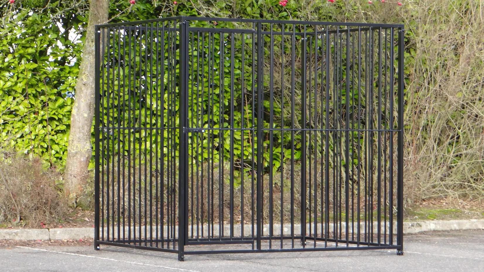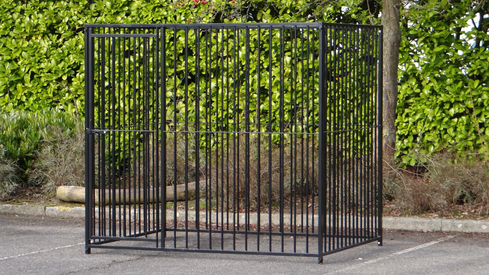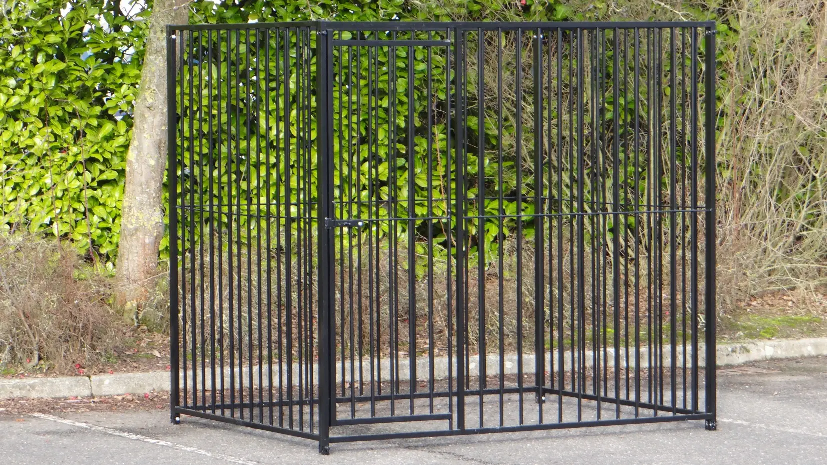 Zwart gepoedercoate hondenkennel van 2x1,5m. De hondenkennel bestaat uit 2 kennelpanelen van 1,5 meter en 2 kennelpanelen van 2 meter, waarvan één paneel met deuropening! Het is ook heel eenvoudig om direct een kenneldak mee te bestellen.