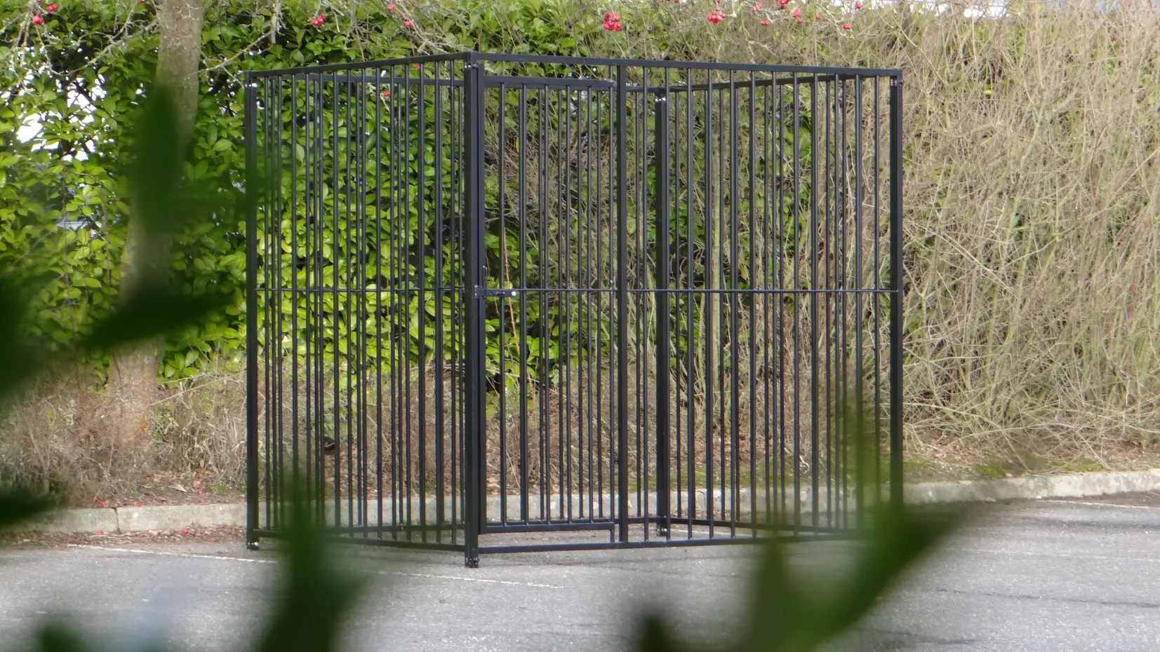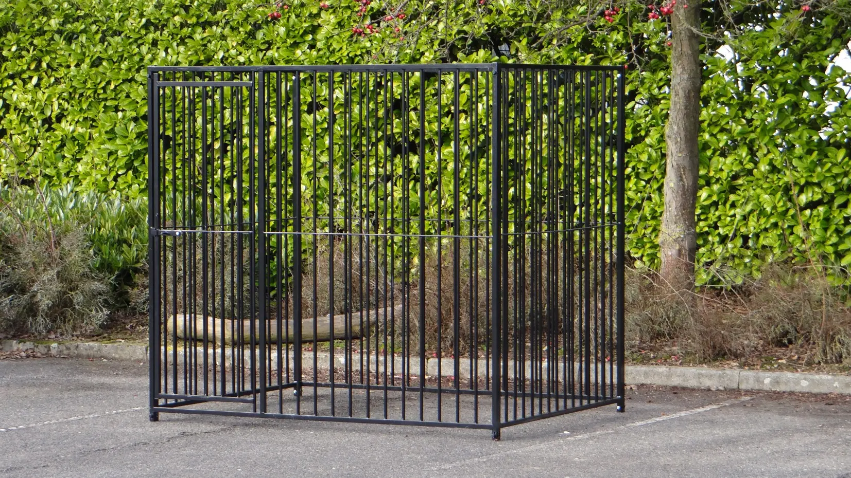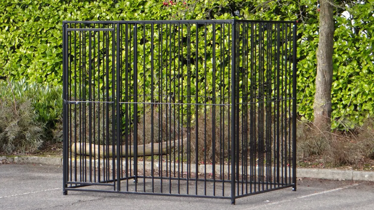 Zwart gepoedercoate hondenkennel van 2x1,5m. De hondenkennel bestaat uit 2 kennelpanelen van 1,5 meter en 2 kennelpanelen van 2 meter, waarvan één paneel met deuropening! Het is ook heel eenvoudig om direct een kenneldak mee te bestellen.