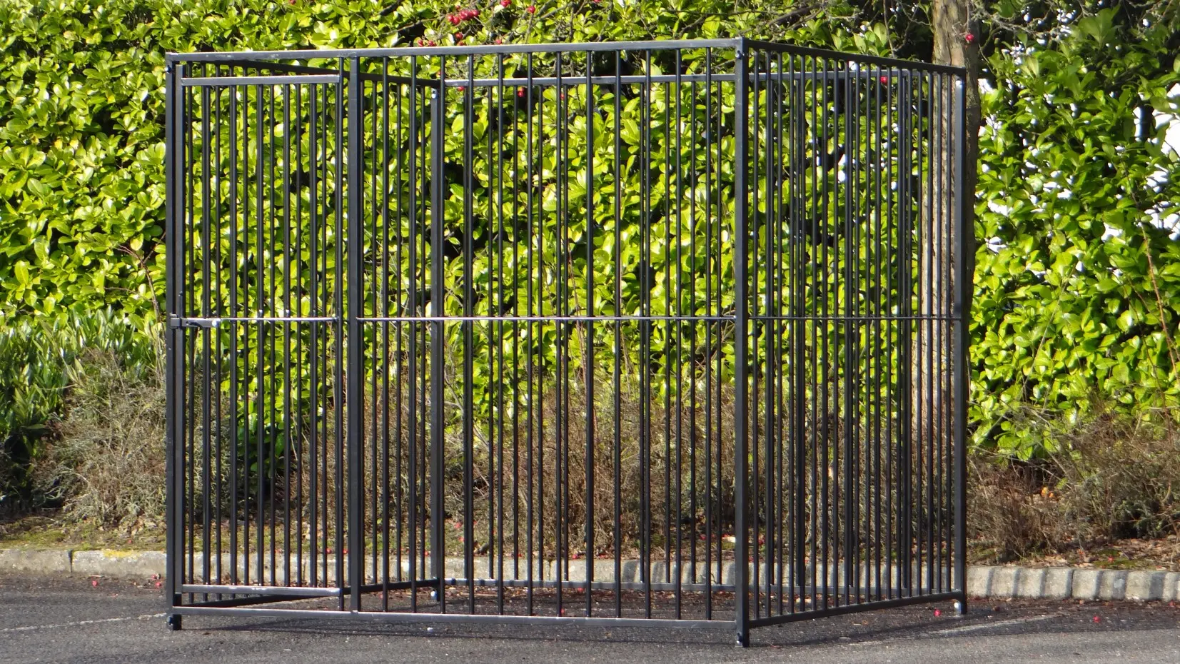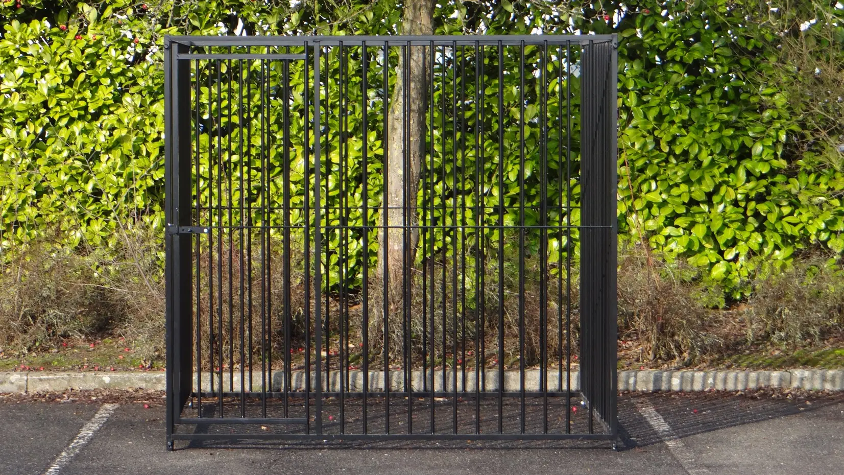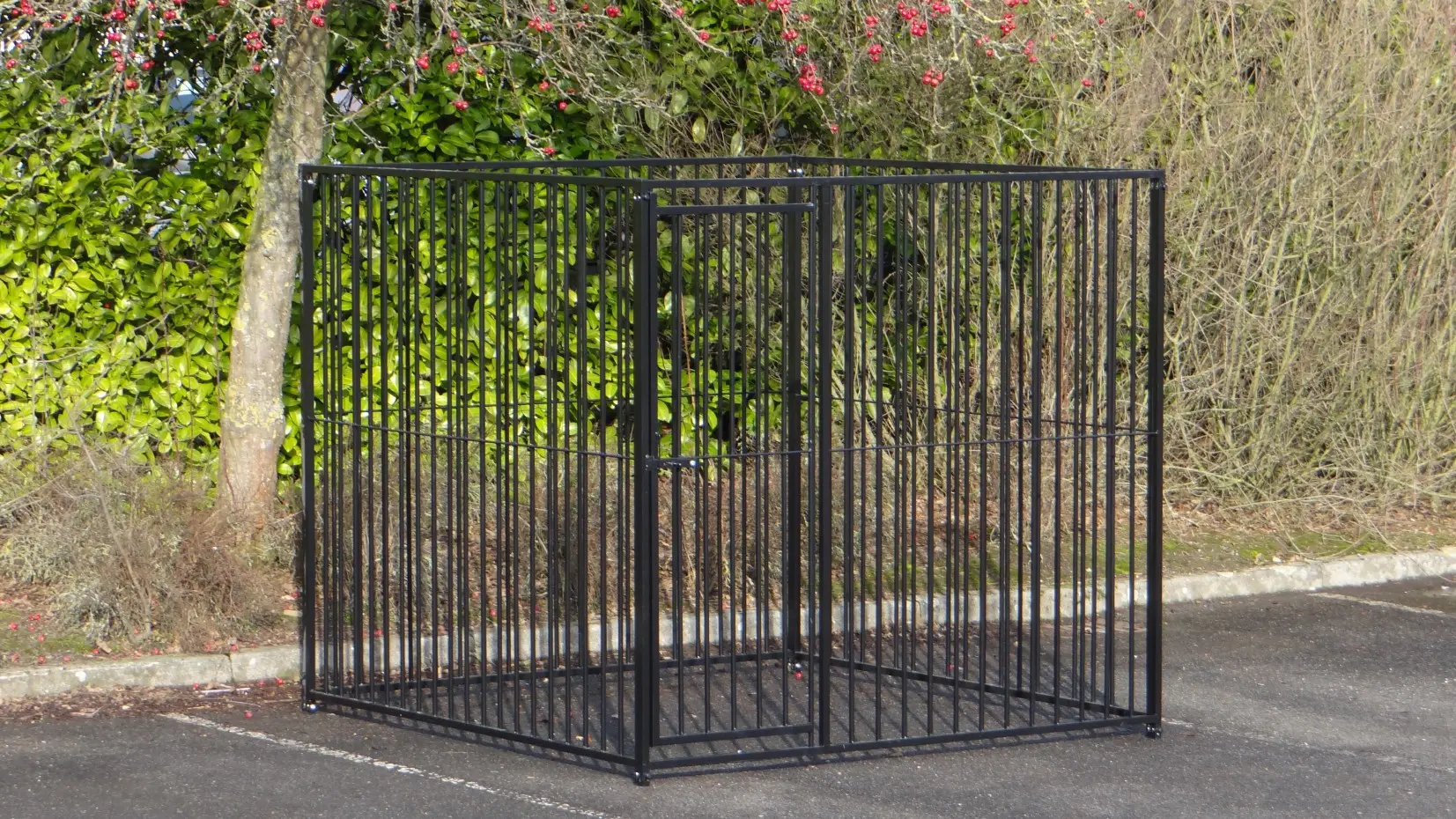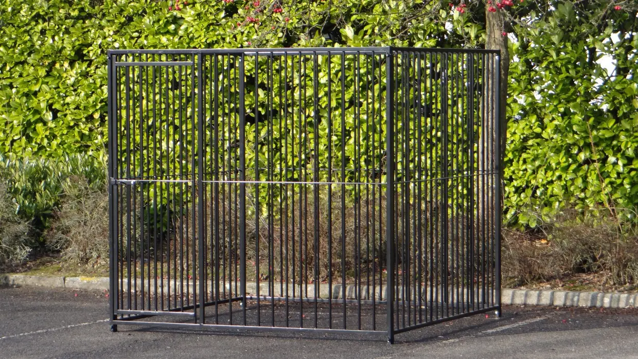 Zwarte hondenkennel met een oppervlakte van 4m2. De kennel wordt gemaakt van 4 zwarte kennelpanelen. Vierkante kennel met aan de voorkant van deur aan de linkerkant, die naar binnen toe open gaat.
