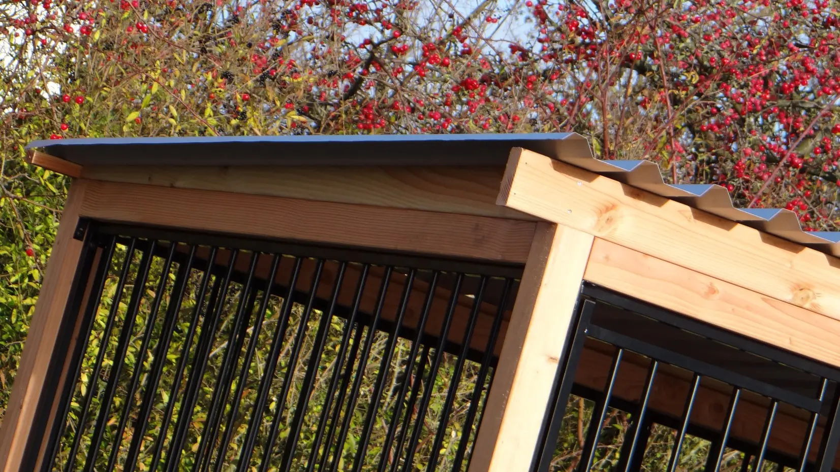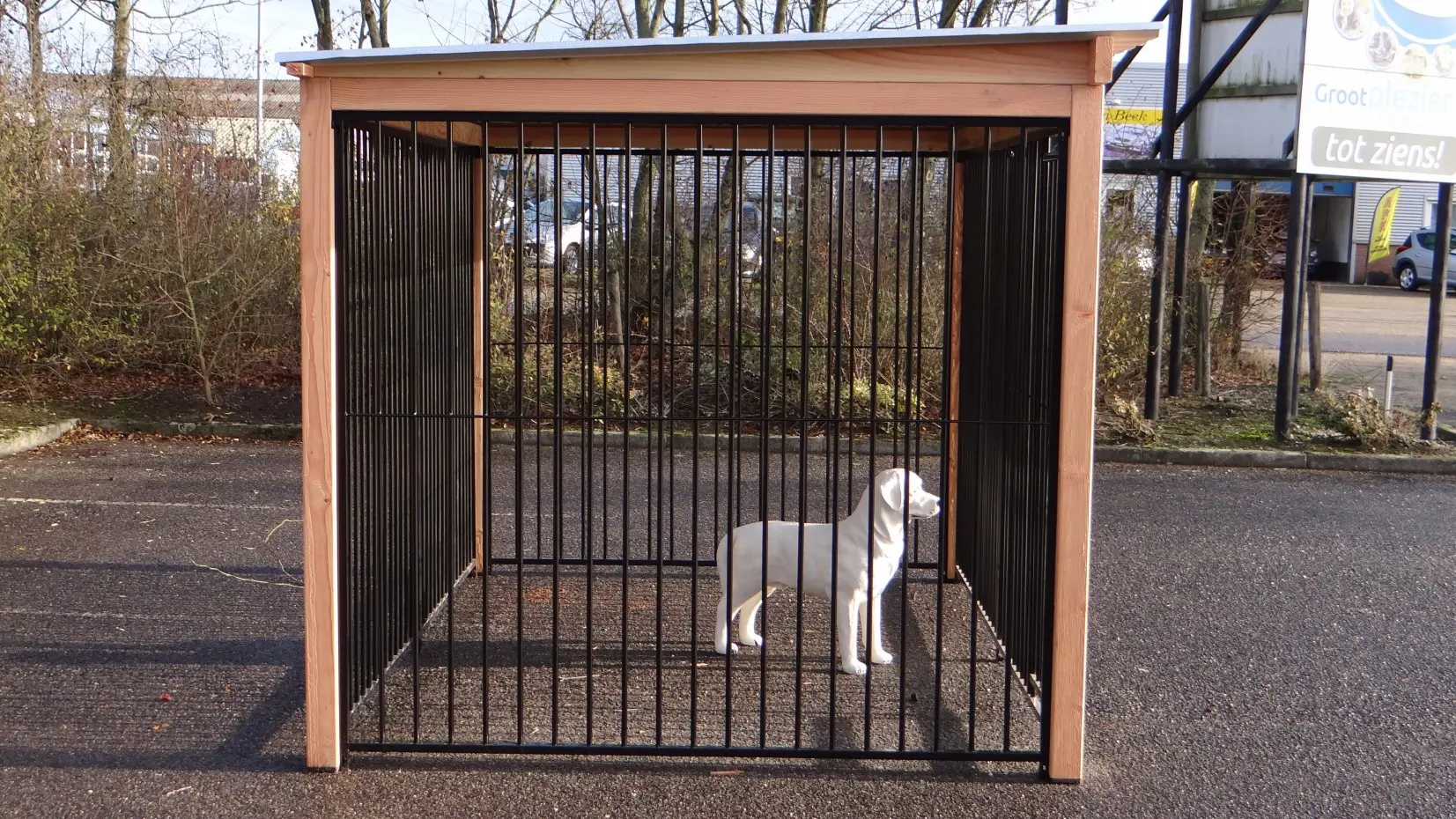 Hondenkennel Flinq zwart met dak Douglas houtkader is een zeer solide en mooie oplossing voor een hondenren. Het dikke houten kader zorgt voor een super chique uitstraling en maakt de kennel sterker dan ooit. Het dak is van staal en daardoor zeer duurzaam. Ook is het zo gemaakt dat het tikken van de regen gedempt wordt. Deze unieke kennel is in vele maten en uitvoeringen beschikbaar bij Grootplezier.nl.