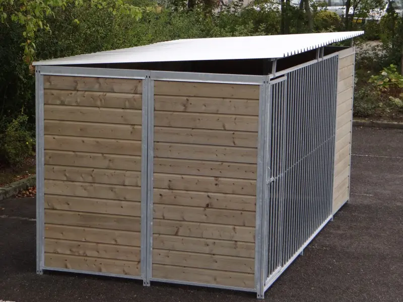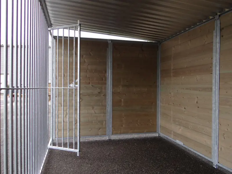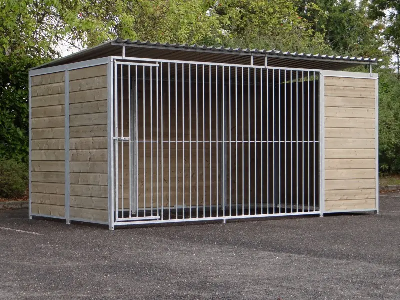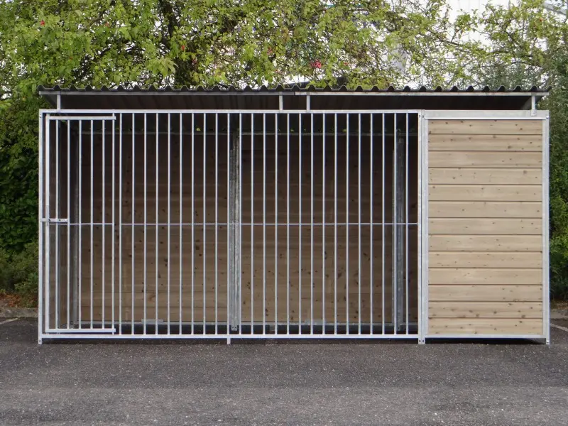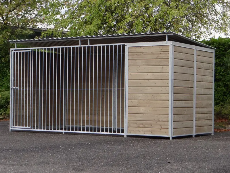 Deze stevige gegalvaniseerde hondenkennel is een optimaal buitenverblijf voor uw hond. Voorzien van een dak, en rondom dichte houten wanden. De houten wanden zijn van geïmpregneerd vuren, dit behoeft geen verder onderhoud. De hondenkennel is 4 x 2 meter en kan binnenin voorzien worden van een fijn tochtschot voor een beschutte plaats voor uw hond. Deze kennel is direct uit voorraad leverbaar!