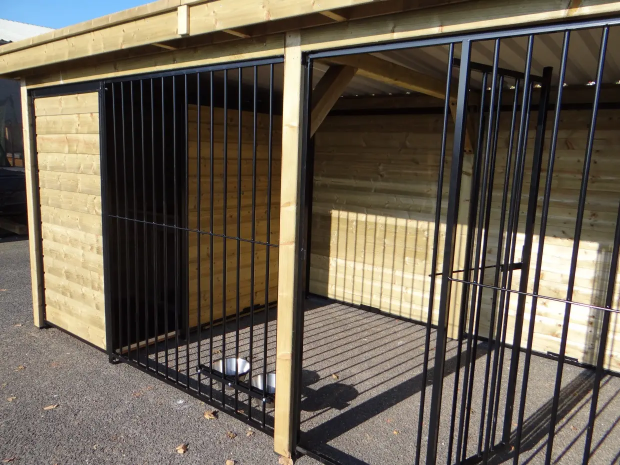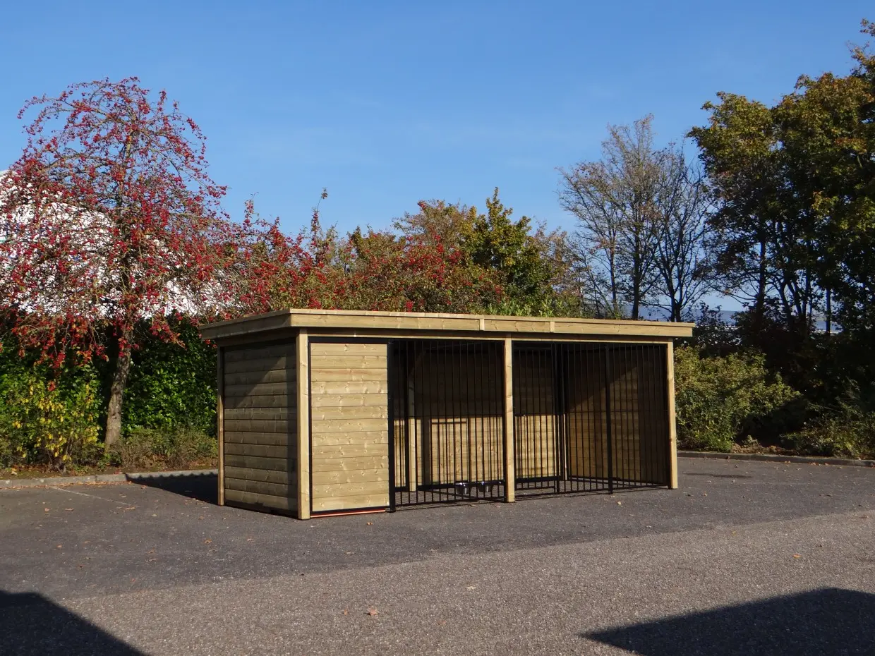 Hondenkennel Forz zwart met houtkader en luxe daksysteem van geïmpregneerd vurenhout is een prachtige kennel met rondom optimale beschutting voor uw hond. Achter het tochtschot is een geïsoleerd nachthok geplaatst met daarvoor een vlonder. De kennel is hierdoor een mooi en compleet set voor alle seizoenen. Het dikke vuren houten kader en het fraai afgewerkte dak zorgen samen voor fantastische uitstraling en maken de kennel helemaal af.