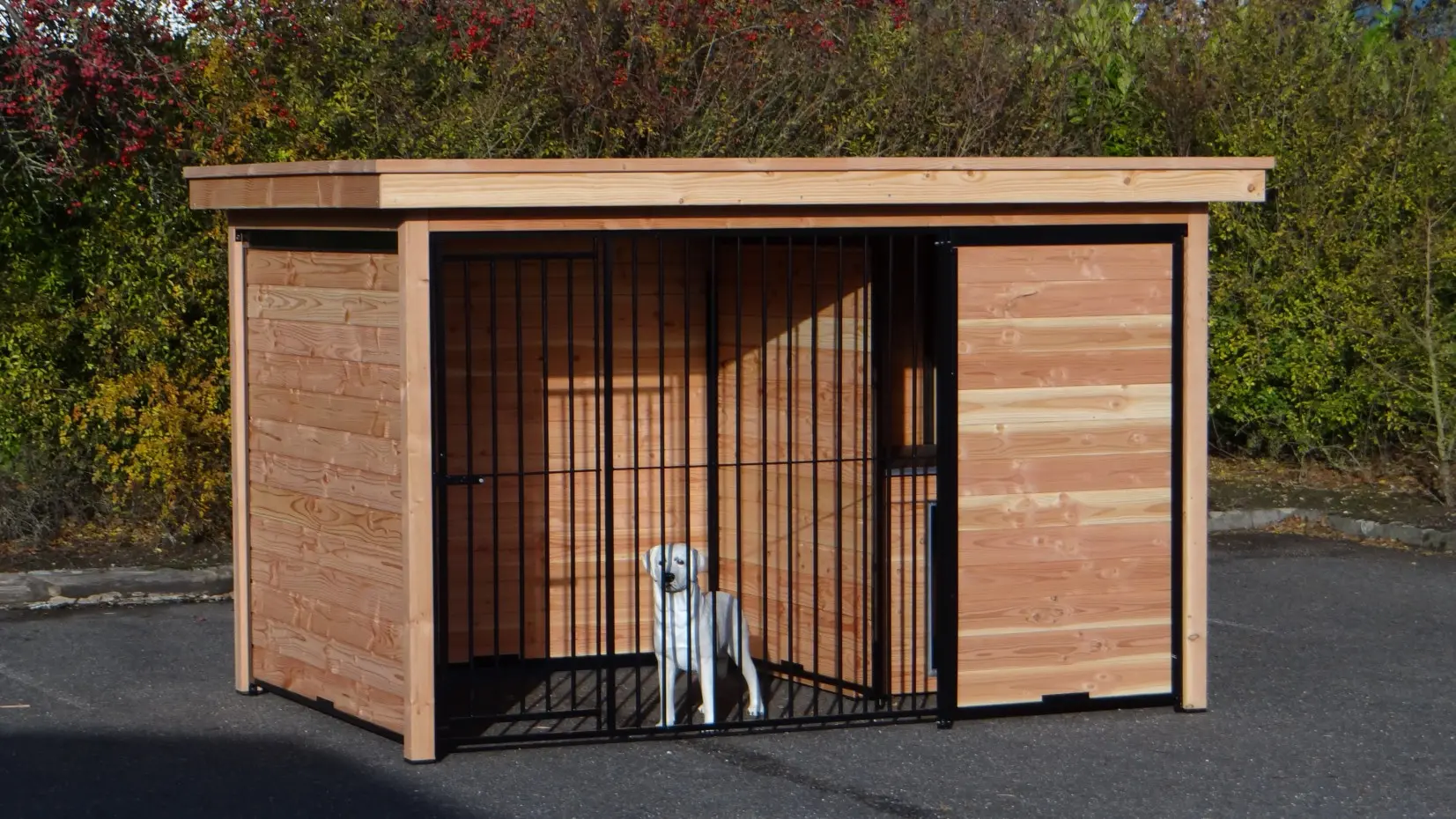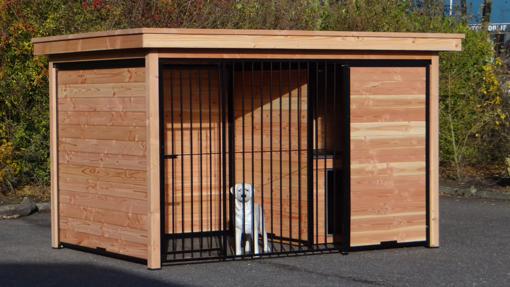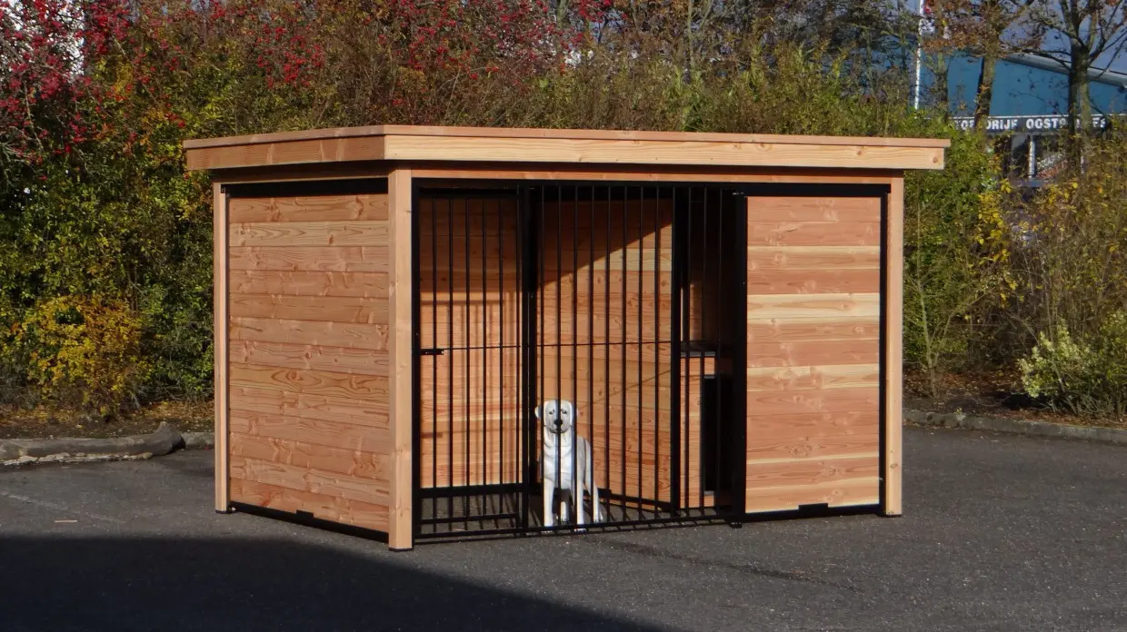- Hondenkennel van douglashout, een mooi en duurzaam houtsoort dat zelfs onbehandeld geschikt is voor buiten. Wel zal het snel grijs worden, behalve als u het behandelt met beits of douglasolie.