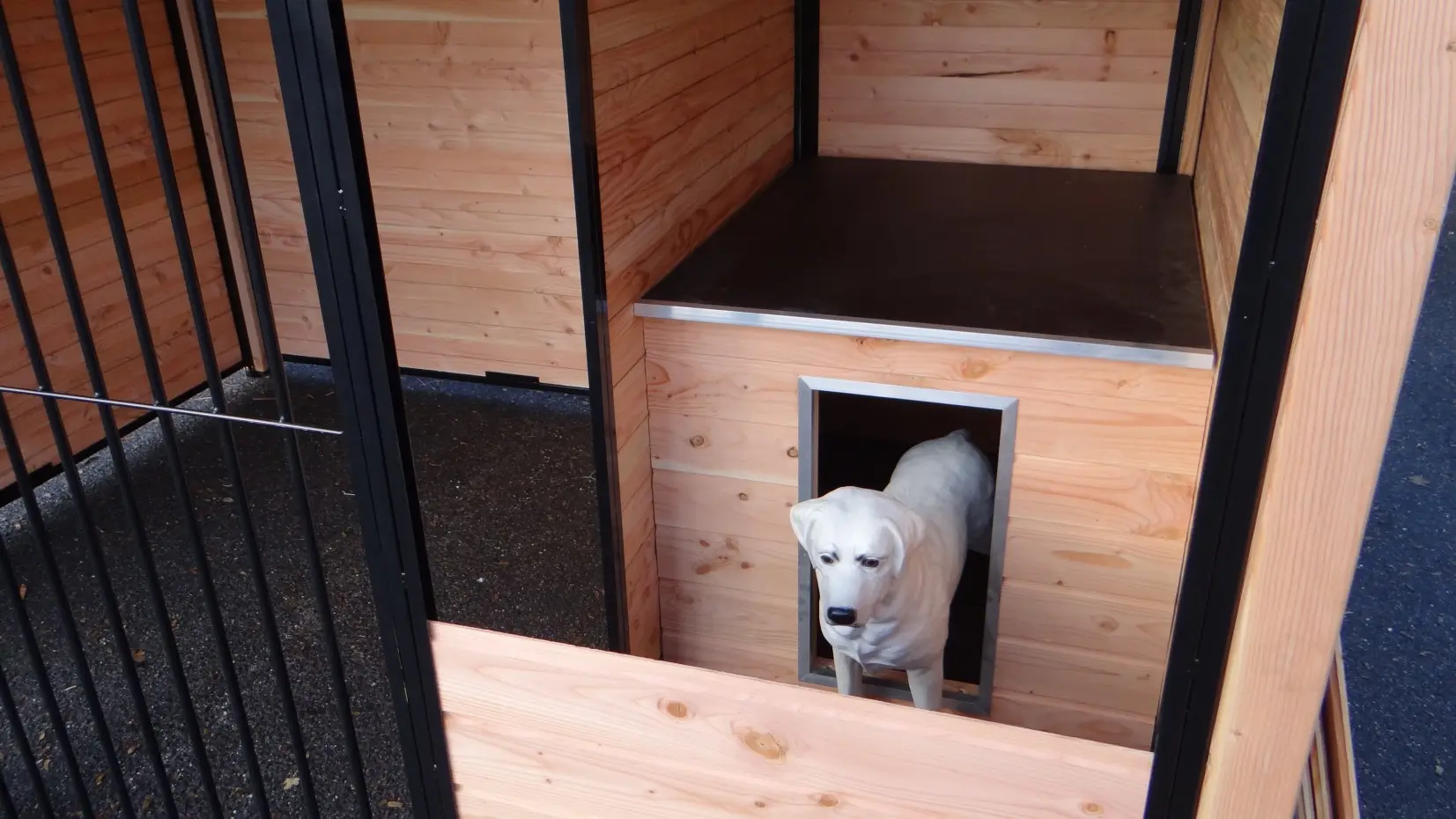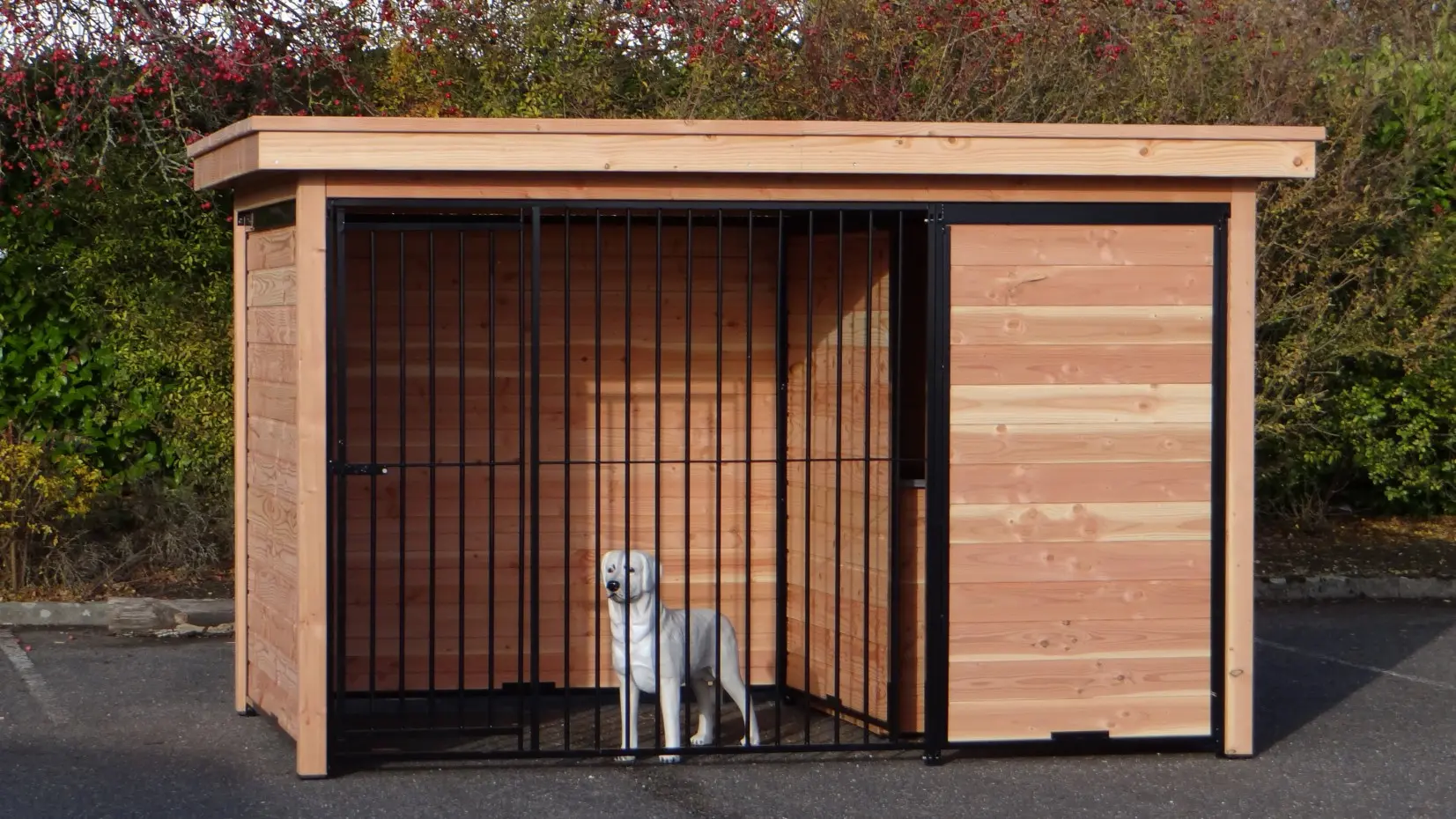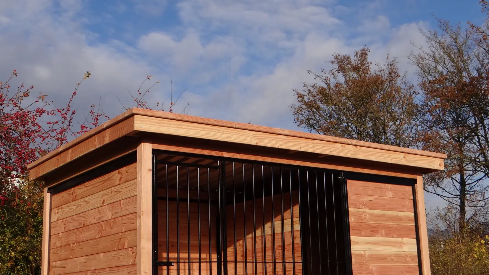 - Hondenkennel van douglashout, een mooi en duurzaam houtsoort dat zelfs onbehandeld geschikt is voor buiten. Wel zal het snel grijs worden, behalve als u het behandelt met beits of douglasolie.