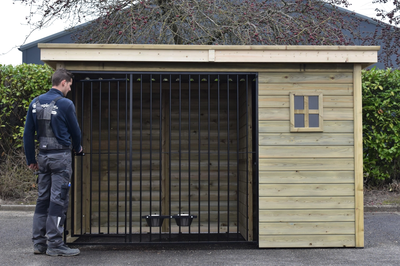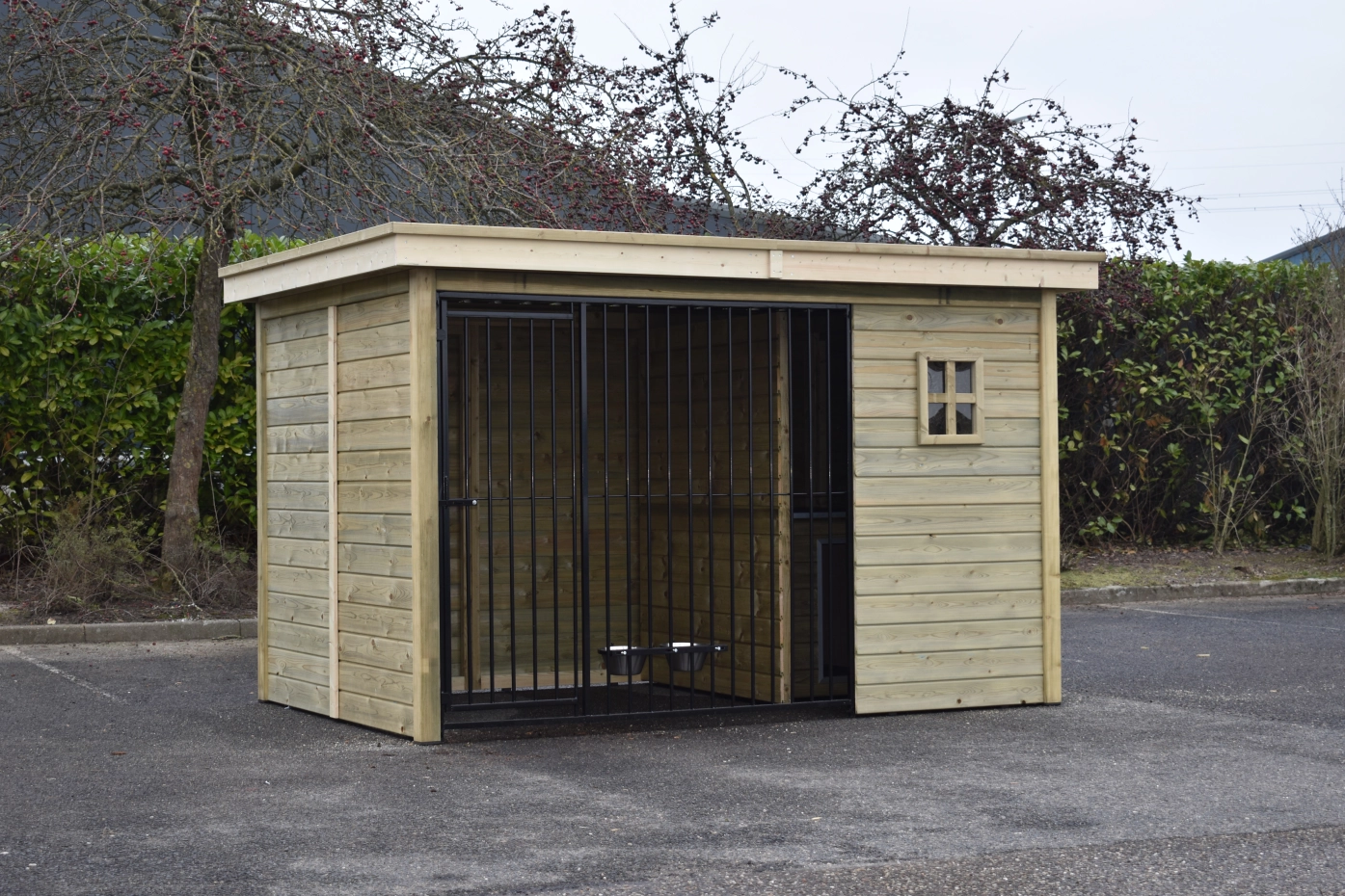 Mooie kennel van geïmpregneerd vurenhout met een luxe, geïsoleerd Easy nachthok. Het dak is uitgevoerd in stalen platen met aan de binnenzijde een viltlaag. Deze laag voorkomt condensvorming en dempt het geluid van regen. Het geïmpregneerde vurenhout is duurzaam en heeft een lange levensduur. Dankzij de modulaire wanden beschikt u over een stevige kennel met strak en netjes afgewerkte panelen. Het dak is afgewerkt met een luxe daksysteem, waardoor de platen nauwelijks zichtbaar zijn. Deze kennel biedt ruimte aan één grote hond of twee middelgrote honden.