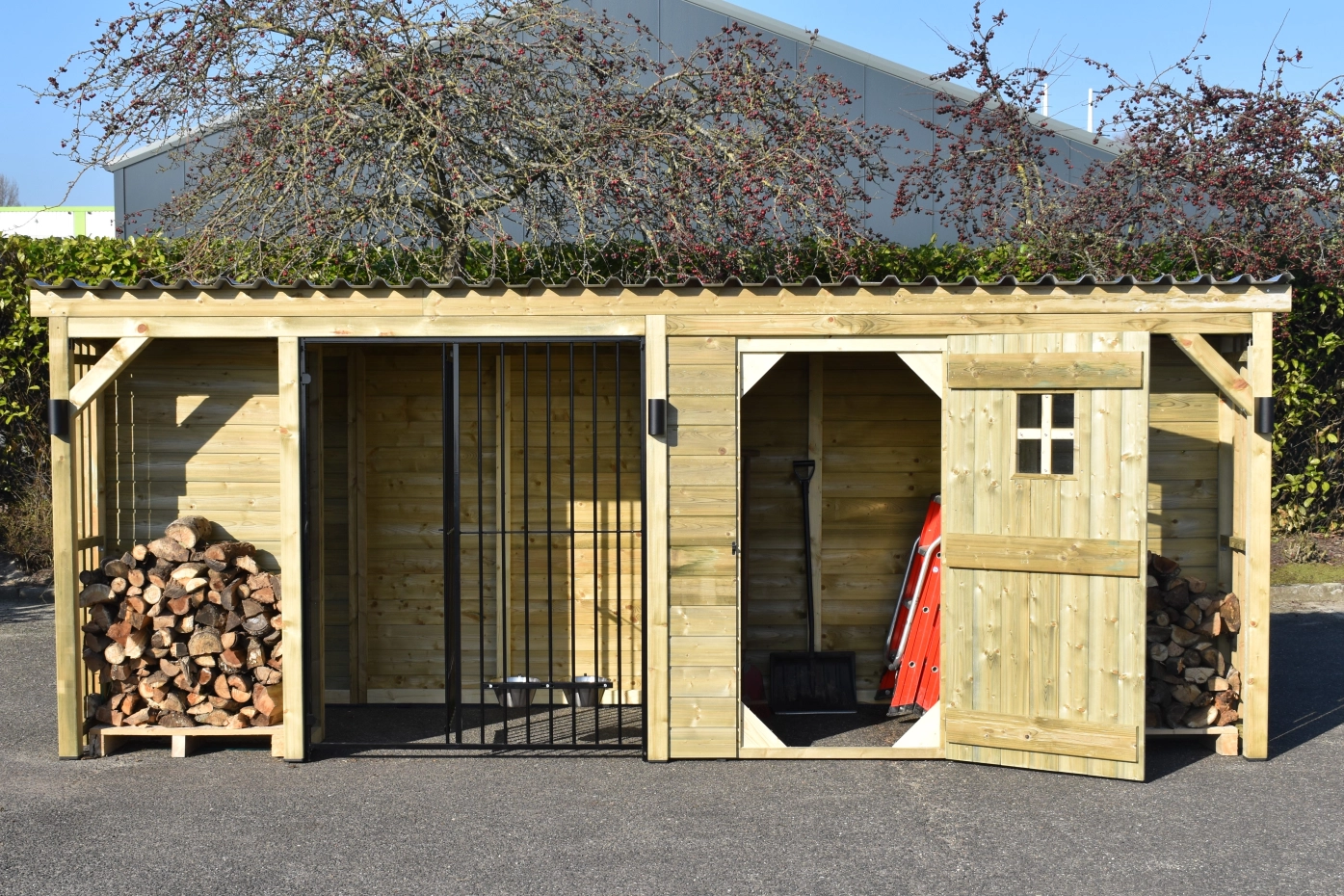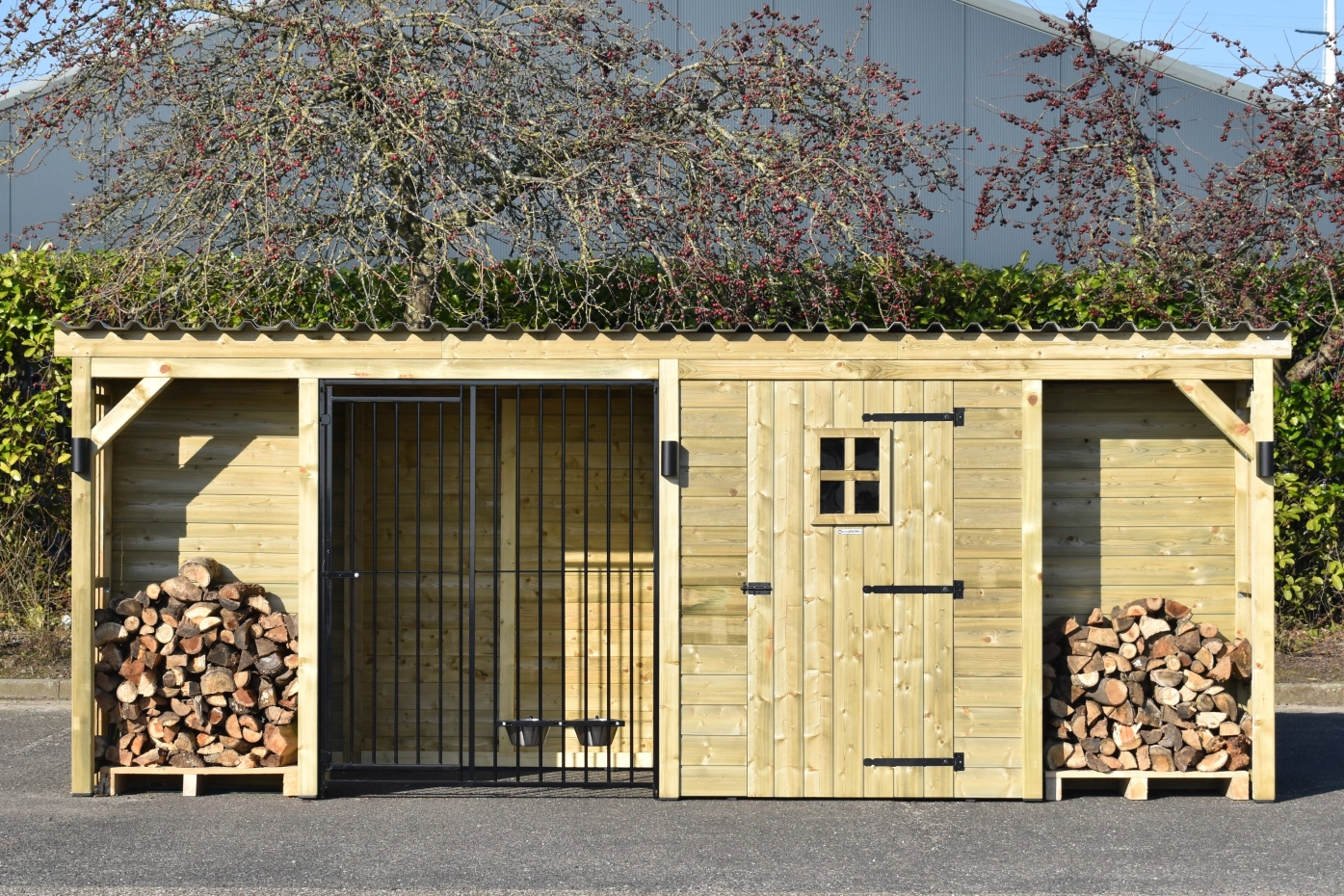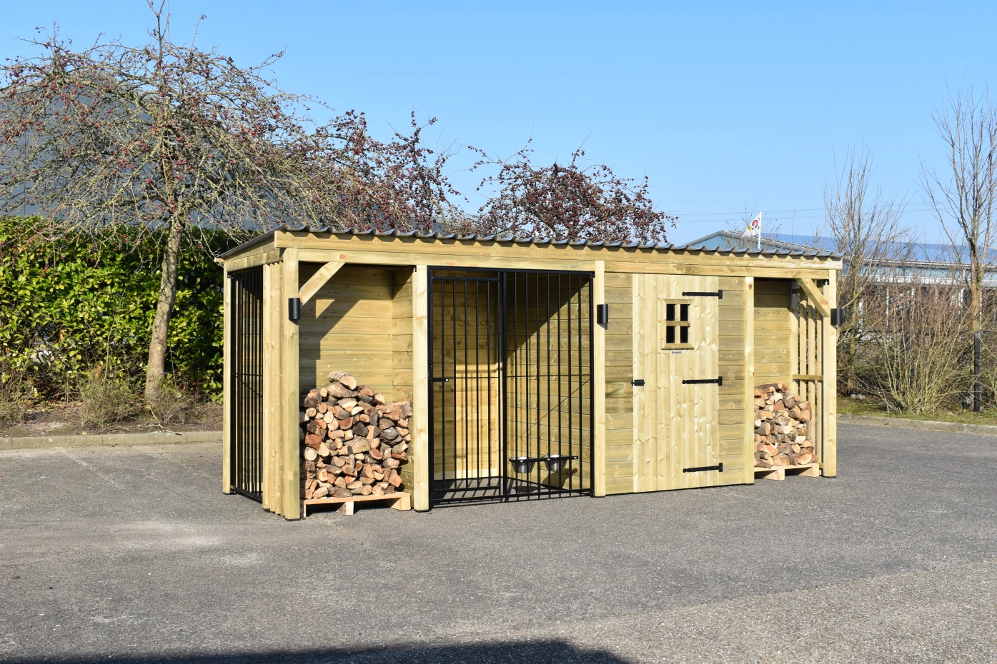 Hondenkennel Modul COMBI met opberghok, afdak en 2 haardhout vakken
