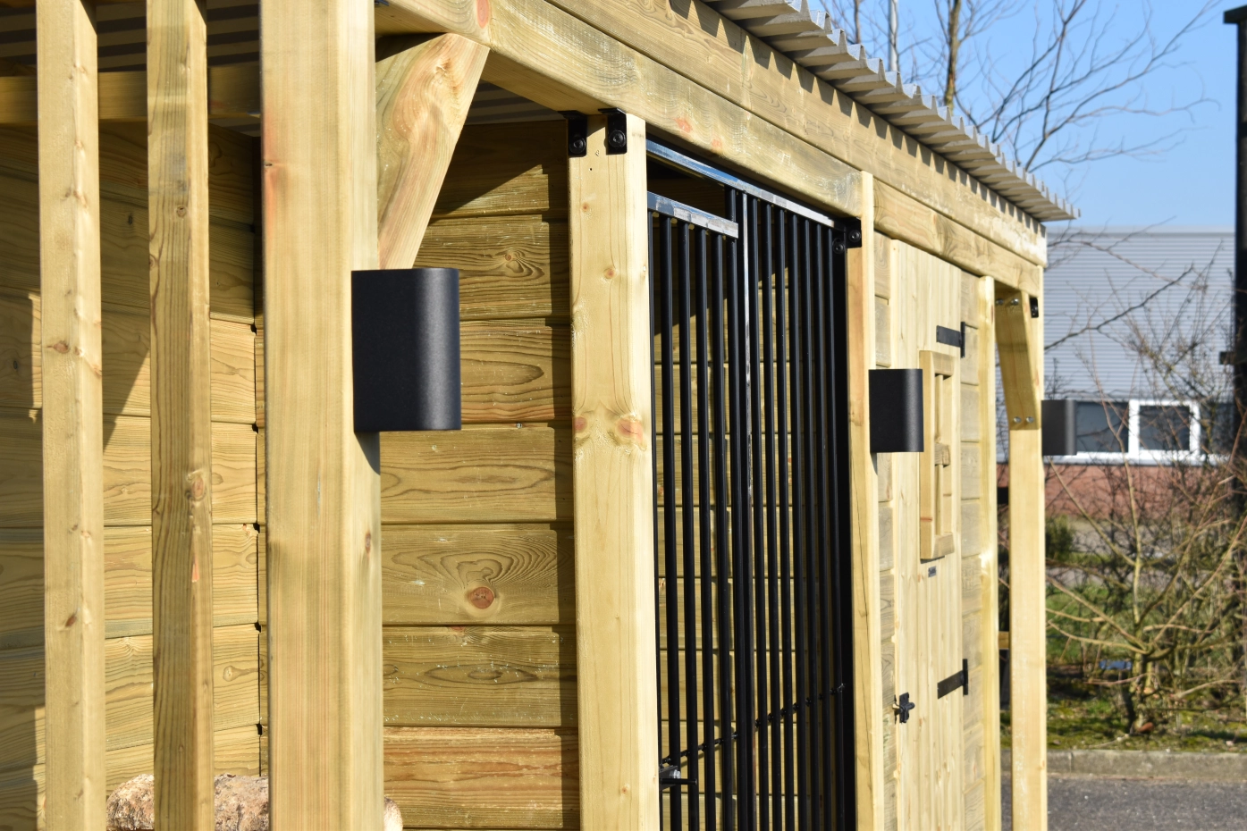 - De houten wanden zorgen voor beschutting tegen wind, neerslag en zon. Hierdoor ontstaat een beter klimaat in de kennel, het hele jaar door.