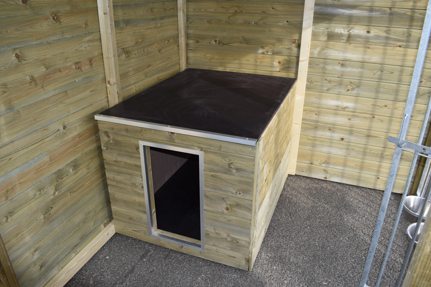 - De houten wanden zorgen voor beschutting tegen wind, neerslag en zon. Hierdoor ontstaat een beter klimaat in de kennel, het hele jaar door.