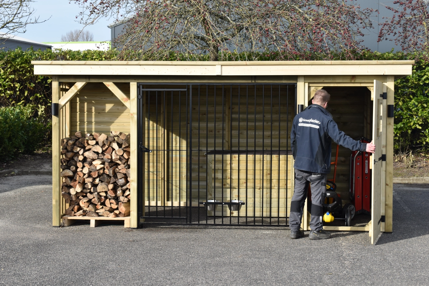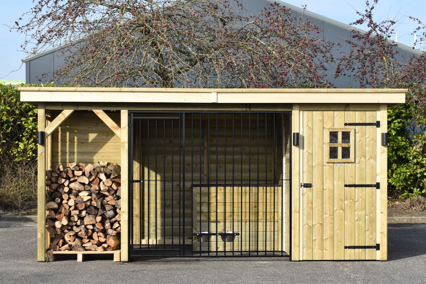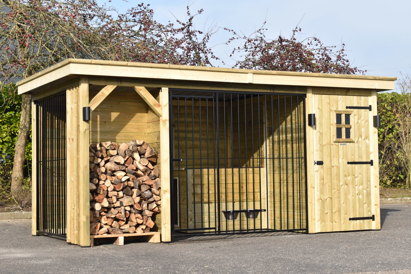 Hondenkennel Modul COMBI met opberghok, nachthok en haardhout vak
