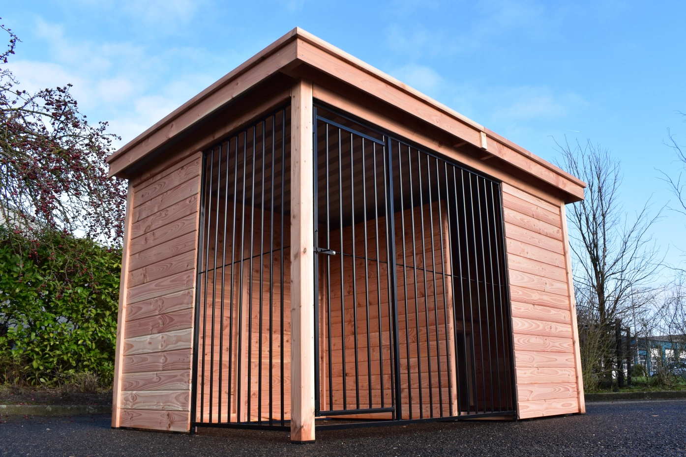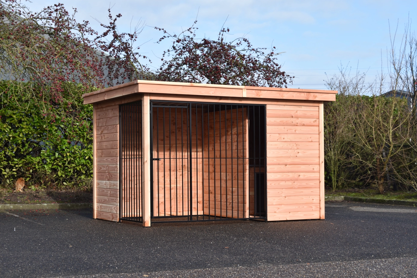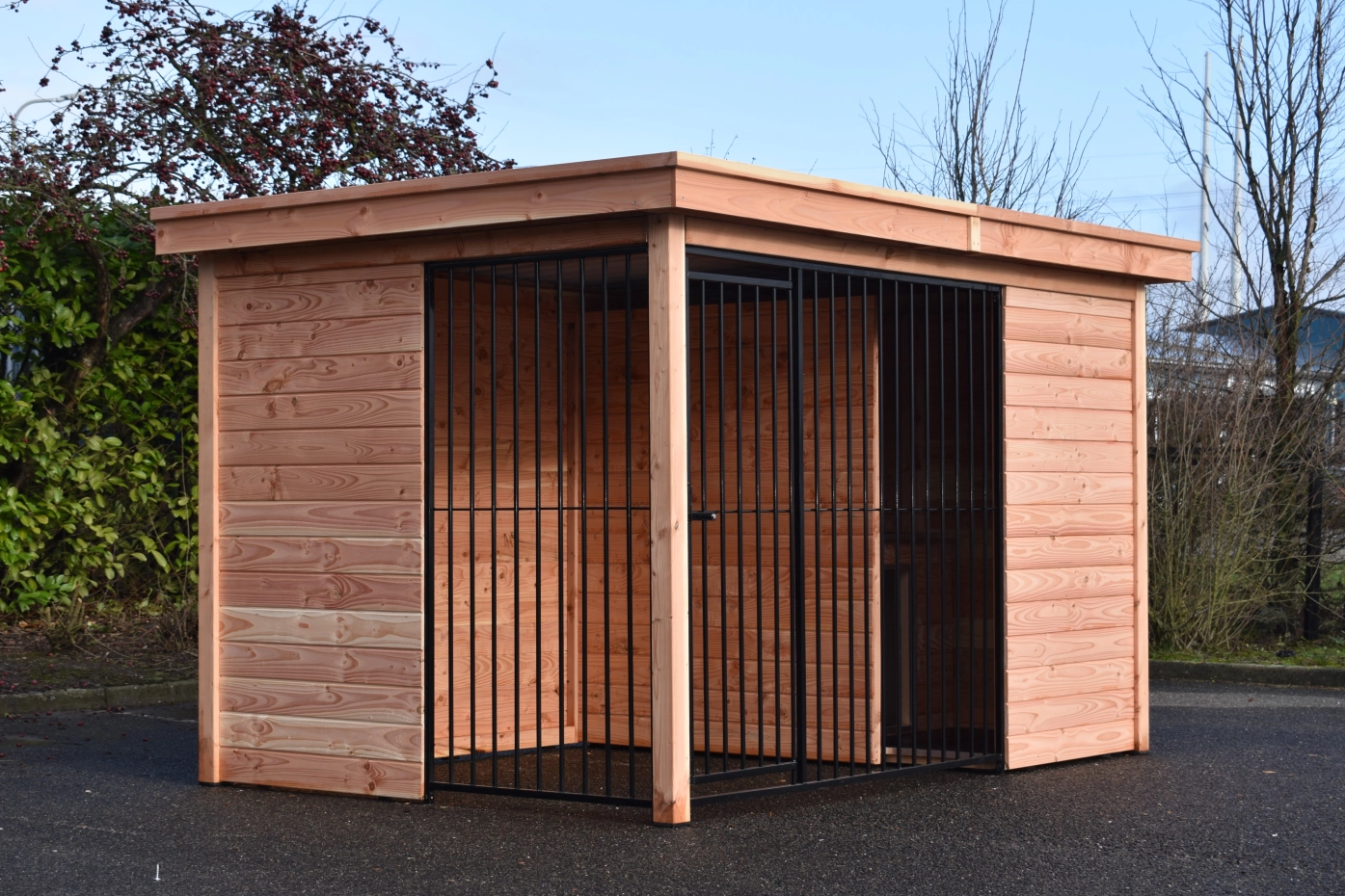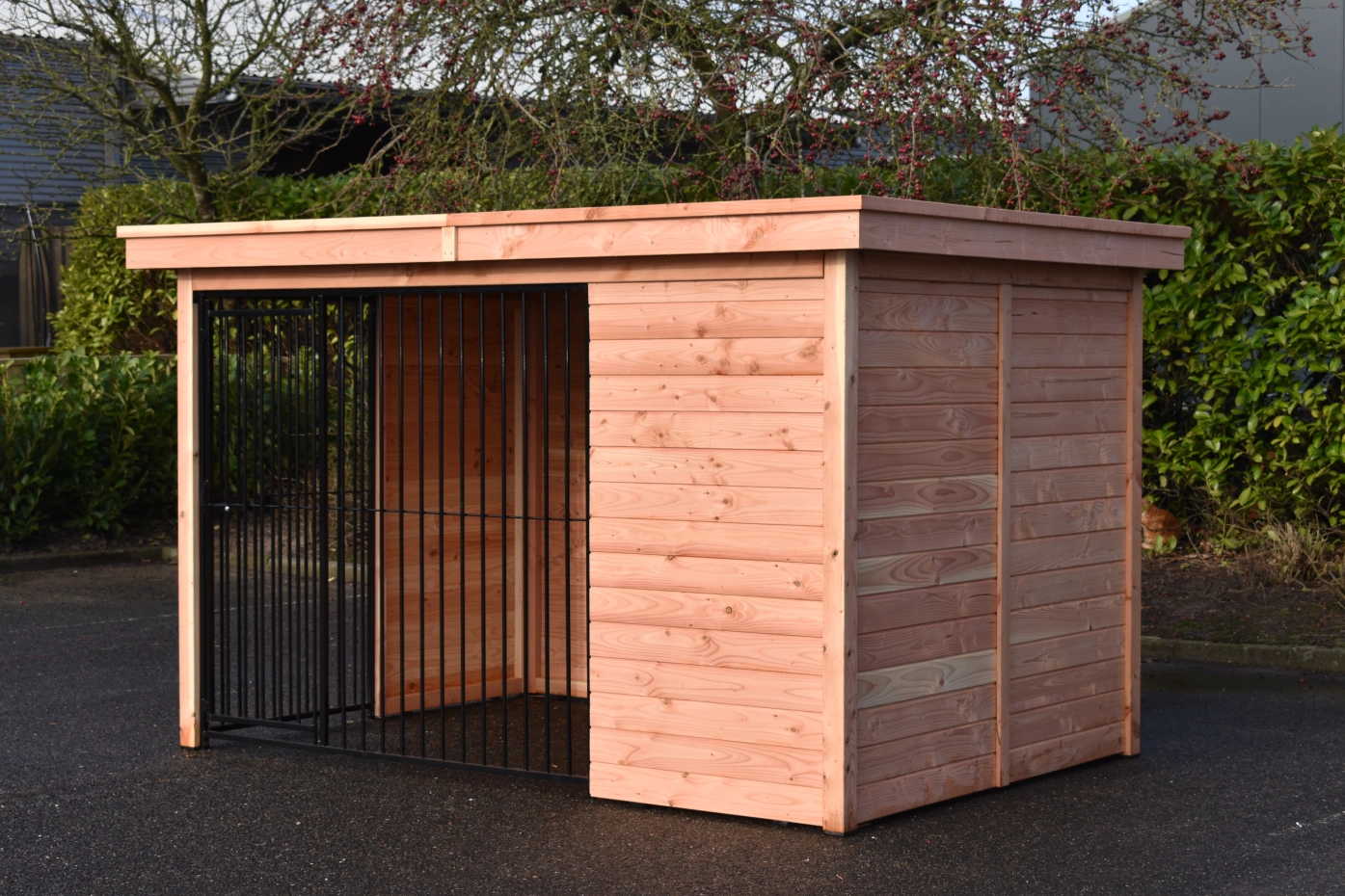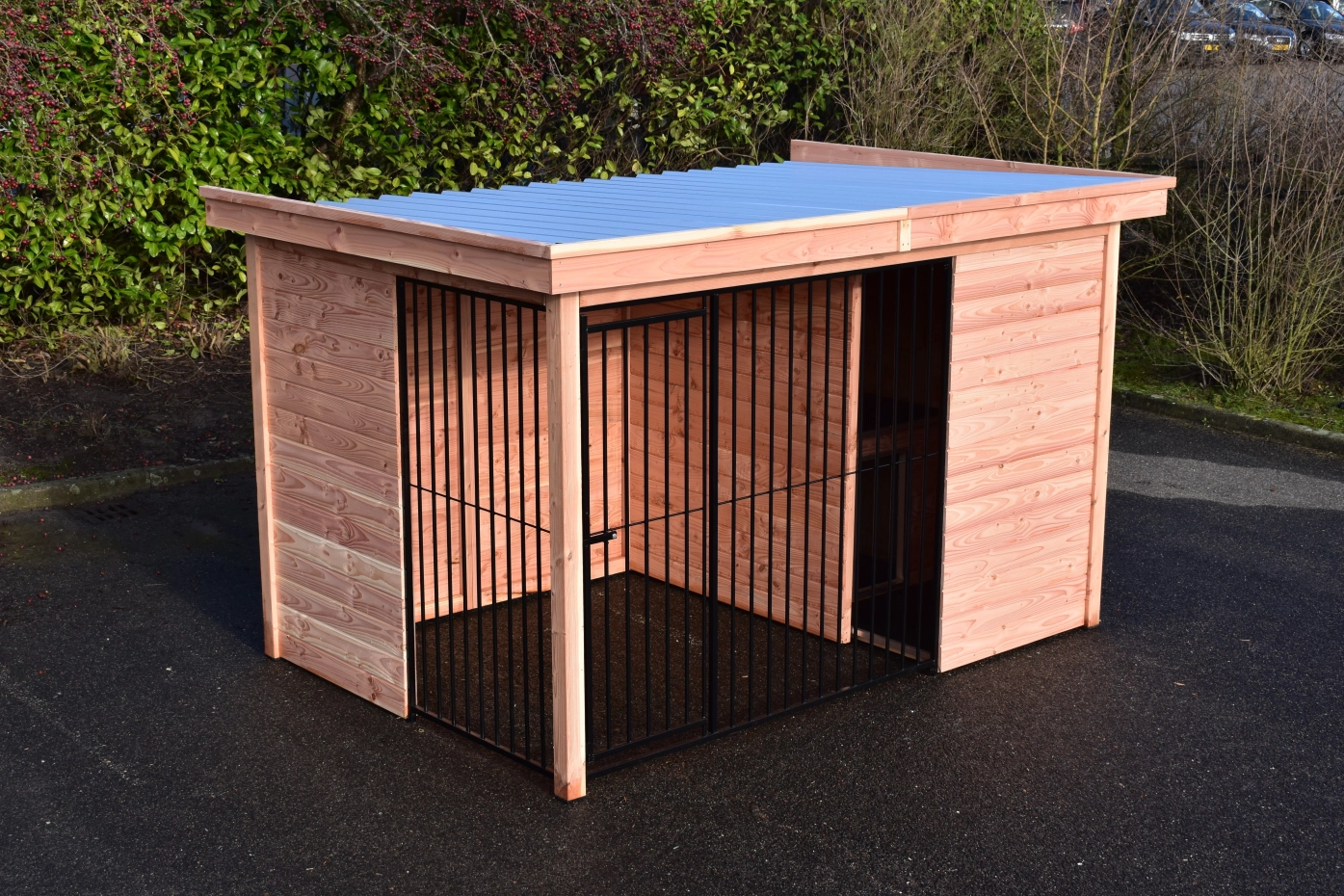 Deze Douglas hondenkennel Modul Forz is een duurzame en luxe keuze, gecombineerd met het hondenhok Easy. De kennel is opgebouwd uit stevige Douglas houtpanelen en een robuust houtkader. Het ruime nachthok Easy heeft een scharnierend dak, wat handig is voor onderhoud. De kennelwanden bestaan uit houten frames met rabatdelen, wat zorgt voor een solide en goed afgesloten verblijf. Het zwart stalen traliewerk vormt samen met het Douglashout een stijlvolle combinatie. Voorzien van stalen dakplaten met een vilten onderlaag om condens te voorkomen. Douglashout heeft een lange levensduur en hoeft niet behandeld te worden. Wel zal het hout vergrijzen, als u dit wilt voorkomen raden we aan om de kennel te beitsen.