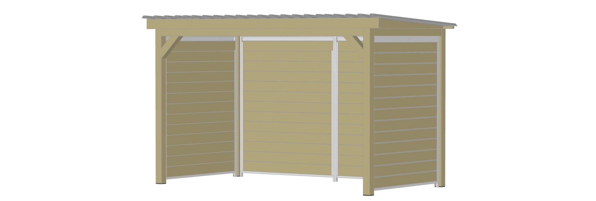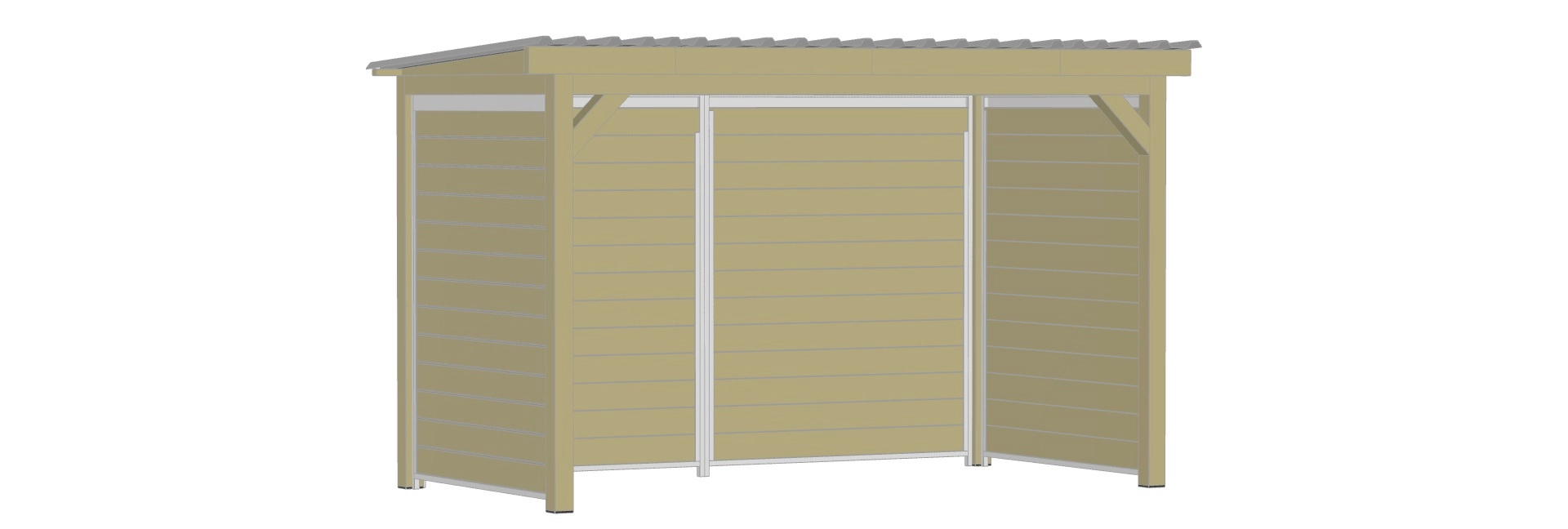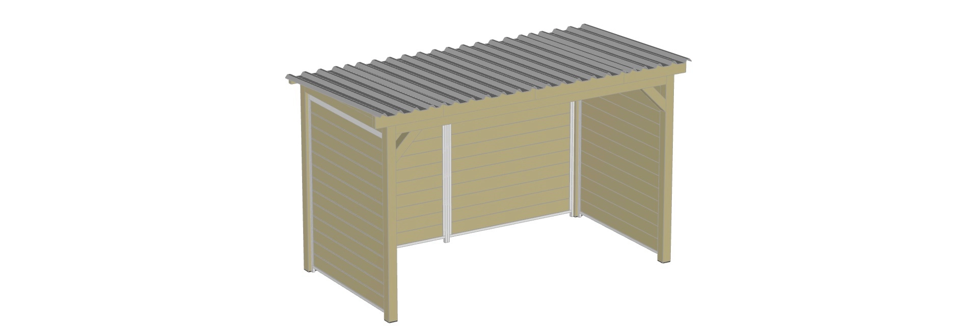 Fietsenhok Steady heeft een dichte achterkant en 2 dichte zijkanten. Dit fietsenhok heeft een buitenwerkse grondmaat van 318x168cm (BxD). Het fietsenhok wordt gemaakt van geïmpregneerd vurenhout en als dak heeft het stevige, stalen dakplaten (aluzink).