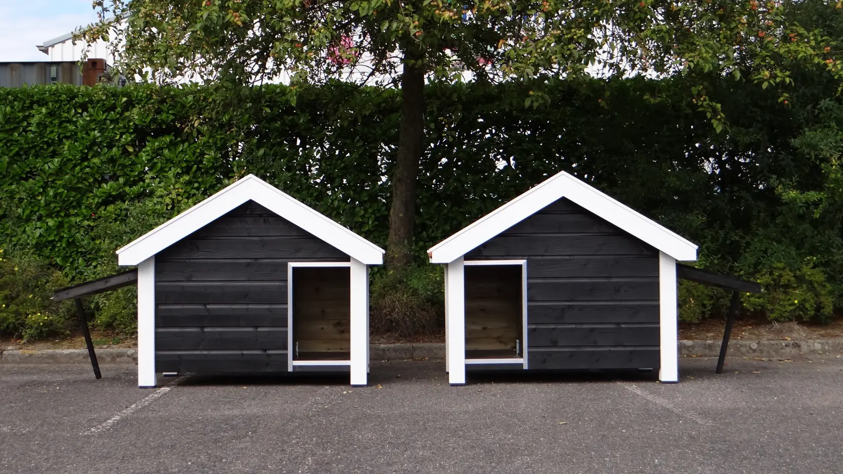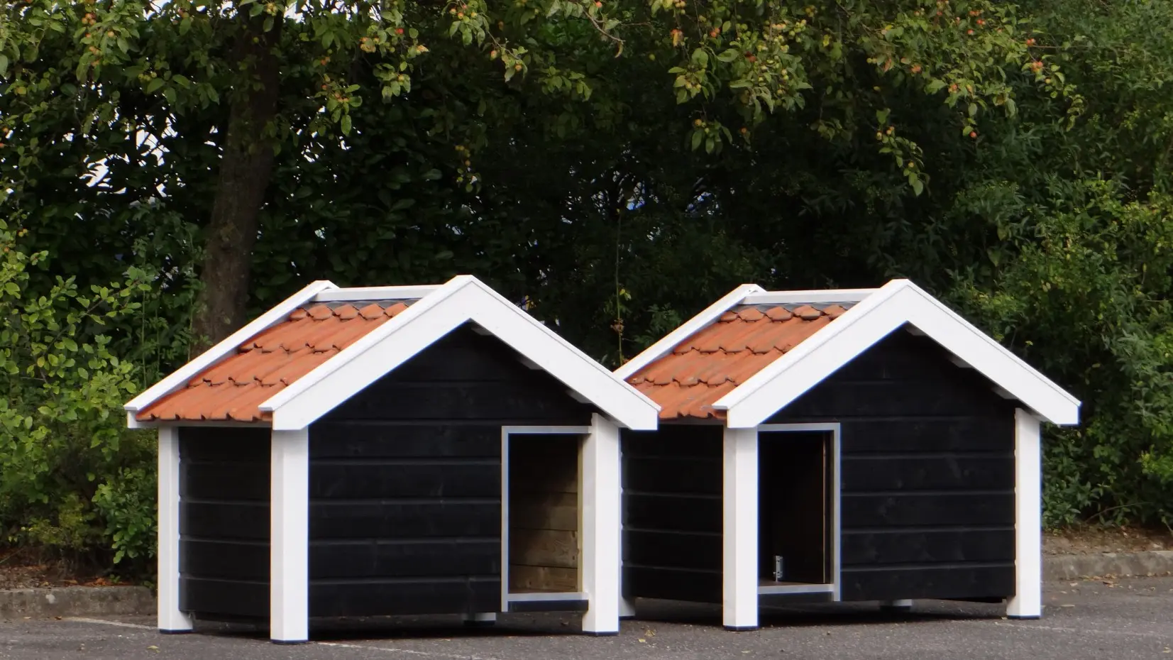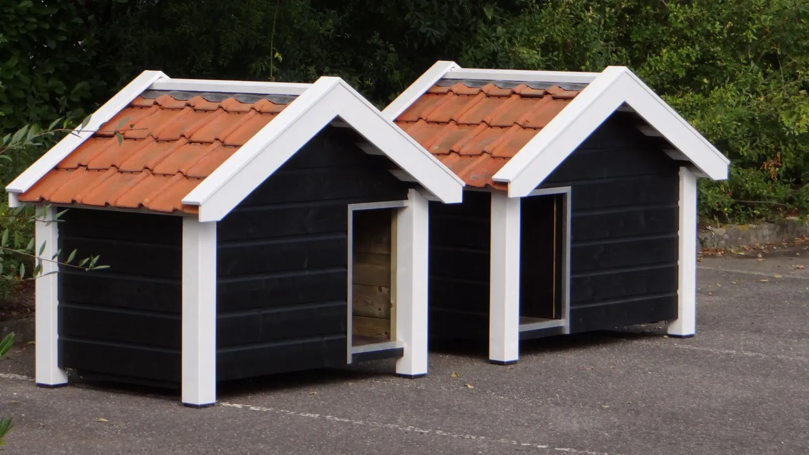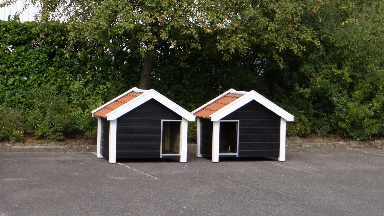 Twee hondenhokken model Reno in spiegelbeeld gemaakt, van geïmpregneerd hout. Daarna zwart-wit gebeitst en voorzien van oranje dakpannen. Top kwaliteit hondenhokken die gemaakt zijn door onze eigen timmermannen. Hier gaan degelijkheid, design, duurzaamheid en gebruiksgemak samen. De bodem van dit hondenhok is gemaakt van 15 mm dik betonmultiplex met een harde antislip laag. Om beschadigen tegen te gaan is de ingang voorzien van stevig aluminium. De hokken zijn eenvoudig uit te breiden met een passende vlonder aan de voorkant.