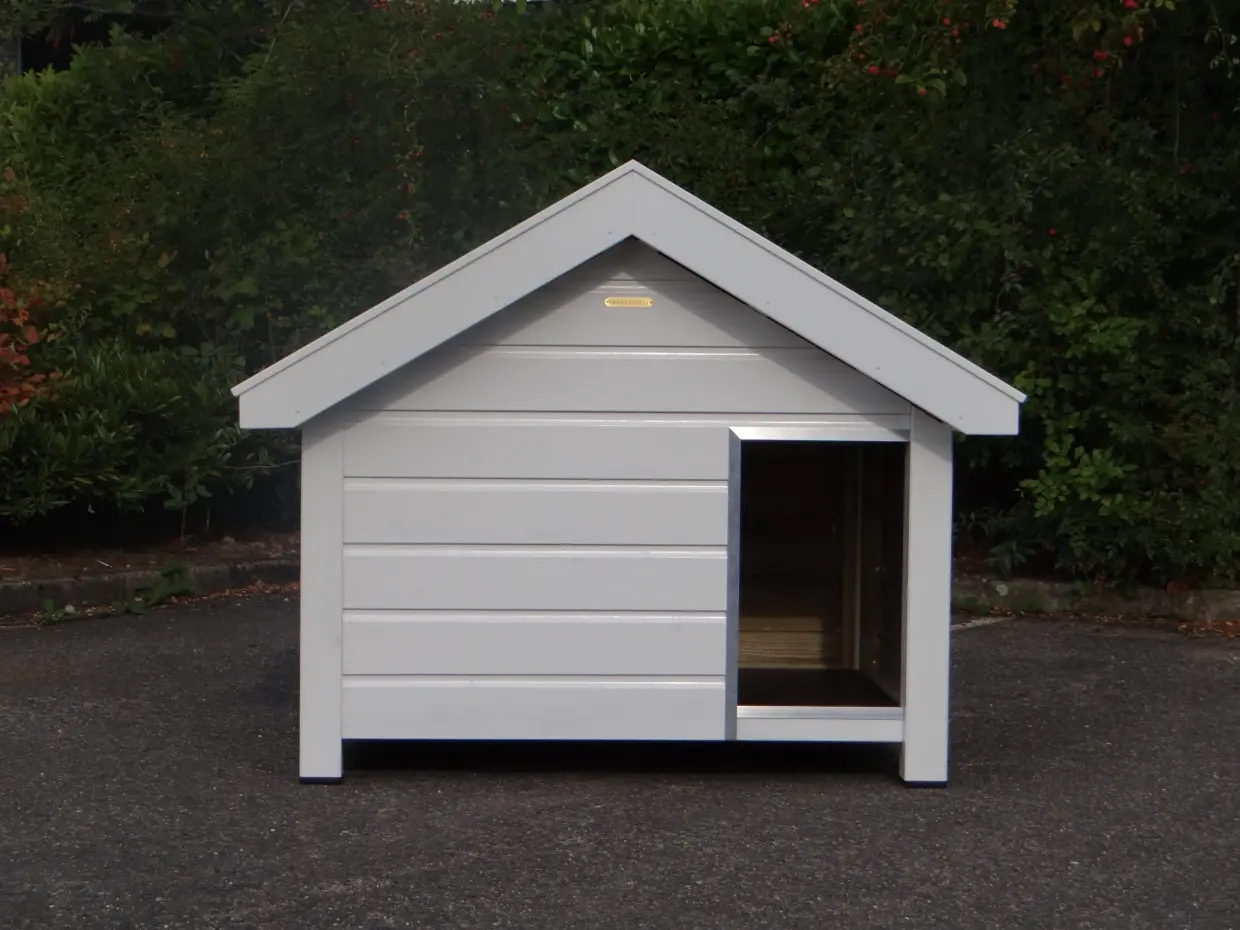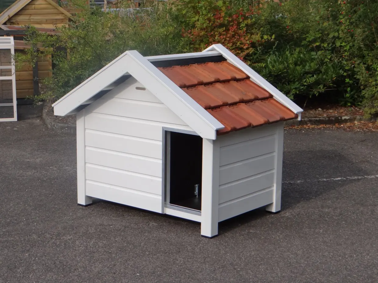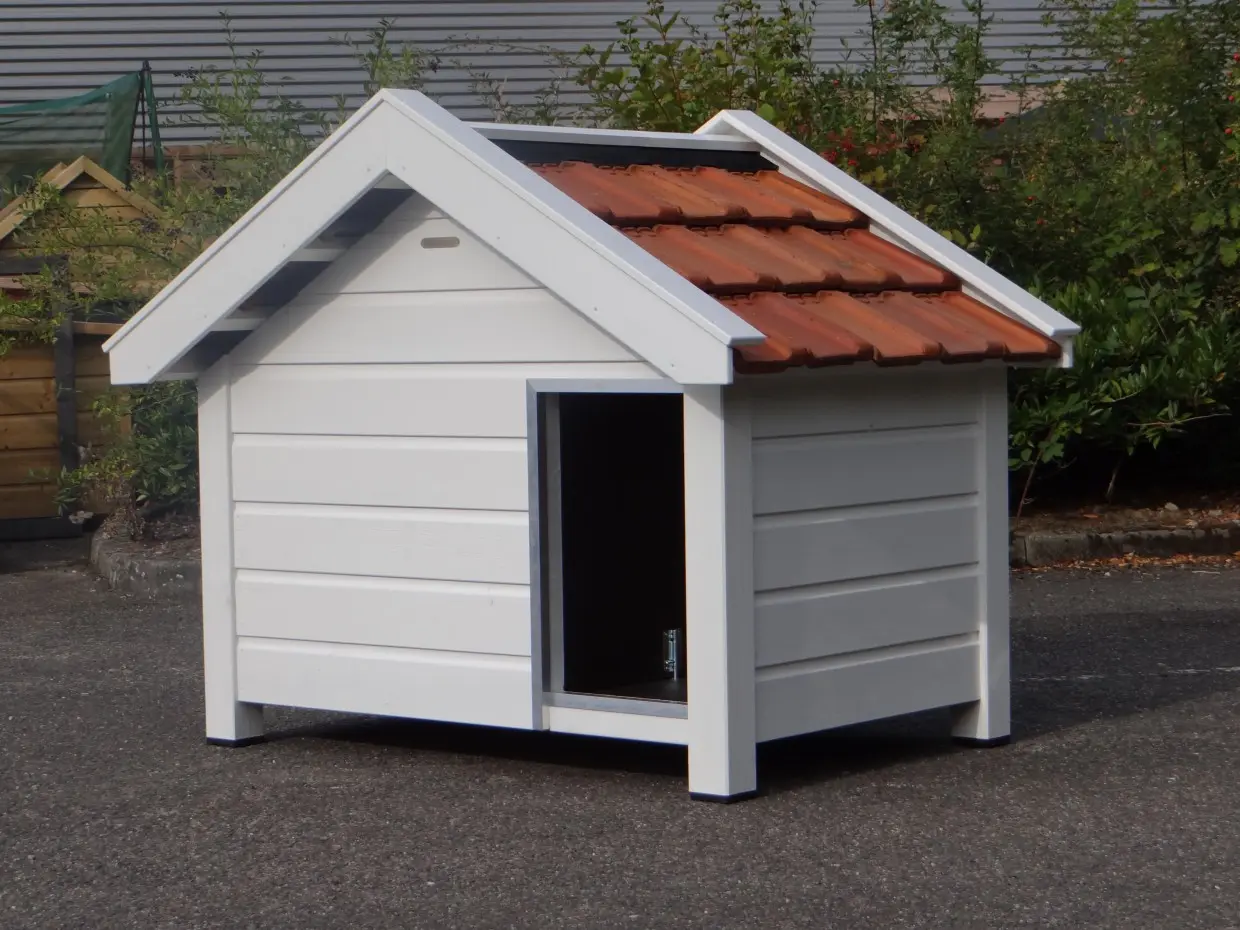 Hondenhok Reno wit/wit is een schitterend, uniek hondenhok. Dit witte hondenhok is gemaakt van geïmpregneerd vurenhout, gecombineerd met betonplex. Bovenop het hok liggen echte dakpannen. De buitenwerkse afmetingen zijn 160x106x123cm (BxDxH). Hondenhok Reno is geschikt voor bijv. een Keeshond, Labradoodle of Pomsky.