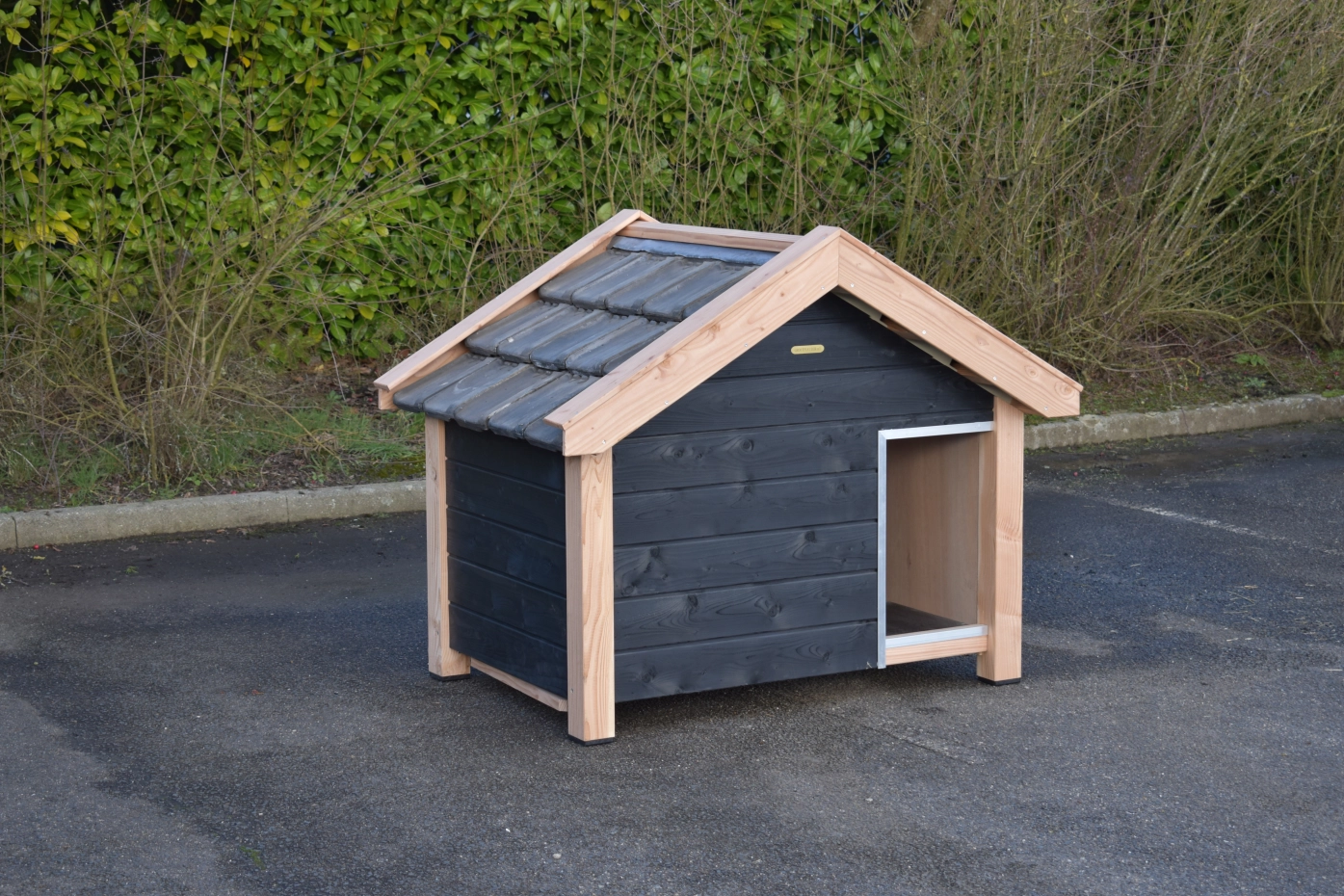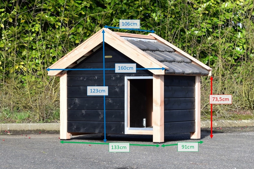 Hondenhok Reno Zwart/Douglas geïsoleerd is een mooi en robuust hondenhok. Het hondenhok is gemaakt van duurzaam hout en voorzien van betonplex vloer en echte oude dakpannen. Zeer handig in gebruik en comfortabel. De geïsoleerde wanden zijn maar liefst 7 cm dik. Buitenwerkse afmetingen: 160x106x123cm (BxDxH). Top kwaliteit!