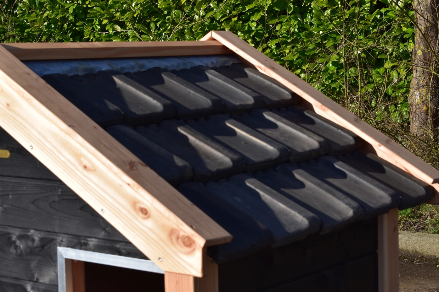 - Met keramische dakpannen: om het hondenhok extra charme te geven worden 2e hands restauratie dakpannen gebruikt