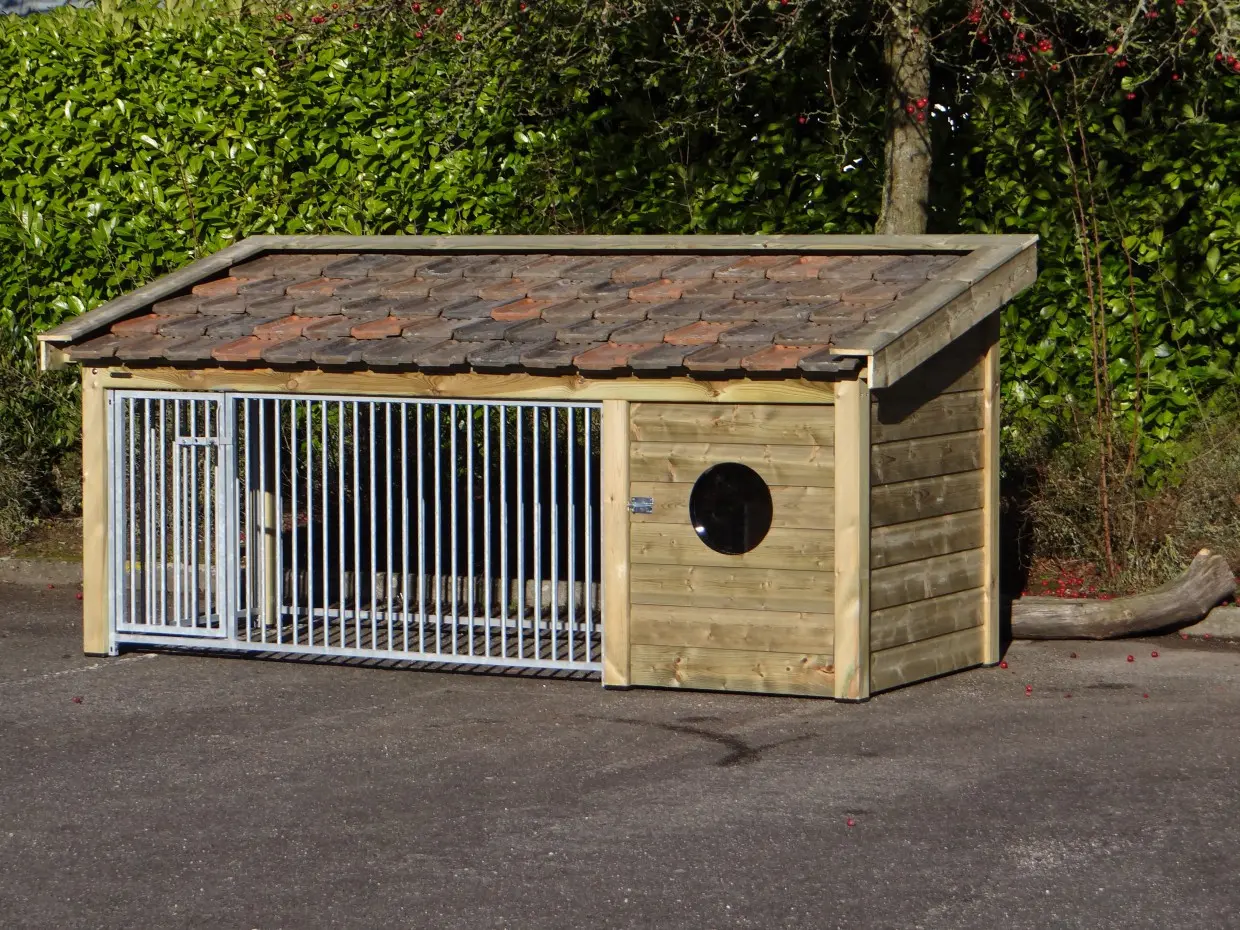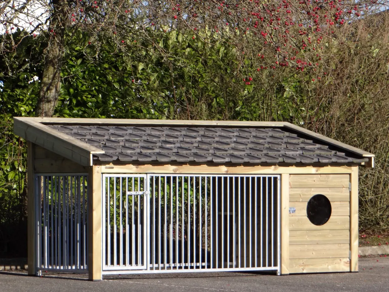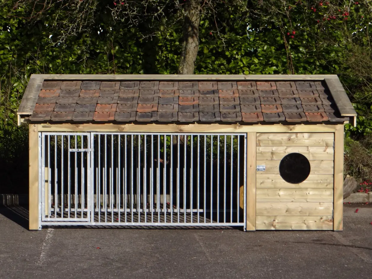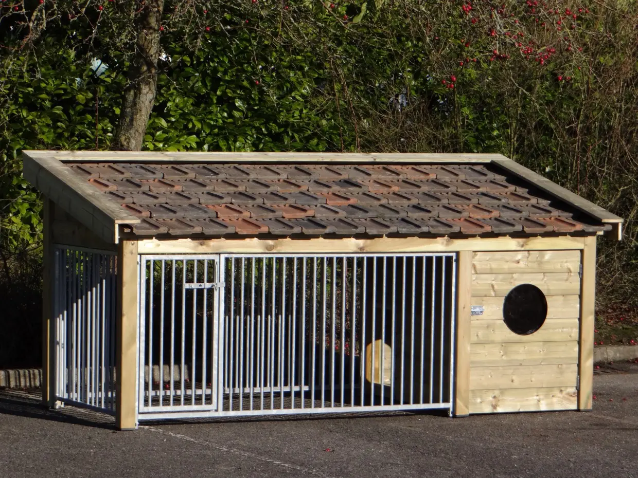 Hondenren Roxy 3 met een ingebouwd nachthok en een open ren onder 1 dak. Het dak is gemaakt van keramische dakpannen, en u heeft daarbij keuze uit 3 kleuren. Al het hout is verduurzaamd vuren hout zodat u er geen onderhoud aan hebt. De vloer in het nachthok is van Beton-multiplex met antisliplaag kan dus gemakkelijk schoon gehouden worden. Met deze top kwaliteit kennel geeft u uw hond een fijn en prachtig buitenverblijf.