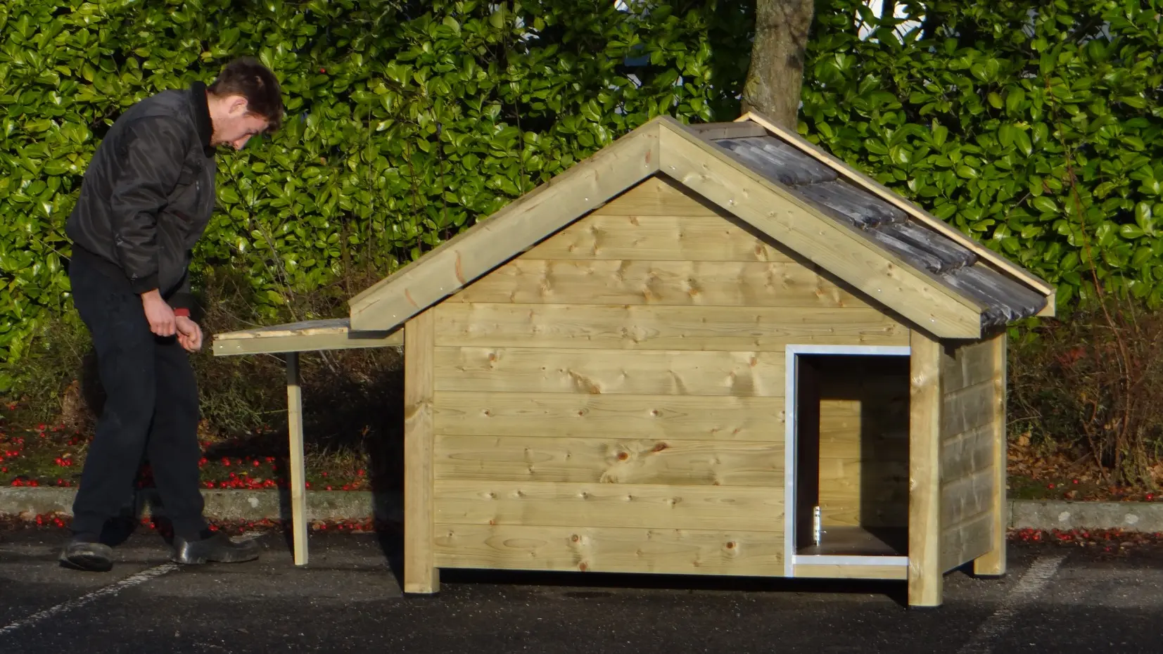 Hondenhok Snuf Geïsoleerd is een groot hondenhok. Het hondenhok is gemaakt van geïmpregneerd vurenhout in combinatie met betonplex en echte dakpannen. Zeer handig en comfortabel! De geïsoleerde wanden zijn maar liefst 7cm dik. Buitenwerkse afmetingen ca: 193x134x143cm (BxDxH). Geïsoleerd, houten hondenhok van top-kwaliteit!