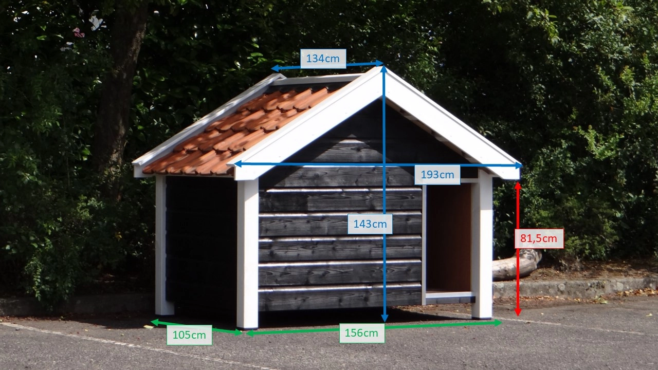 Hondenhok Snuf is een groot hoogwaardig en oerdegelijk hondenhok. Het hondenhok is gemaakt van geimpregneerd vurenhout in combinatie met betonplex en echte dakpannen, dus op en top duurzaamheid! Helemaal gemaakt in de stijl van Zeeuwse boeren schuren. Ook aan gebruiksgemak is gedacht. Het tochtschot is draaibaar, zodat het hok goed toegankelijk is voor het schoonmaken. Daar komt bij dat 1 zijkant compleet gekanteld kan worden. Dit maakt het reinigen met de tuinslang, bezem, of hogedrukspuit eenvoudig mogelijk. Door de zijkant open te zetten tijdens een hete zomerdag, blijft het ook nog eens lekker behaaglijk voor uw hond. Zeer handig, comfortabel en duurzaam! Ook is dit hok beschikbaar met isolatie. Houtdikte van de wanden en vloer is 18mm. Buitenwerkse afmetingen ca: 193x134x143cm (BxDxH). Dit hondenhok is onder andere geschikt voor een Boxer, Duitse herder en de Mechelse herder.