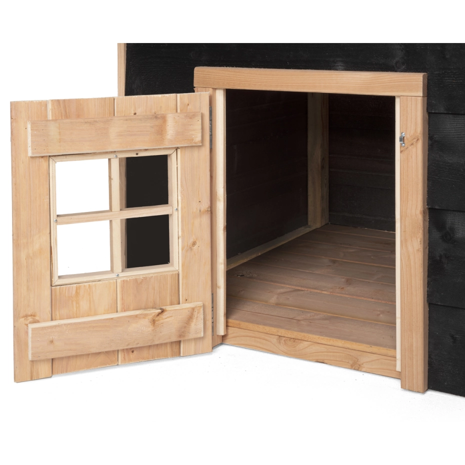 - Dit dierenverblijf wordt gemaakt van een geïmpregneerd grenen frame. De afwerking is met Douglashout en zwarte potdeksel planken. Dat maakt het hok onderhoudsvrij en zorgt voor een lange levensduur