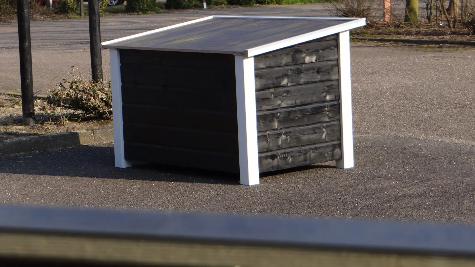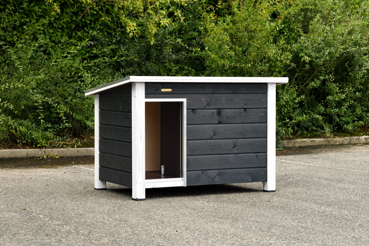 Hondenhok voor buiten kopen? Hondenhok Wolf zwart/wit is een mooi, authentiek hondenhok voor buiten. Het wordt door onze eigen timmermannen gemaakt, van geïmpregneerd vurenhout. Hierdoor heeft u de komende jaren geen onderhoud aan dit hondenhok. Het dak van dit prachtige hondenverblijf heeft scharnieren aan de achterkant en kan open gedaan worden.