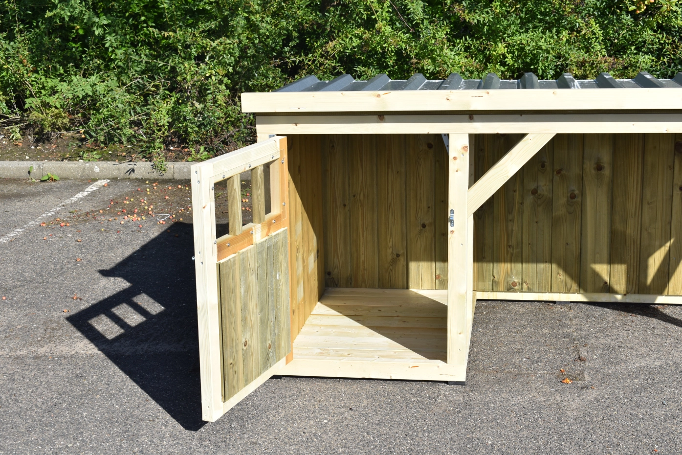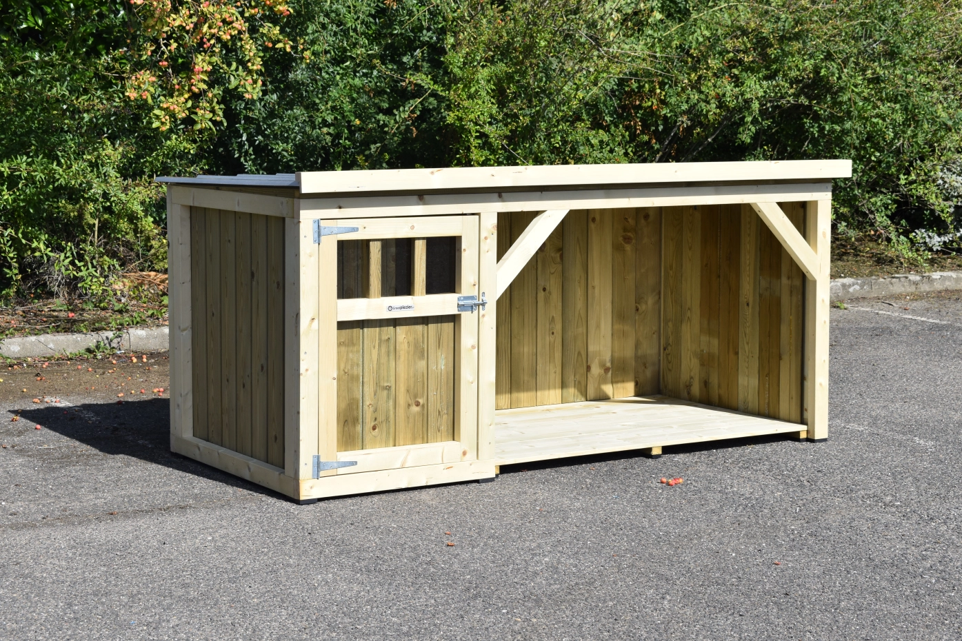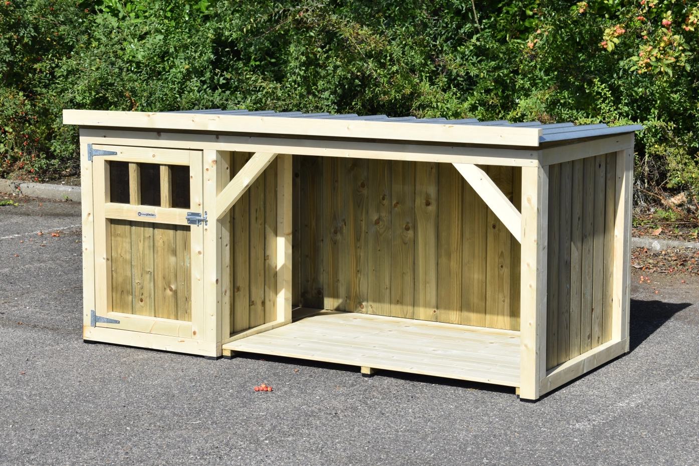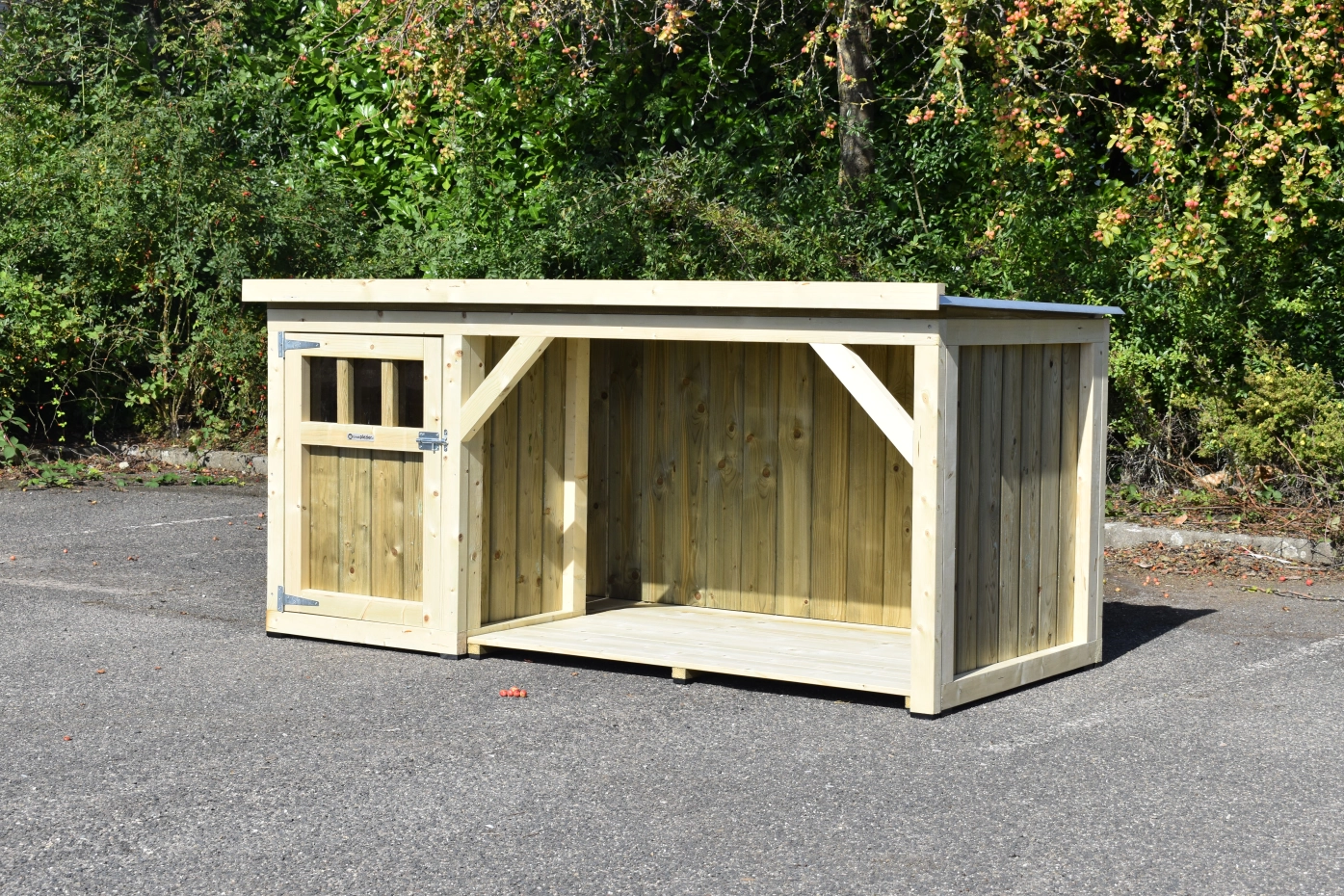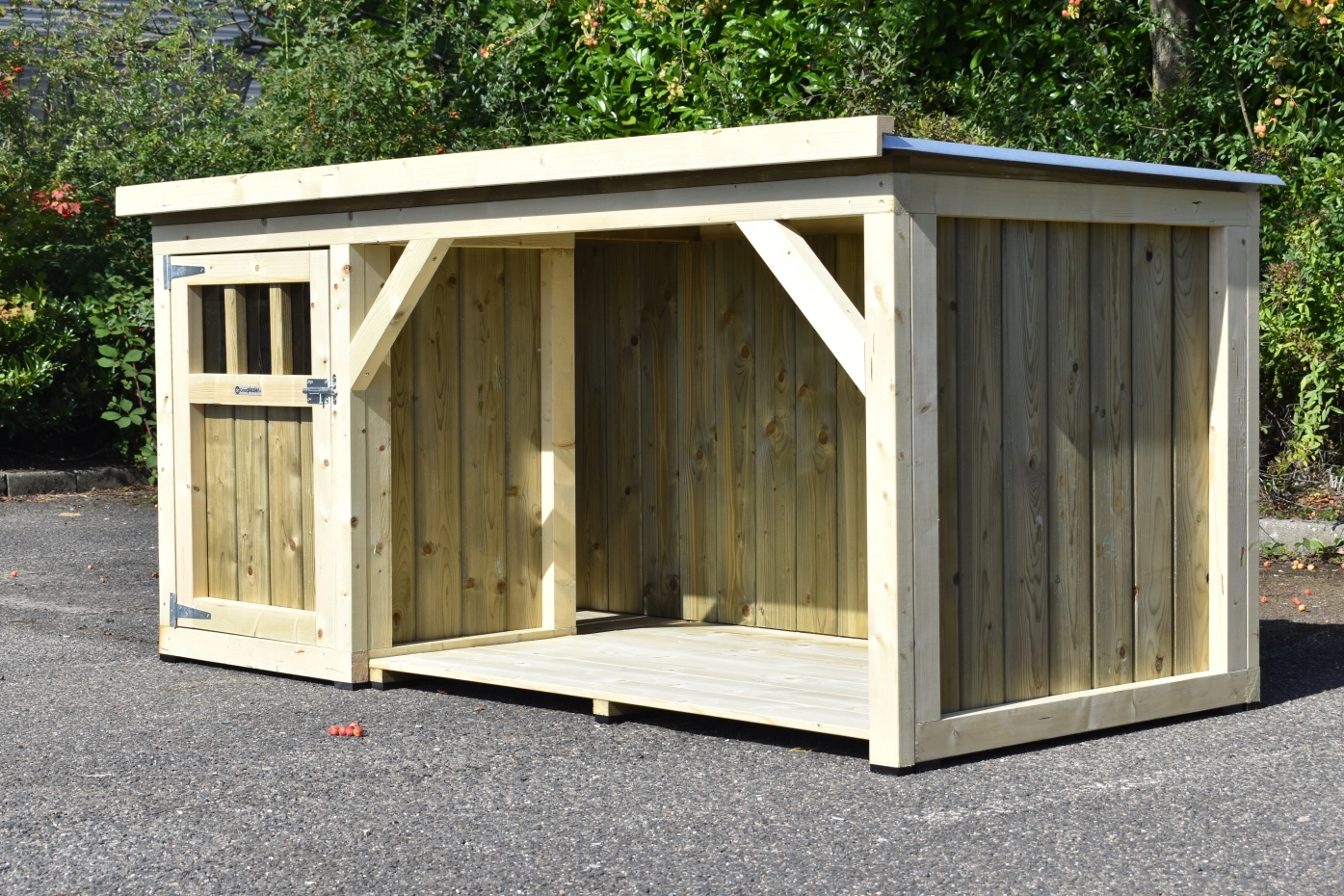 Hondenhok Isa 1 met overdekte veranda en vloer is een leuk en compact hondenhok voor grote en middelgrote honden. Het nachthok is voorzien van een ruime deur en een houten bodem. In de veranda kan de hond lekker droog buiten liggen. U kunt ook kiezen voor een vloer in de veranda. Omdat we het hok zelf maken en door het gebruik van top kwaliteit materialen, is het erg onderhoudsvrij.