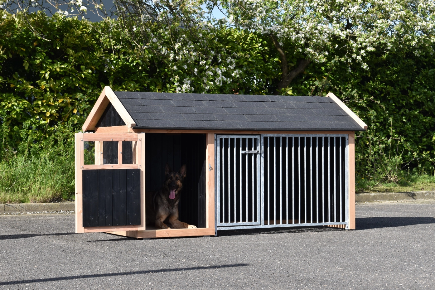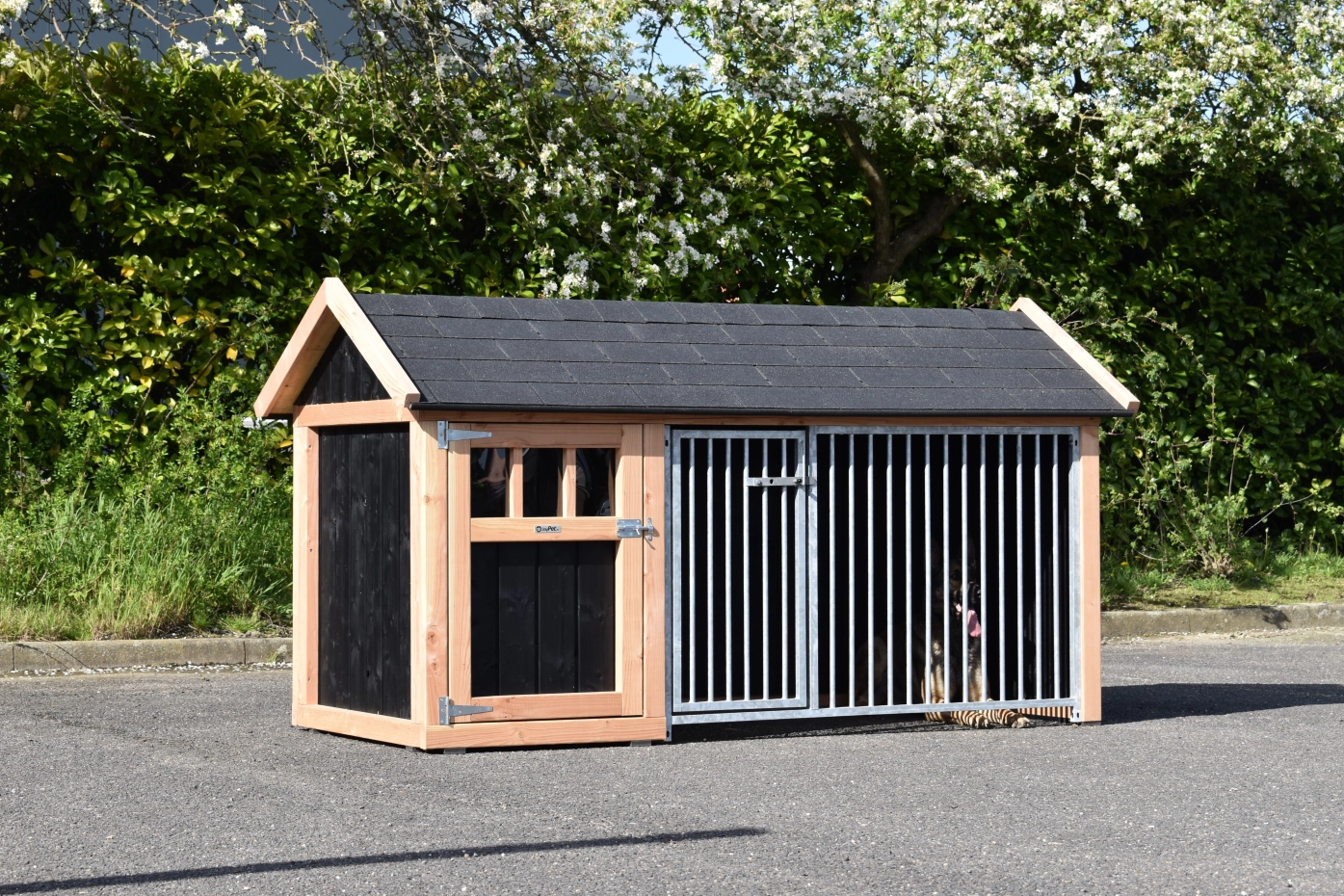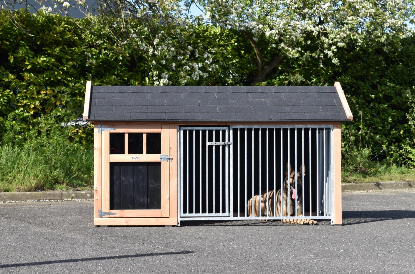 Hondenkennel Isabelle 1 met puntdak is geschikt voor grote tot middelgrote honden. Het puntdak met dakshingles maakt er een serieus hondenschuurtje van. Het nachthok is voorzien van een ruime deur zodat u makkelijk bij uw hond kunt. Ook in de ren is een deur voorzien. Tussen het nachthok en de ren is een opening voorzien van 38x93cm (BxD). Voor deze opening kunt u ook een deurtje meebestellen zodat u het nachthok en de ren kunt afsluiten.