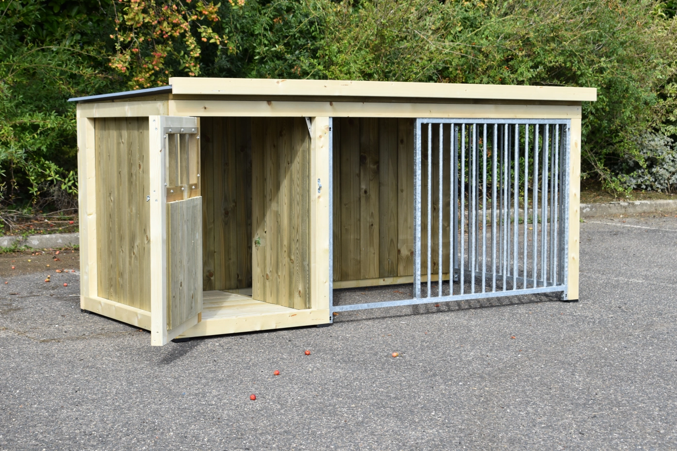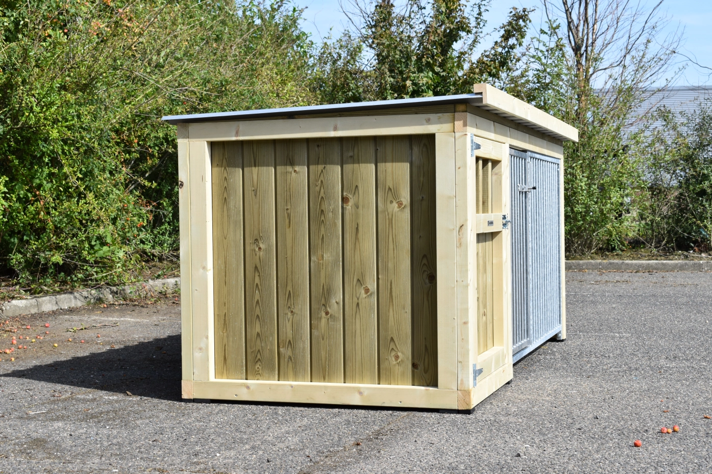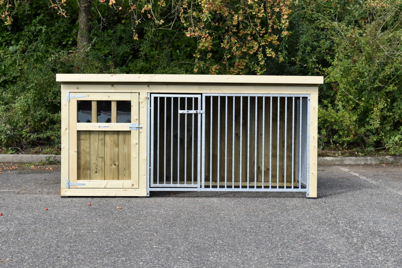 - Dit type 2 is voorzien van 2 traliepanelen: 1 aan de voorkant (met deur) en 1 aan de zijkant van de ren.