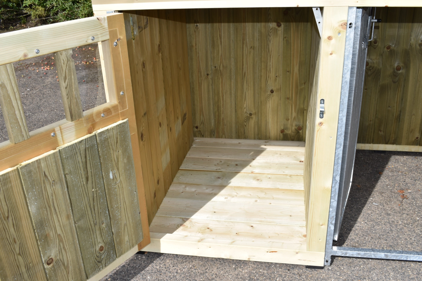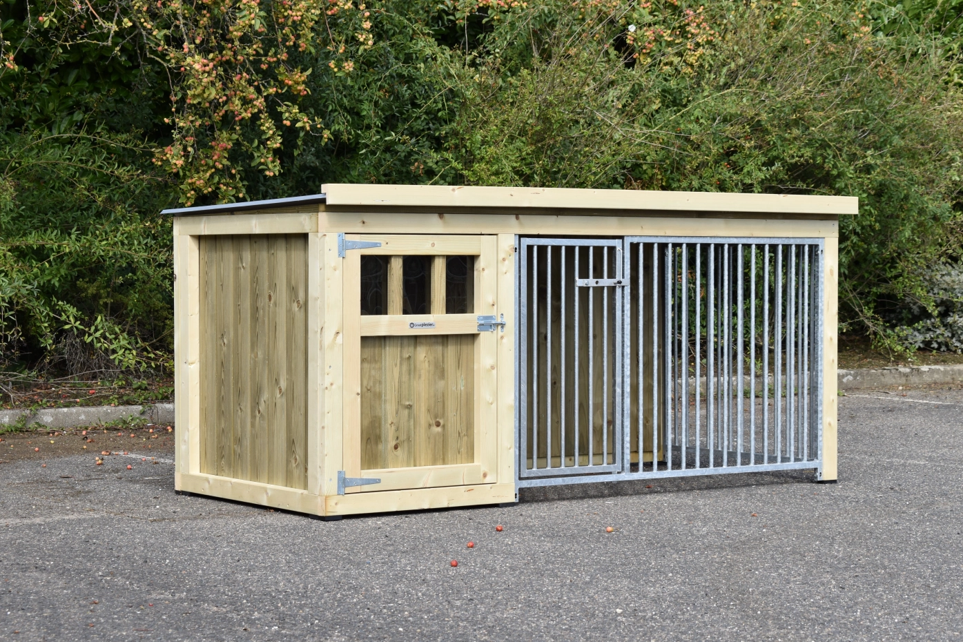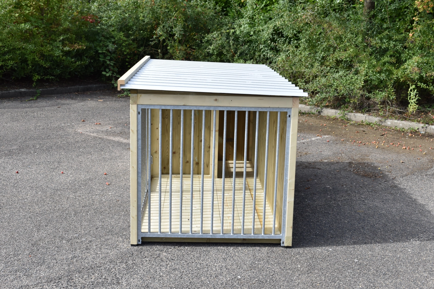 - Dit type 2 is voorzien van 2 traliepanelen: 1 aan de voorkant (met deur) en 1 aan de zijkant van de ren.
