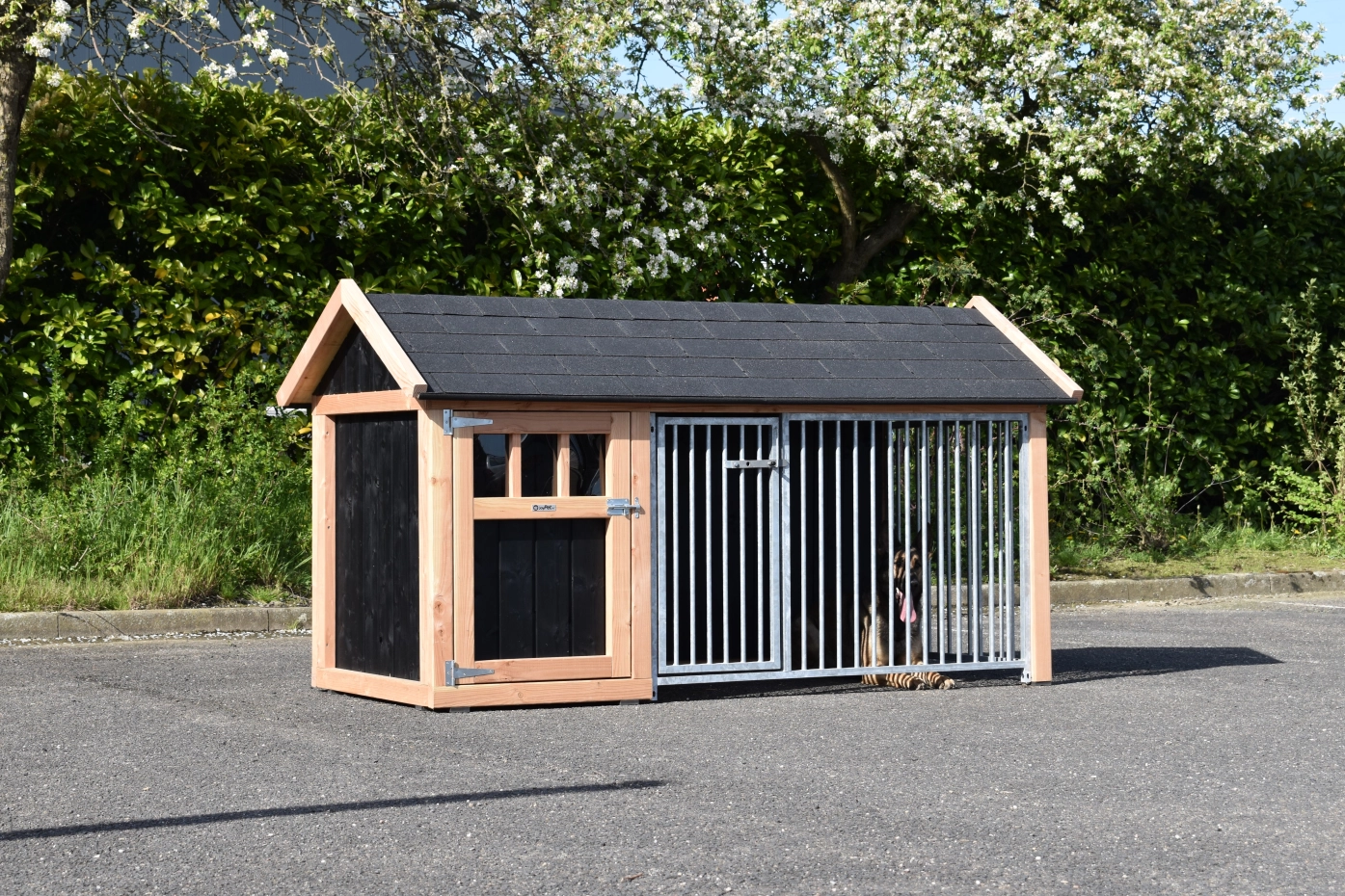 Hondenkennel Isabelle 2 met puntdak is geschikt voor grote tot middelgrote honden. Het puntdak met dakshingles maakt er een serieus hondenschuurtje van. Het nachthok is voorzien van een ruime deur zodat u makkelijk bij uw hond kunt. Ook in de ren is een deur voorzien. Tussen het nachthok en de ren is een opening voorzien van 38x93cm (BxD). Voor deze opening kunt u ook een deurtje meebestellen zodat u het nachthok en de ren kunt afsluiten.