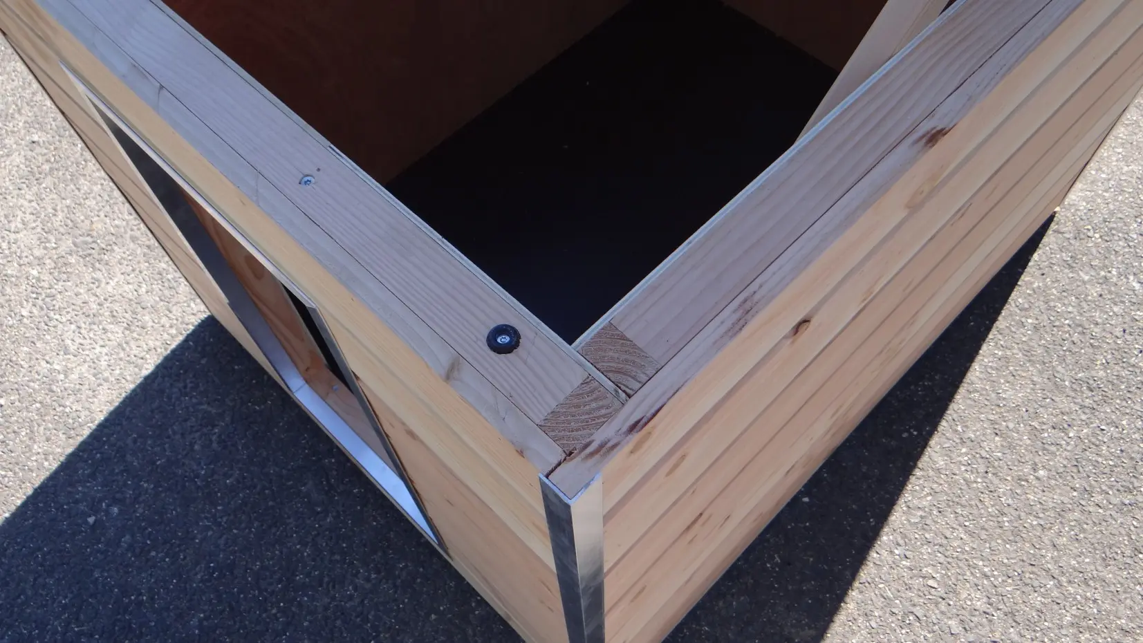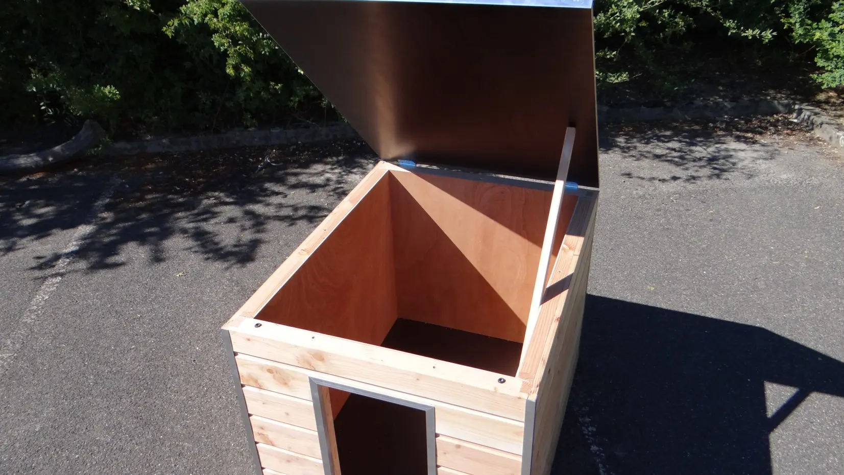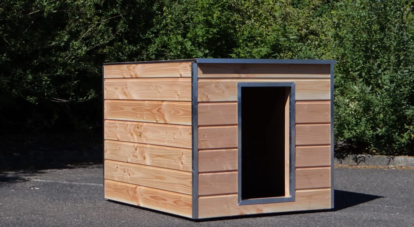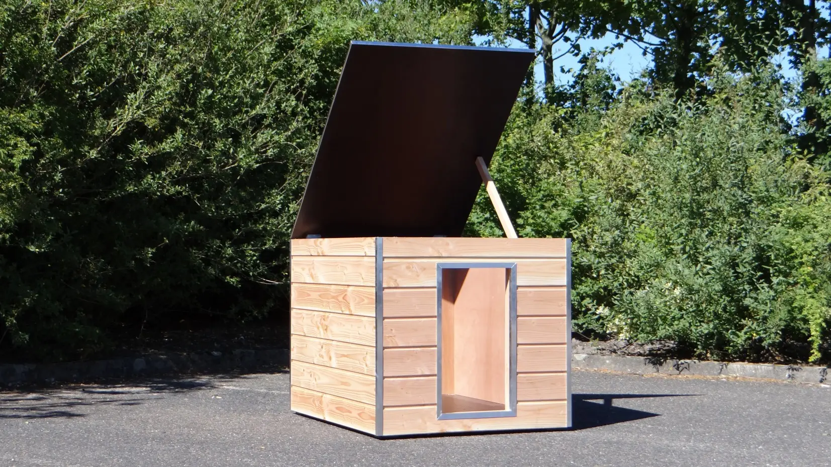 Nachthok Cube geisoleerd in Douglas hout 100x125cm is mooi hok om in een kennel te plaatsen. Rondom voorzien van rabat en aluminium hoekprofielen. Voorzien van betonplex vloer en dak. Rondom 3 cm geïsoleerd met PIR isolatie. Ook de ingang is voorzien van aluminium beschermhoeken. Zeer solide en praktisch. Voorzien van handig scharnier-dak. Afmeting opening is 65x35cm.