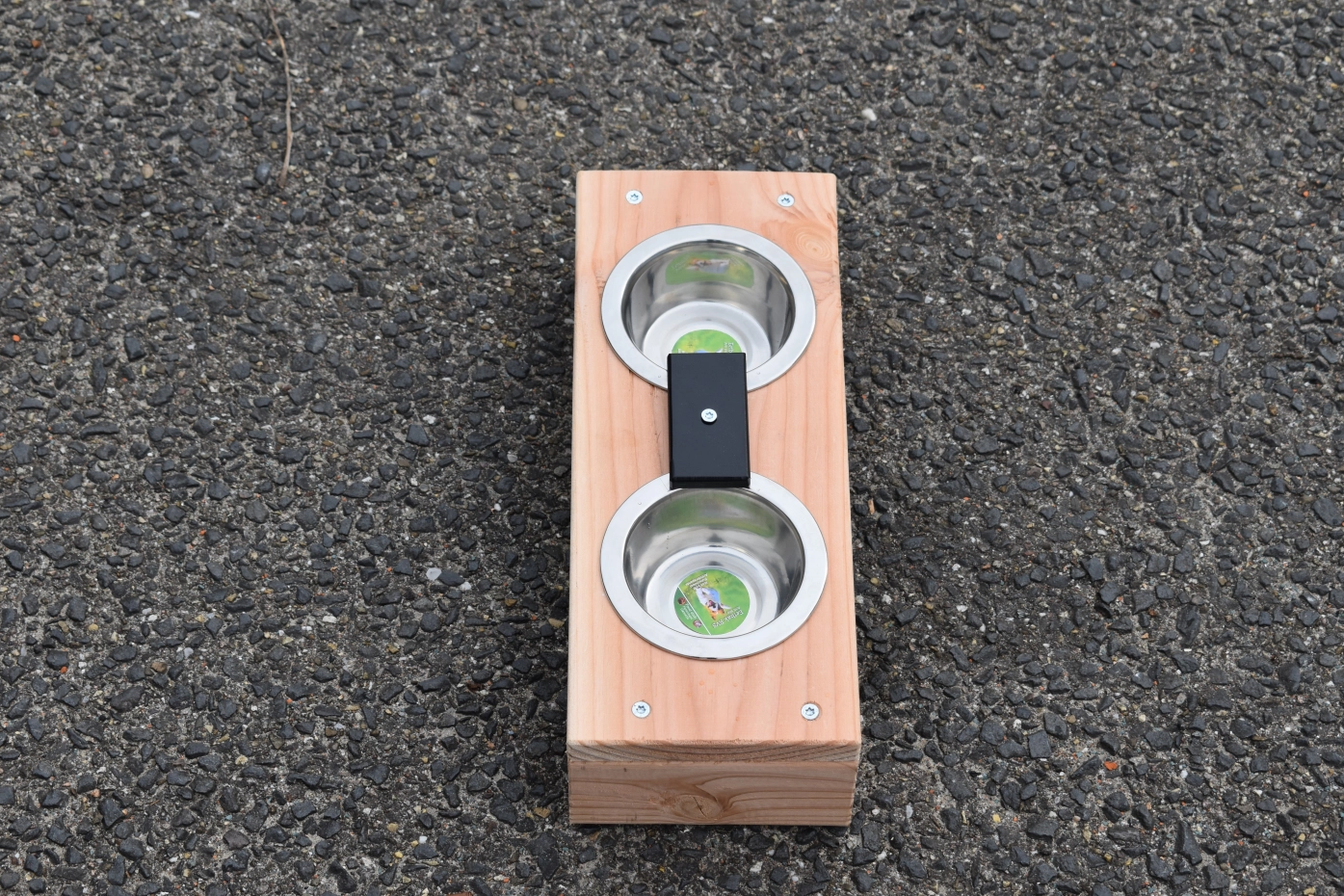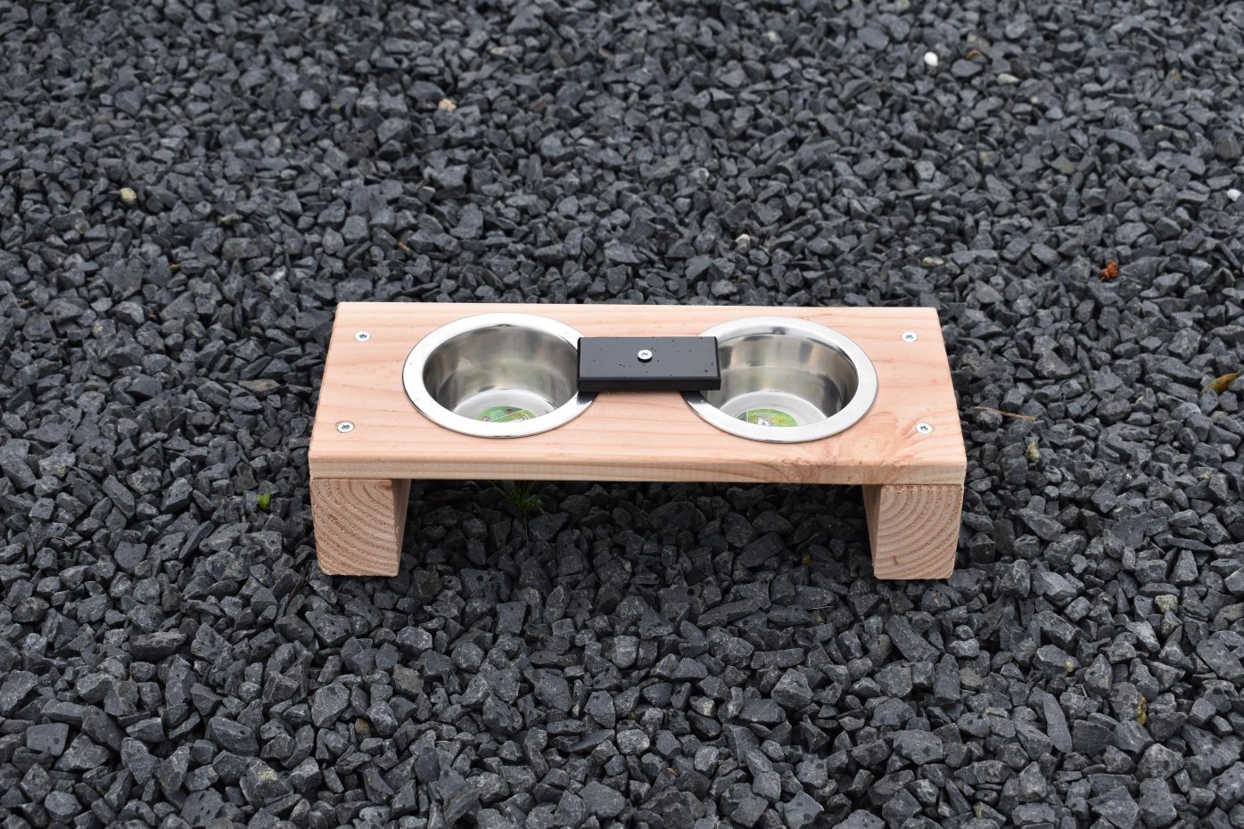 Dit duurzame voederstel is geschikt voor: katten, konijnen, puppy's of vogels. De RVS uitneembare voerbakjes hebben een doorsnede van 10,5cm. Het voederstel is gemaakt van onbehandeld douglashout. Wat maakt dit voederstel uniek? Het voederstel is voorzien van een blokje, om te voorkomen dat de dieren de voerbakjes uit het voederstel krijgen. Het voederstel is ook groter verkrijgbaar, deze heeft een afmeting van 40x14cm.
