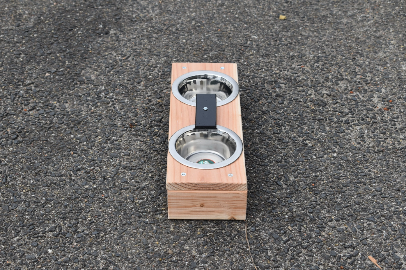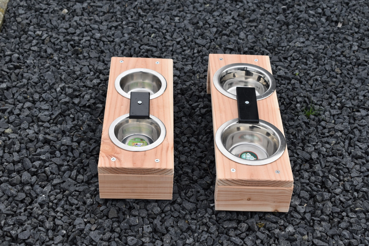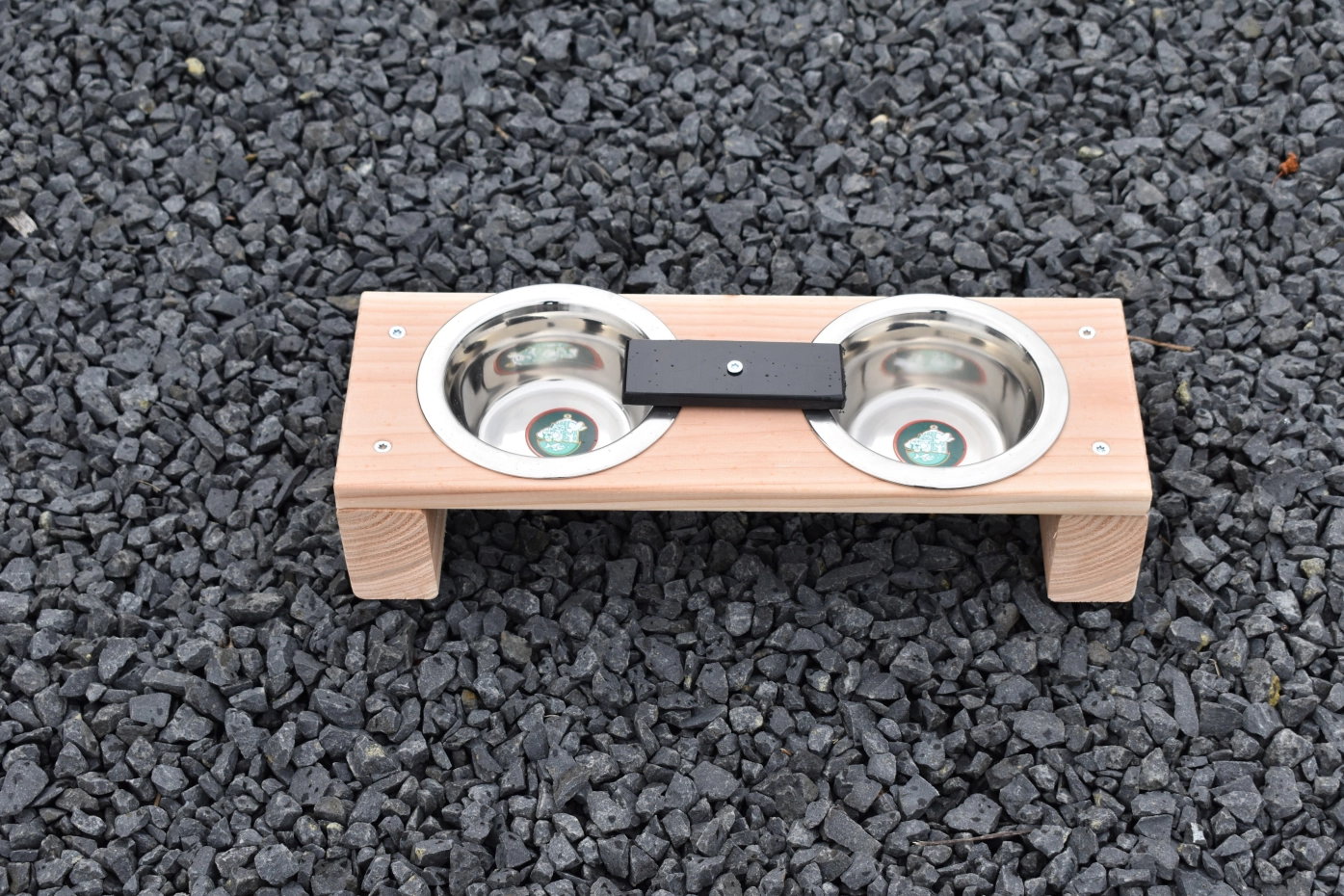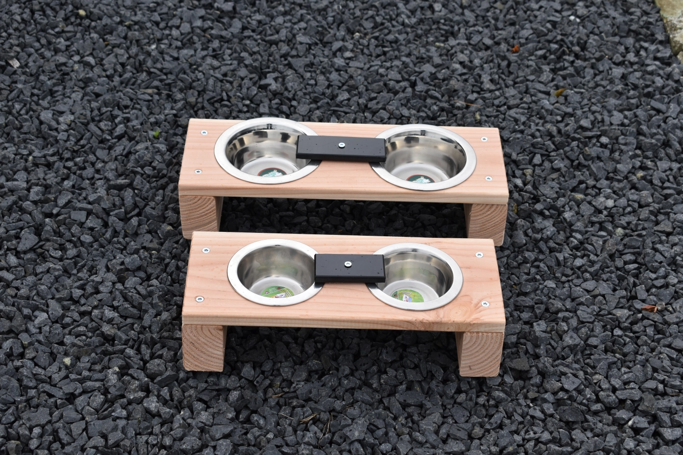 Dit duurzame voederstel is geschikt voor: katten, konijnen, puppy's of vogels. De RVS uitneembare voerbakjes hebben een doorsnede van 13cm. Het voederstel is gemaakt van onbehandeld douglashout. Wat maakt dit voederstel uniek? Het voederstel is voorzien van een blokje, om te voorkomen dat de dieren de voerbakjes uit het voederstel krijgen. Het voederstel is ook kleiner verkrijgbaar, deze heeft een afmeting van 35x14cm.