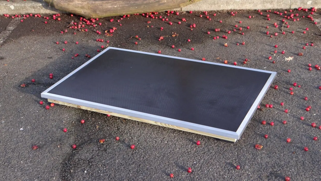 Vlonder Solide Large heeft een afmeting van 125x83cm. Het is een prachtige en supersterke vlonder die heel veel gebruikt wordt. De vlonders worden door onze eigen timmermannen gemaakt en zijn tot in detail afgewerkt. De vloer is van 15mm dik betonmultiplex met anti-slip. De vlonder heeft rondom een anti-bijt rand van aluminium. Aan de onderkant is de vlonder voorzien voorzien van kunststof blokjes van 15mm. De totale hoogte van de vlonder is 8cm.