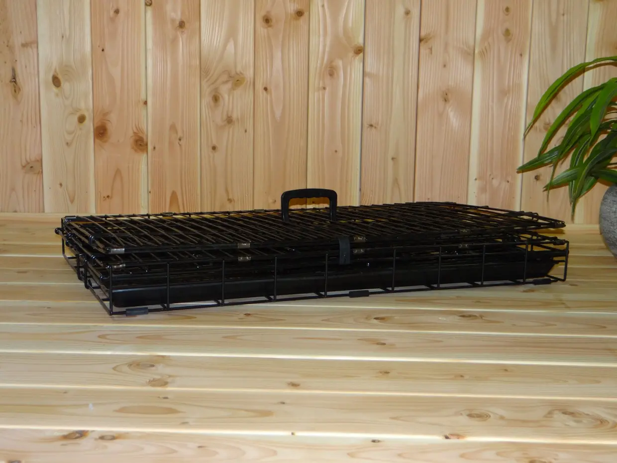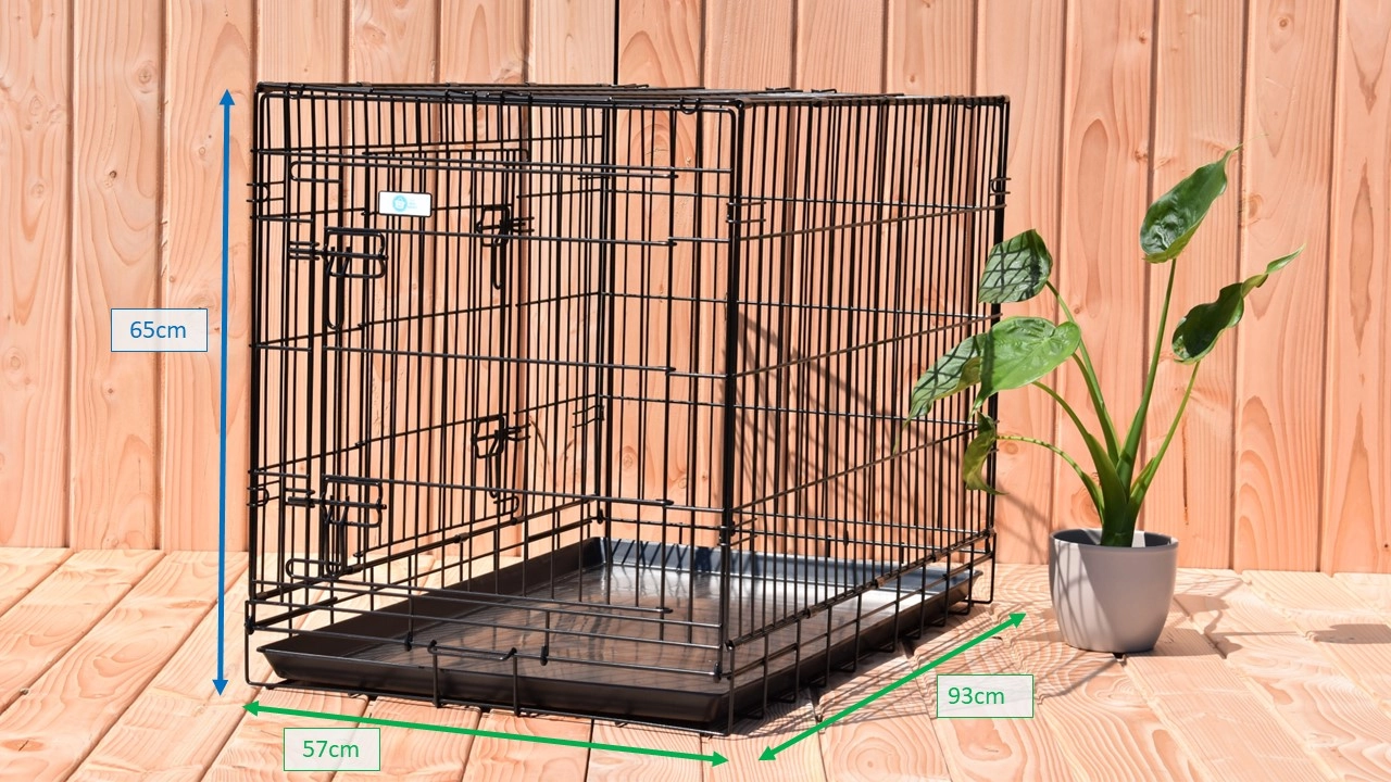 Stevige Hondenbench 2-deurs, 93cm. Onze stevige hondenbench met dikke, zwart gepoedercoate tralies, is voorzien van maar liefst 2 solide deuren met dubbele bench-sluitingen. Deze handige hondenbench is in een handomdraai op te vouwen en kan met het meegeleverde handvat gemakkelijk vervoerd worden. Door de uitneembare kunststof bak, is deze hondenbench goed schoon te maken. Onze bench wordt behalve voor honden, ook vaak gebruikt voor katten. De middelgrote hondenbench is geschikt voor honden zoals: American Staffordshire Terriër, Bulldog, Chow Chow, Cocker Spaniël, Engelse Setter, Engelse Springer Spaniël, Labradoodle, Pit Bull Terriër, Samojeed, Shar Pei en Siberische Husky. Onze zeer stevige hondenbench is leverbaar in 7 verschillende afmetingen: 48cm / 63cm / 78cm / [93cm] / 109cm / 124cm / 136cm.