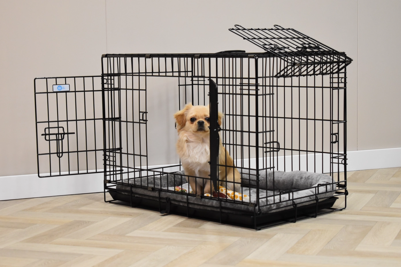 Stevige Hondenbench van 78x49cm en een hoogte van 56cm. Onze hondenbench met stevige, dikke, zwart gepoedercoate tralies is voorzien van 3 stevige deuren met schuif-/klapsluiting. Deze handige, opvouwbare hondenbench is tevens voorzien van rubber anti-slip voetjes. Ook heeft de hondenbench een uitneembare kunststof bak. Deze bench is bedoeld voor de wat kleinere hondenrassen: Beagle, Dwergschnauzer, Franse Bulldog, Pomsky, Welsh Springer Spaniel en Whippet.