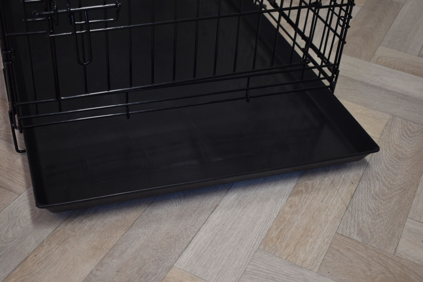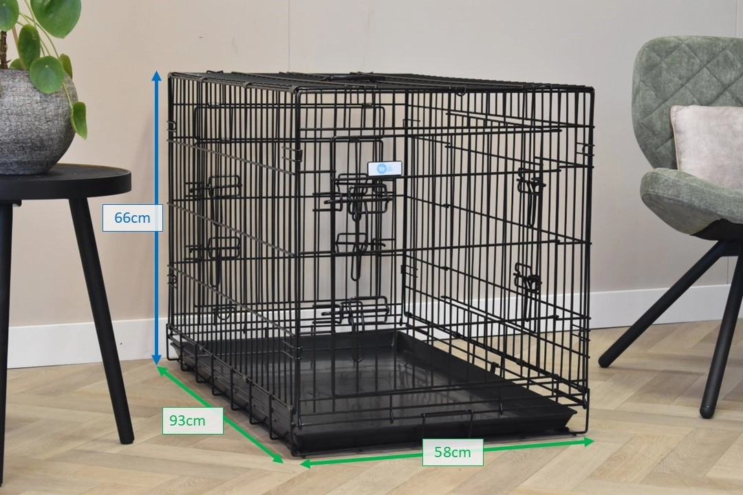 Stevige Hondenbench 3-deurs, 93cm. Onze stevige hondenbench met dikke, zwart gepoedercoate tralies, is voorzien van maar liefst 3 solide deuren met dubbele bench-sluitingen. Deze handige hondenbench is in een handomdraai op te vouwen en kan met het meegeleverde handvat gemakkelijk vervoerd worden. Door de uitneembare kunststof bak, is deze hondenbench goed schoon te maken. Onze bench wordt behalve voor honden, ook vaak gebruikt voor katten. De middelgrote hondenbench is geschikt voor honden zoals: American Staffordshire Terriër, Bulldog, Chow Chow, Cocker Spaniël, Engelse Setter, Engelse Springer Spaniël, Labradoodle, Pit Bull Terriër, Samojeed, Shar Pei en Siberische Husky. Onze zeer stevige hondenbench is leverbaar in 7 verschillende afmetingen: 48cm / 63cm / 78cm / [93cm] / 109cm / 124cm / 136cm.