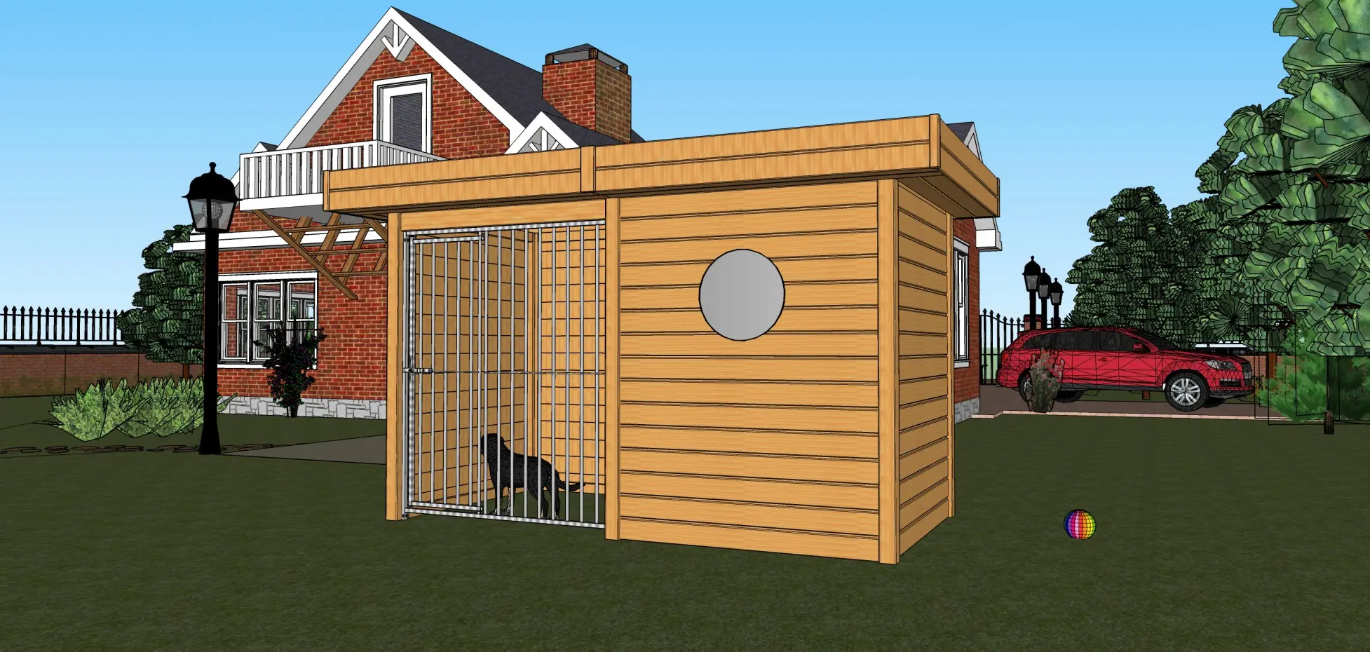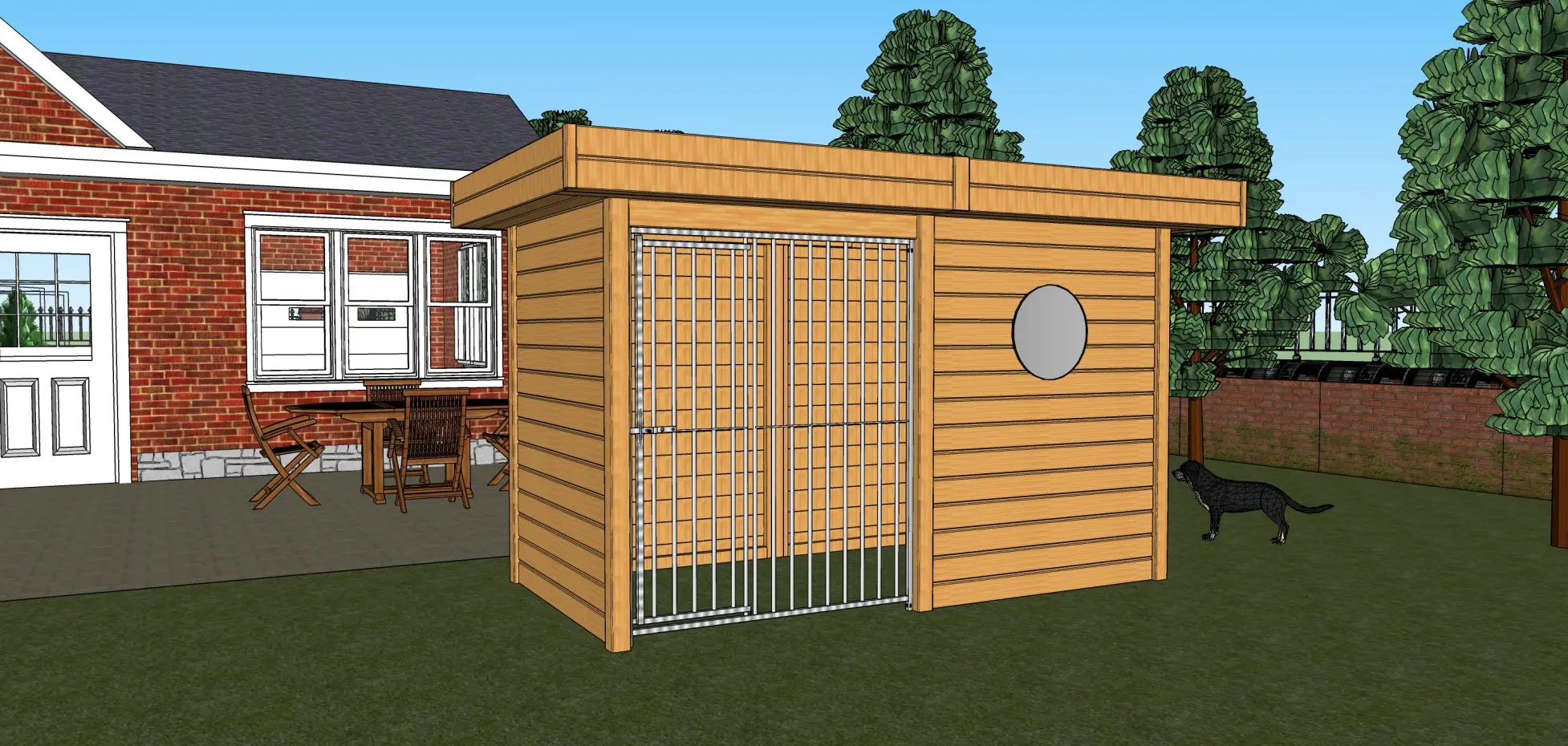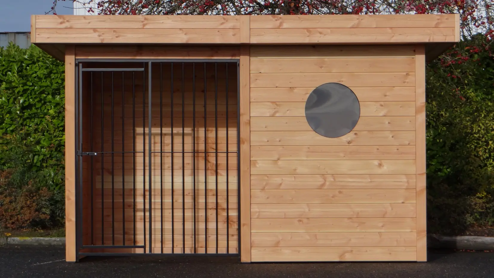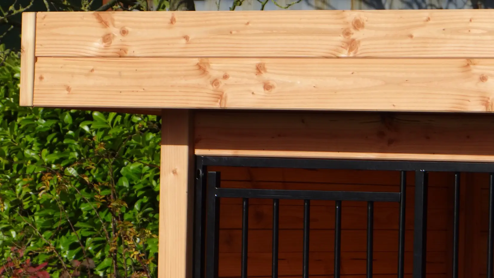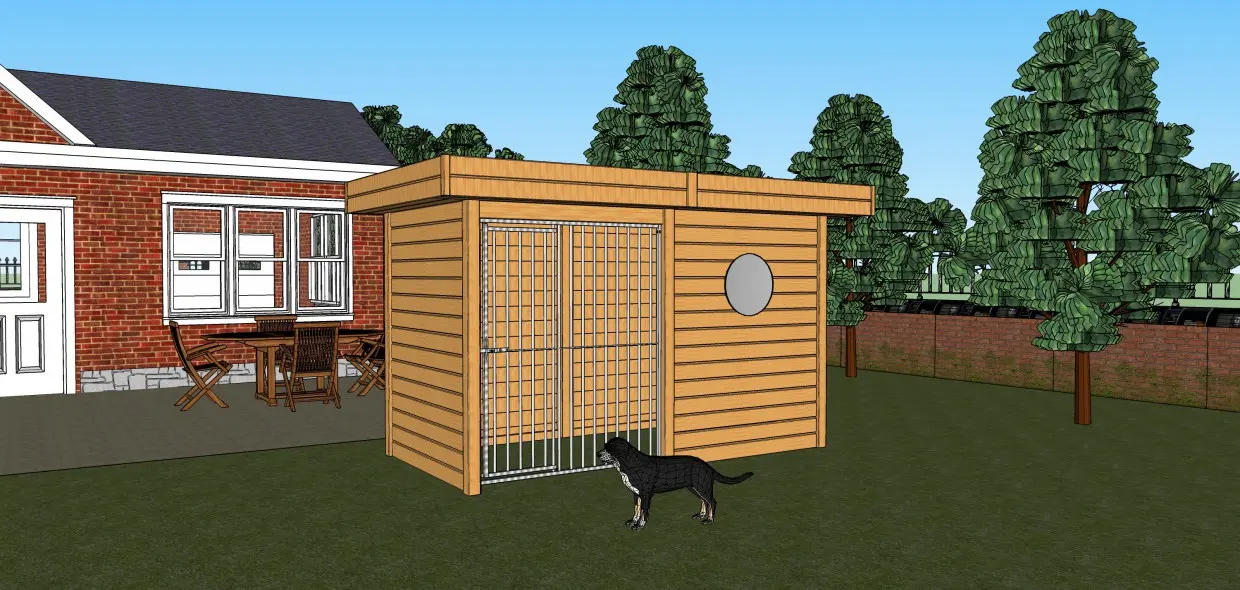 • Hondenkennel van douglashout, een mooi en duurzaam houtsoort dat zelfs onbehandeld geschikt is voor buiten. Wel zal het snel grijs worden, behalve als u het behandelt met beits of douglasolie.