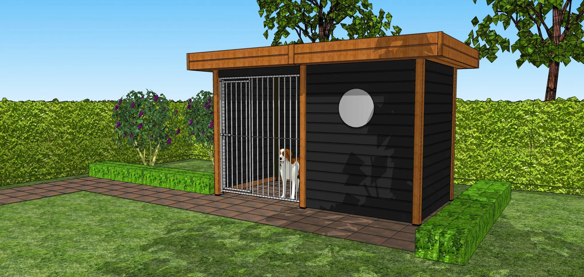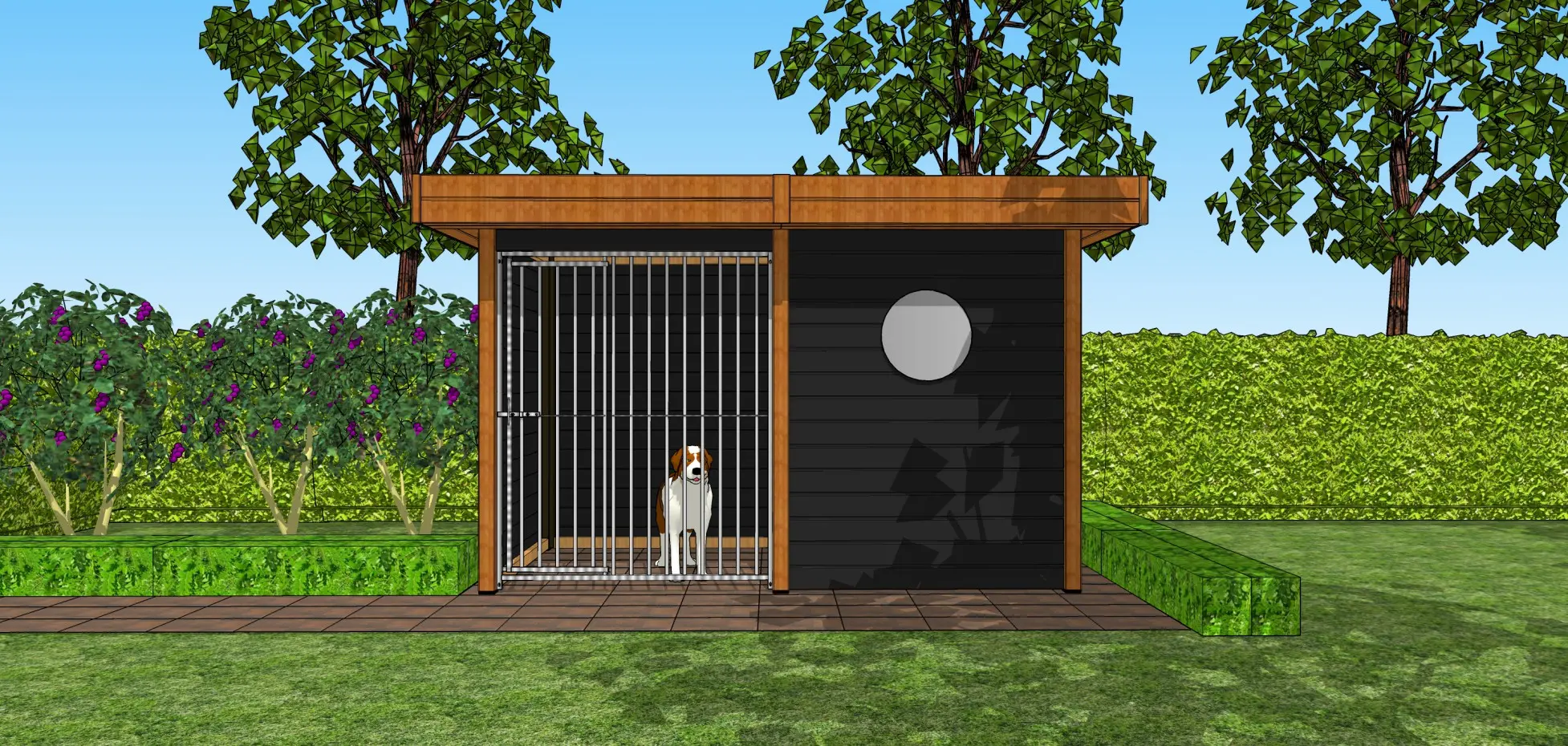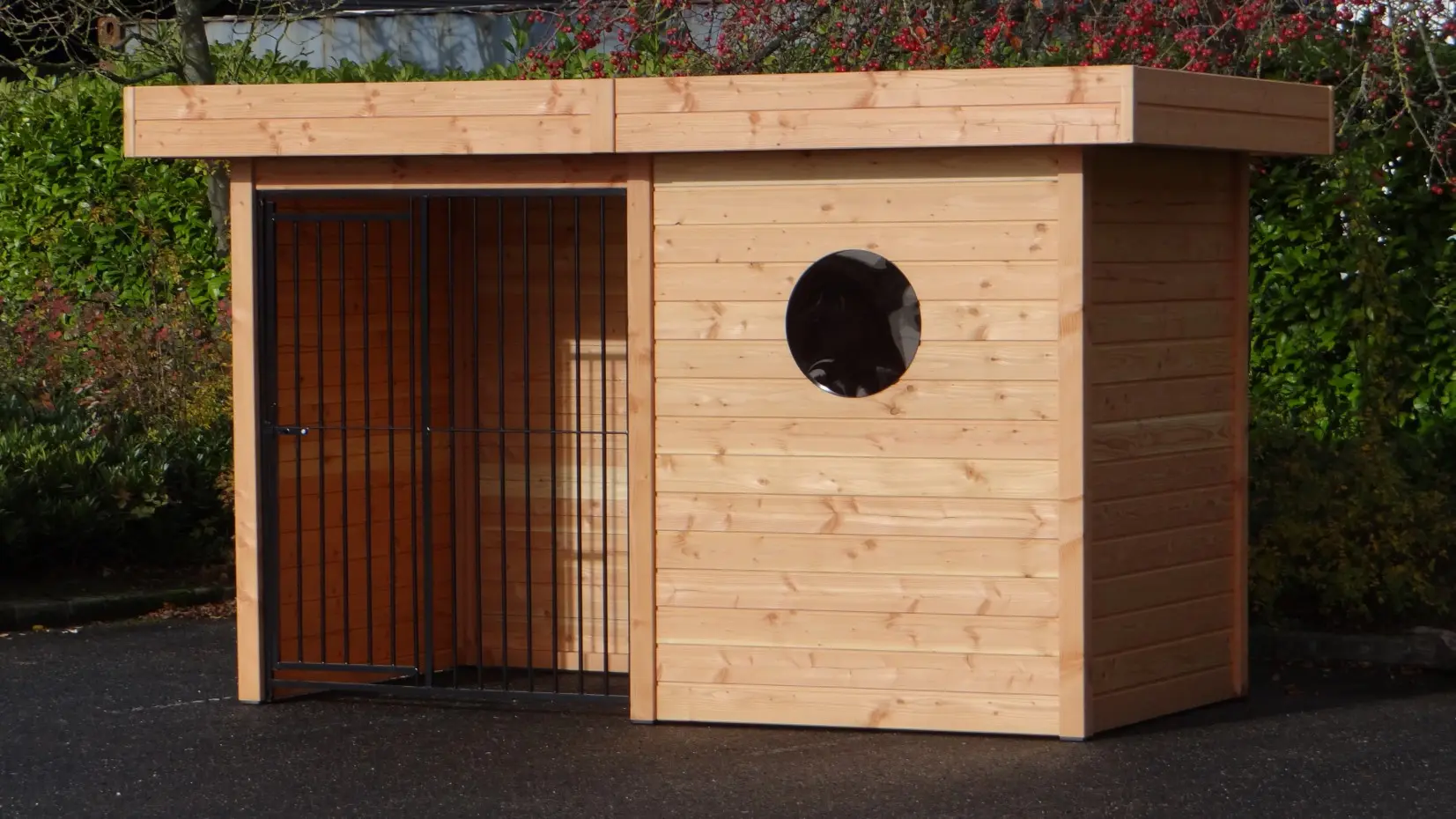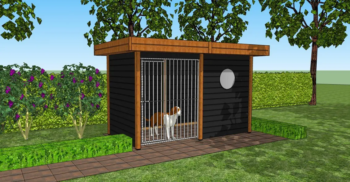 • Hondenkennel van douglashout, een mooi en duurzaam houtsoort dat zelfs onbehandeld geschikt is voor buiten. Wel zal het snel grijs worden, behalve als u het behandelt met beits of douglasolie.